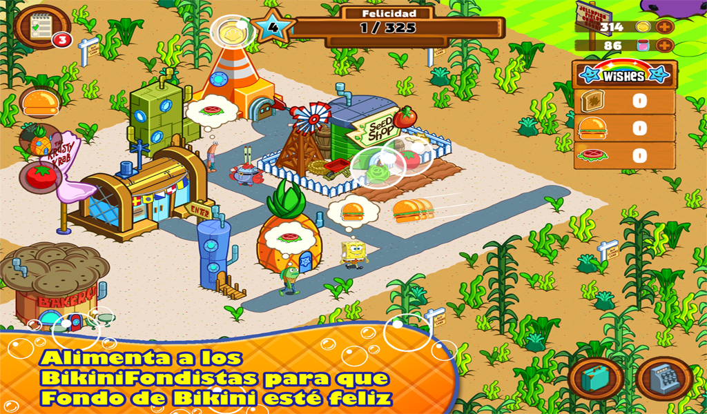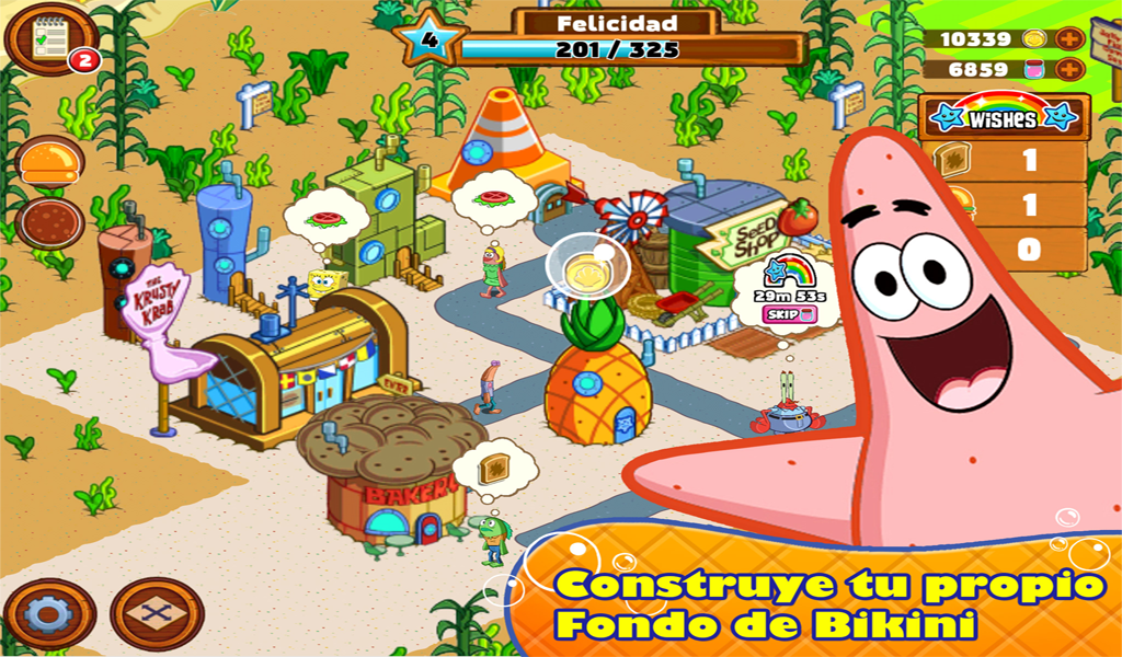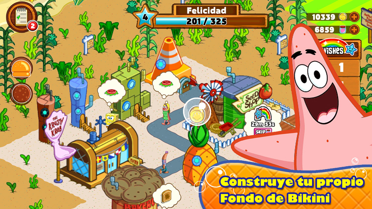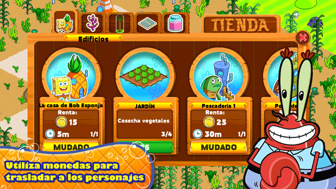 Tendrás que encontrar un trabajo para Bob Esponja y sus amigos, mejorar sus habilidades y evolucionar tu Mega Ciudad a un nivel más alto.