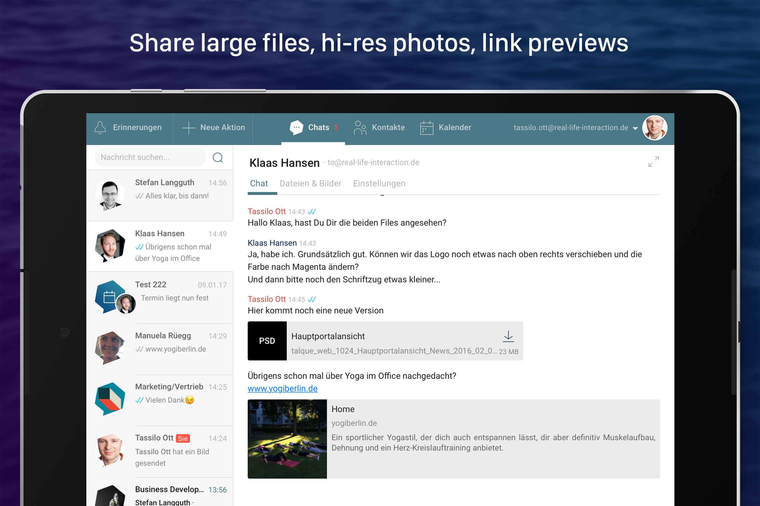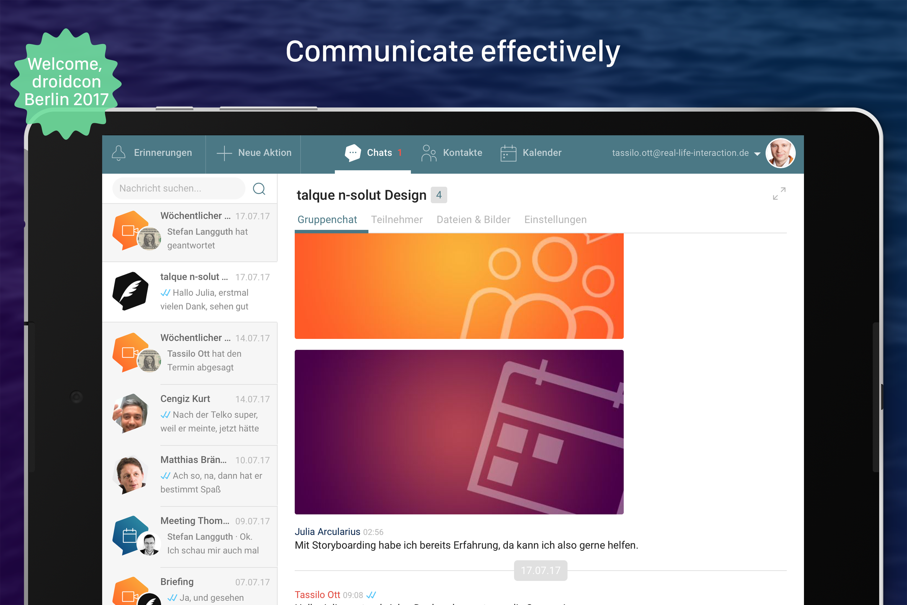 talque reúne toda su comunicación claramente dispuestas en una sola herramienta. Comunicarse con todos sus contactos de forma inmediata a través de chat, enviar imágenes y archivos de gran tamaño, hacer citas (o un sondeo de tiempo fijo) o lugar de video-llamadas, incluso dentro de los equipos.