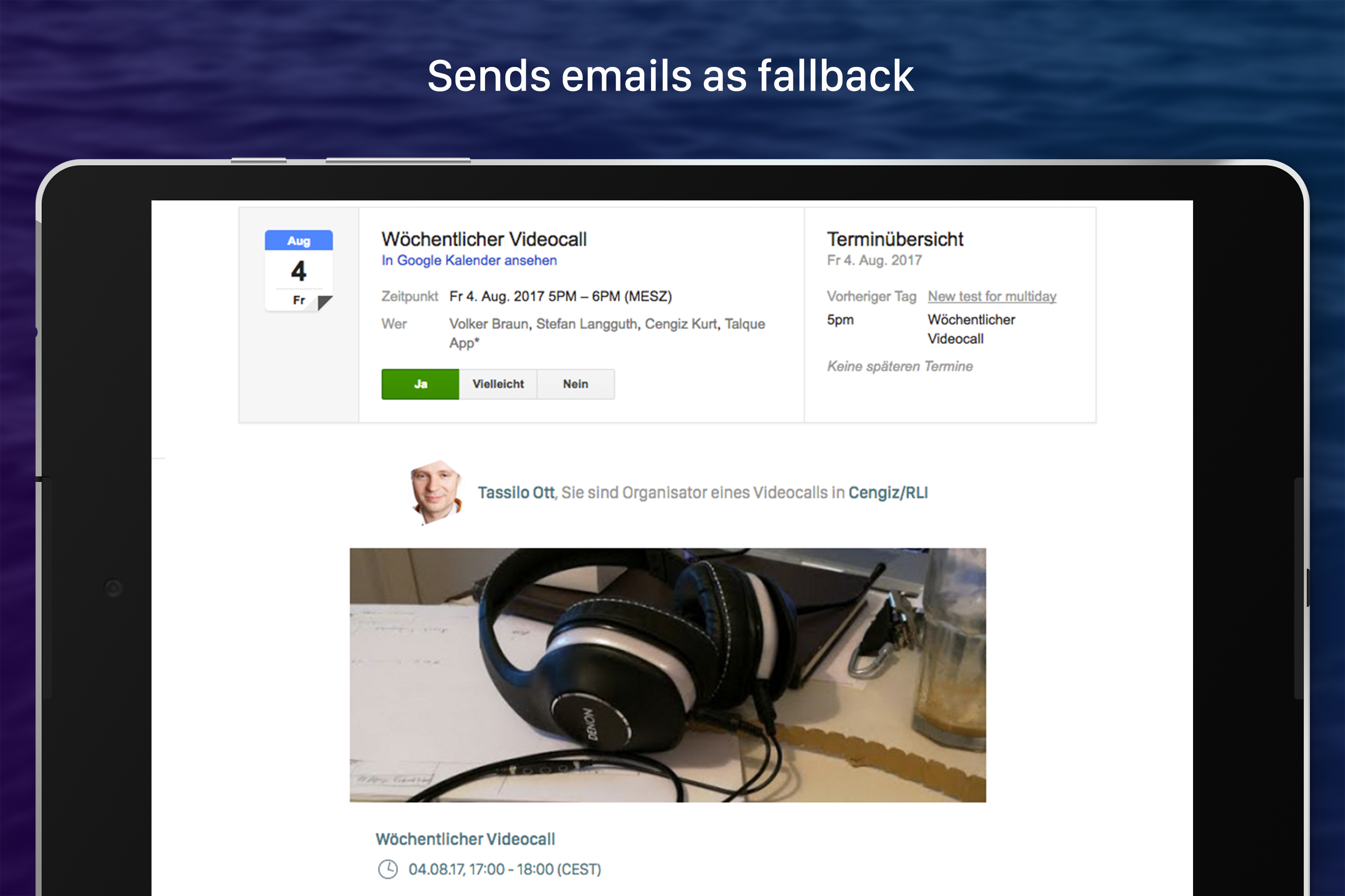 EVENTOS / mesas electorales: Colocación de múltiples sugerencias de tiempo para una cita o vídeo-llamada y dejar que sus socios de diálogo votar por él. Con su lógica de procesamiento, talque se desahoga por completo de recordatorios participantes molestos cuando llegue la fecha límite encuesta, el envío de elementos de calendario finales y notificaciones acerca de los cambios de ubicación. Después de haber enviado sus sugerencias, le den de alta. En caso de que desee cambiar manualmente algo, todavía tiene el control total. Si desea concertar una cita con una sola persona, las cosas se vuelven aún más fácil. Es nada encaja, de inmediato se puede hacer contrasugestiones.