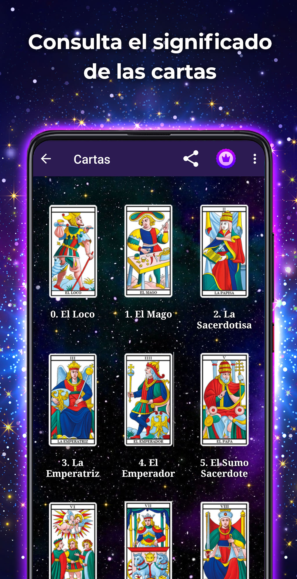 - Accede al significado de todas las cartas. Esto te permitirá utilizar la aplicación como complemento a tiradas con cartas reales o simplemente para aprender.