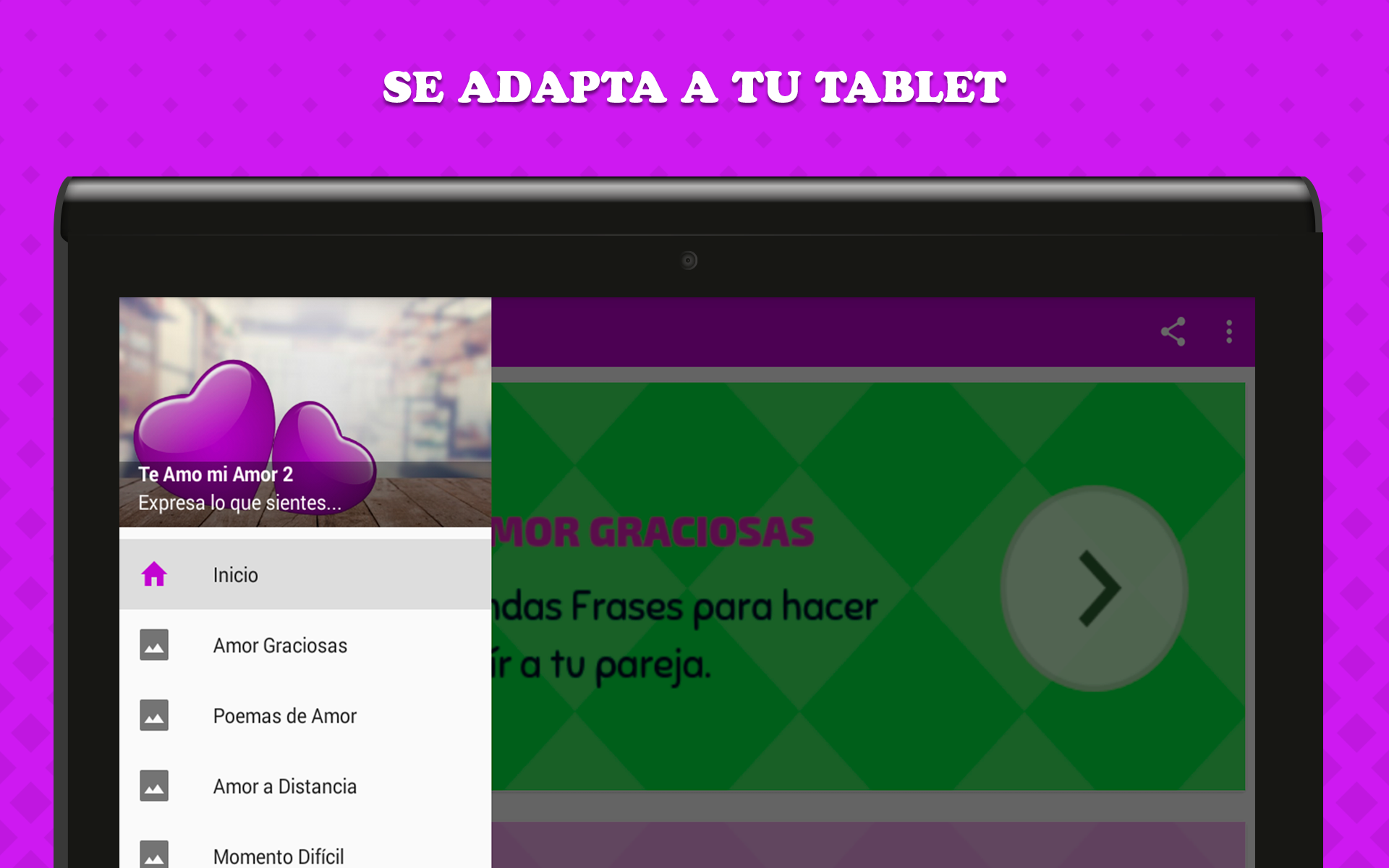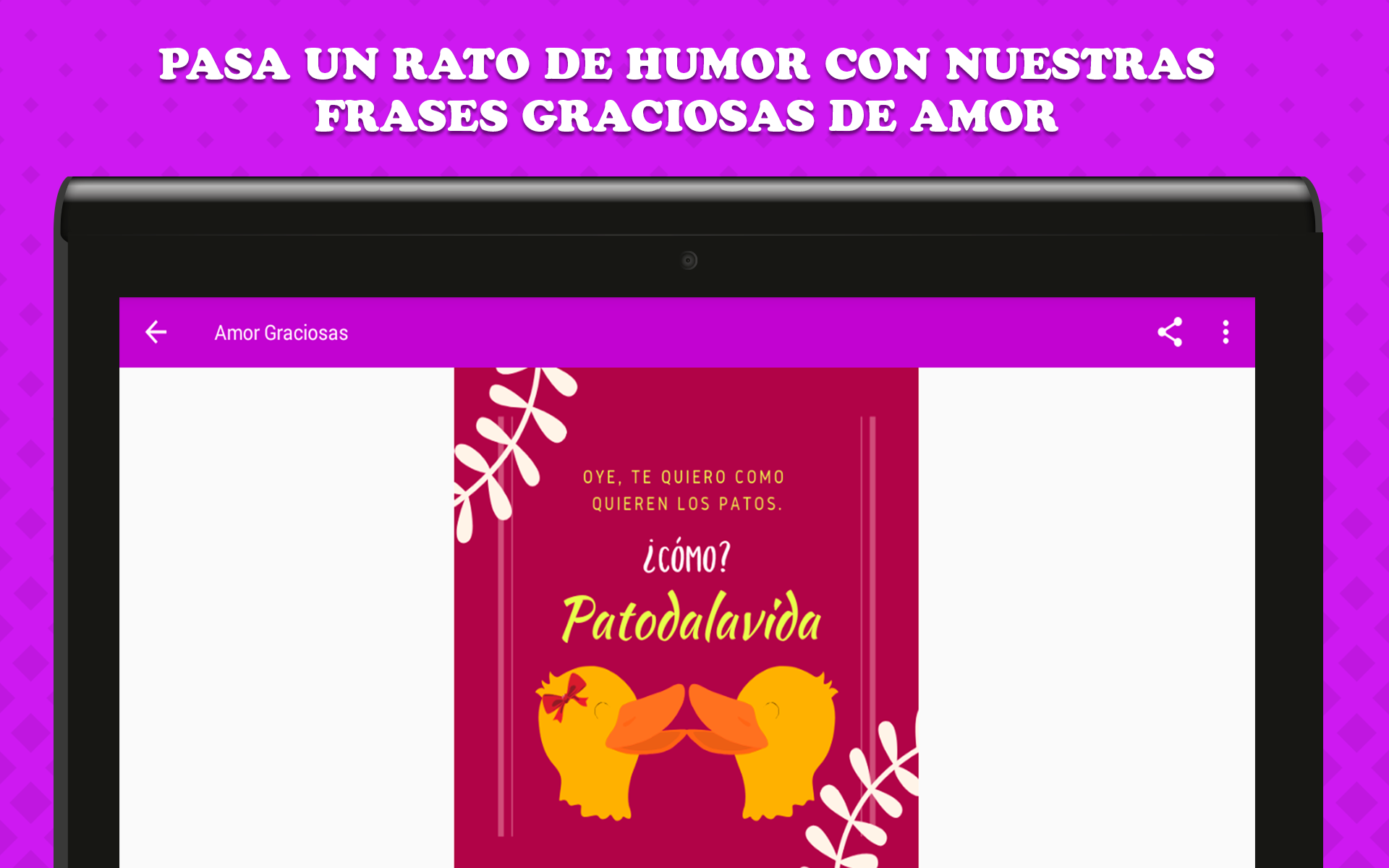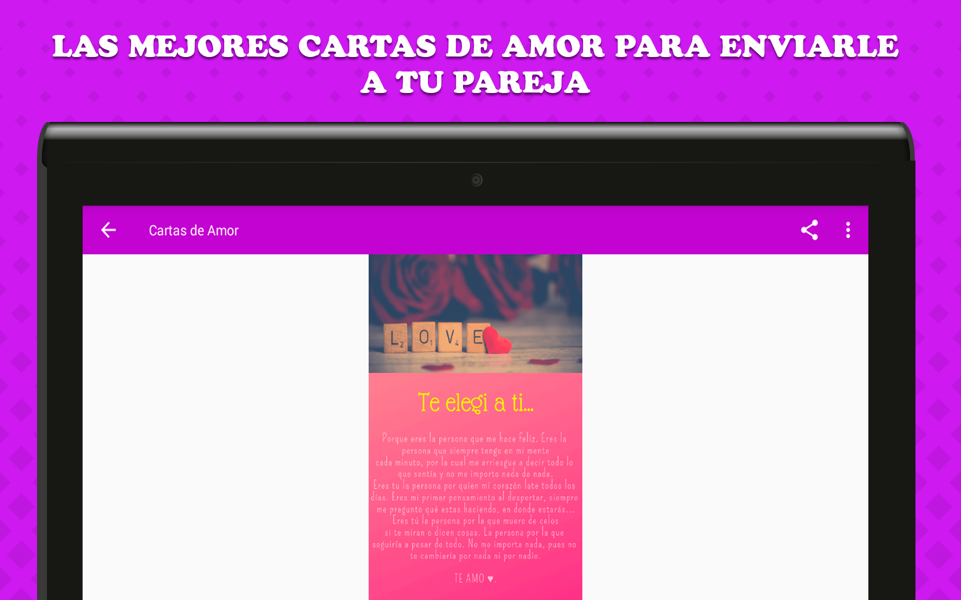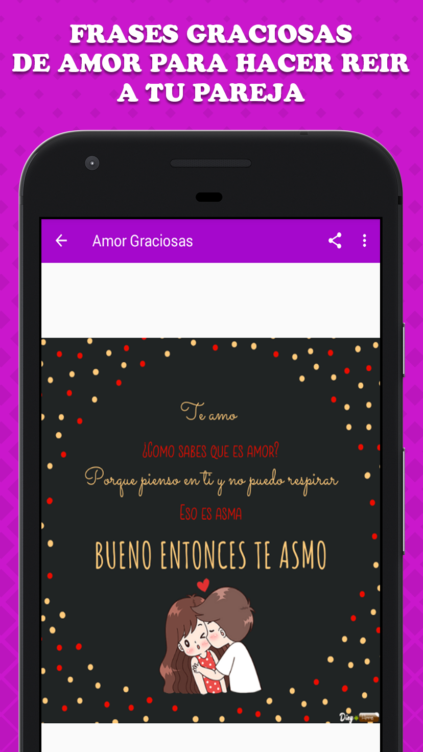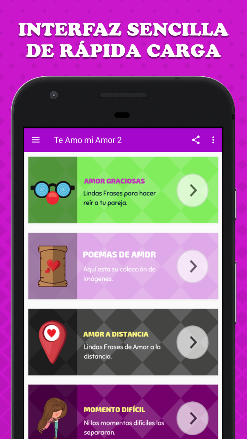 ¿Te gusto Te Amo mi amor? Pues ahora te traemos Te Amo mi Amor 2 💜 para que puedas disfrutas de lindas Frases de Amor Graciosas para que la compartas con tu pareja y le saques una carcajada y pasen un buen rato de humor. Contamos con Hermosos poemas de Amor para que se las puedas dedicar a tu novio o novia, esposo o esposa y así le hagas saber de una forma dulce lo que sientes por él(la). Nuestros Poemas de Amor con Imágenes están hechos desde cero especialmente para ti, para que puedas disfrutar al máximo de nuestras lindas Imágenes con Frases Romanticas 🥰. Contamos con más de 130 Imágenes con Frases de Amor para dedicar a tu pareja que tanto amas, así podrás buscar la frase perfecta para dedicárselo. El amor es un sentimiento maravilloso, pero también puede ser muy triste cuando esa persona que amamos se encuentra lejos de nosotros, es por eso que tenemos para ti las Imágenes de Amor a distancia para que se las puedas enviar a esa personita especial que se encuentra lejos de ti, así le harás saber que ni la distancia podrá separarlos 💏. Tenemos una Interfaz Sencilla y Fácil de usar, para que puedas tener una mejor experiencia, además nuestra App ocupa muy poco espacio, por lo que no necesitaras desinstalarla y cuando la necesites, siempre tendrás Imágenes bellas de Amor a la mano. Como en toda relación, hay momentos buenos y malos, es por esa razón que te traemos Frases de Amor para momentos difíciles, para aclararle a tu pareja, que, a pesar de los problemas, tú siempre estarás con él o ella. Tratamos de darte la mejor experiencia como usuario, es por eso que logramos hacer que a pesar de no estar conectado a una red Wi-Fi, nuestra App siga funcionando sin problema alguno, así podrás ver todas las Imágenes y Frases Romanticas que tenemos para ti sin interrupción alguna 🏆. ¿Sientes ganas de jugar o matar el tiempo con tu Pareja? Tenemos para ti las Preguntas de Amor en español que podrás enviarle a tu pareja y él o ella tendrá que responder, estas preguntas son muy lindas y dulces por lo que esta garantizado que pasaras un lindo rato con tu Pareja mientras Chatean por WhatsApp o cualquier otra Red Social. También contamos con Frases de besos, para que hagas sentir muy especial a tu Pareja cuando alagues sus besos con nuestras lindas frases. Esos besos que te llenan y te hacen sentir muy bien, pues, ¿A quién no le guste recibir un beso de la Persona que tanto ama? Y por último pero no menos Importante, tenemos las Cartas de Amor, lindas y hermosas palabras que salen del corazón, que al leerlas, tu pareja quedara muy feliz y orgulloso(a) de tenerte en su vida 💜.