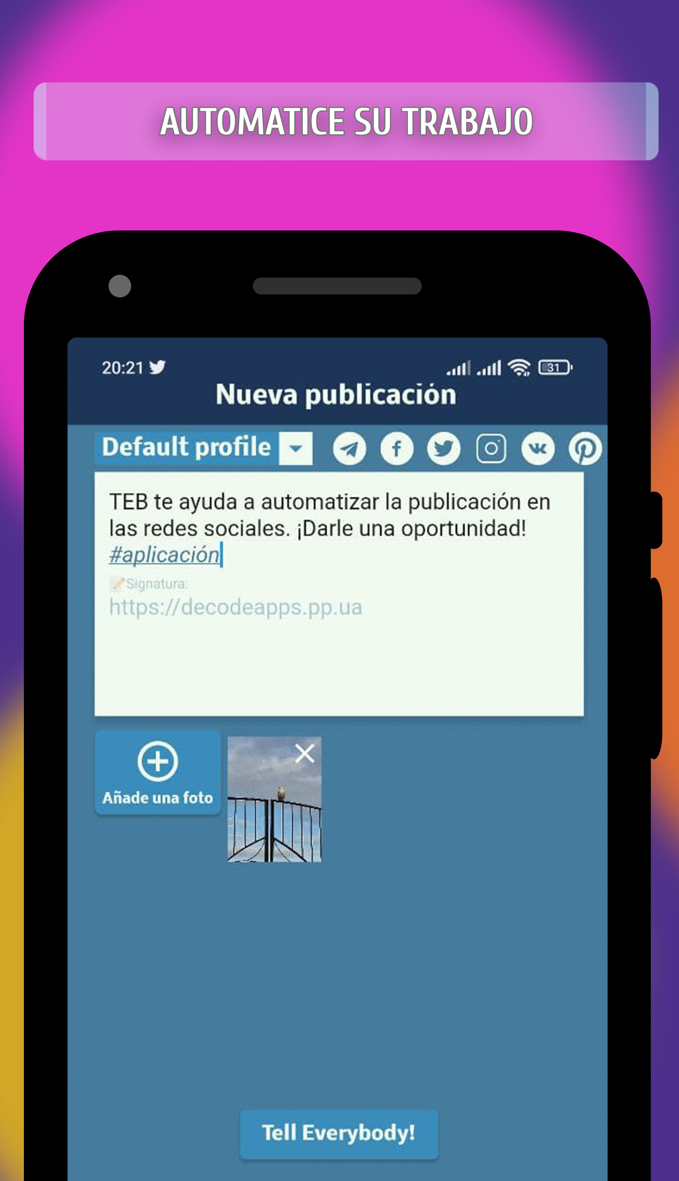 ¿Estás cansado de copiar y pegar tu contenido de una red social a otra? ¿Adjuntar tus imágenes a todas las redes? ¡Entonces TEB es la mejor opción para ti! 💡 ¡Cree las publicaciones con una sola interfaz y publíquelas en todas las redes conectadas! ¡Es así de simple! ¡Con solo unas pocas acciones, puede preparar su publicación con el texto y los gráficos necesarios y publicarla en sus cuentas! ¡No olvide los hashtags, para que pueda involucrar a más personas, porque TEB lo ayuda a resaltar los hashtags! ⚫Incluye redes como Telegram, Facebook, Twitter, VK, Instagram, Pinterest 🎈 ⚫ Admite múltiples perfiles, por lo que puede almacenar varias cuentas para una red 📒 ⚫ Puede publicar imágenes junto con las publicaciones 🖼️ ⚫ Los tokens y los datos confidenciales se encuentran en su dispositivo, por lo que es fácil eliminar los datos de la aplicación 🔐 ⚫ Soporte de tematización 🎨 ⚫ Editor de imágenes incorporado 🖌️