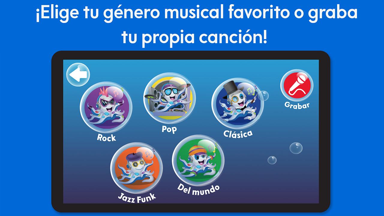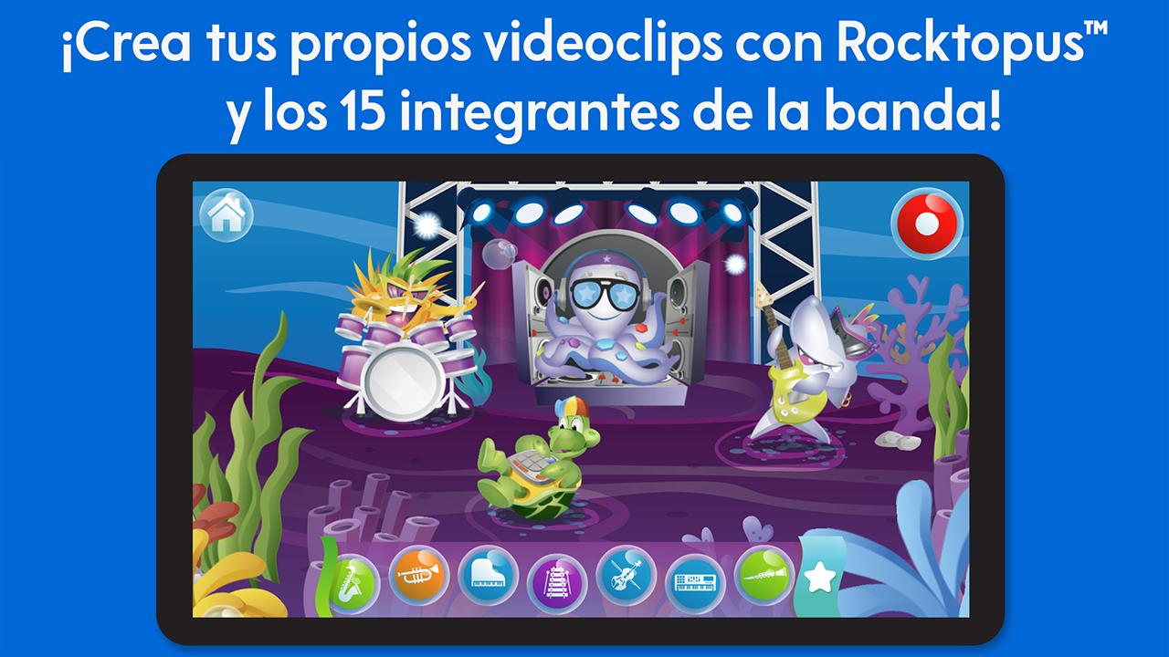 ¡Piensa y aprende mientras haces videoclips con Rocktopus! ¡Sumérgete en la diversión con Rocktopus y su banda mientras creas videoclips bajo el mar! Con 90 datos animados sobre instrumentos musicales, ¡el aprendizaje y el juego nunca terminan! ¡Toca para seleccionar el lugar donde tocarás y luego escoge una canción o graba una! ¡Arrastra a los integrantes de la banda para que toquen y personaliza tu video con selfis, voz y efectos especiales! Características - 4 lugares bajo el mar (Caleta de coral, El caracolero, El tablón del capitán, Sala del fondo del mar) - 5 géneros musicales (Rock, Jazz Funk, Clásica, Pop, Del mundo), ¡incluyen canciones del juguete! - 15 instrumentos (guitarra, bajo, batería, piano, trompeta, saxofón, violín, xilófono, clarinete, teclado, batería electrónica, cencerro, congas, tambor metálico, maracas)" - ¡18 integrantes acuáticos de la banda, además de 6 versiones temáticas de Rocktopus! - 90 datos curiosos sobre instrumentos, con ilustraciones animadas ¡Galería de grandes éxitos para guardar y exportar tus videoclips! Canciones, instrumentos y temas del juguete Think & Learn Rocktopus™ STEAM de Fisher Price" Aprendizaje y contenido curricular Instrumentos, datos y conocimiento musical: cuando los niños tocan las burbujas mientras juegan, escucharán divertidos datos musicales y aprenderán cosas interesantes sobre los diferentes instrumentos musicales en la aplicación. Creatividad e imaginación: Esta aplicación motiva a los niños a ser creativos mientras diseñan sus propios videoclips y los reproducen. ¡Incluso pueden incluir su "selfi", al tiempo que imaginan todas las posibles facetas de su increíble banda de música! Para más información acerca de Rocktopus™ y la línea de juguetes y aplicaciones Fisher-Price® Think & Learn, visita: http://fisher-price.com/thinkandlearn