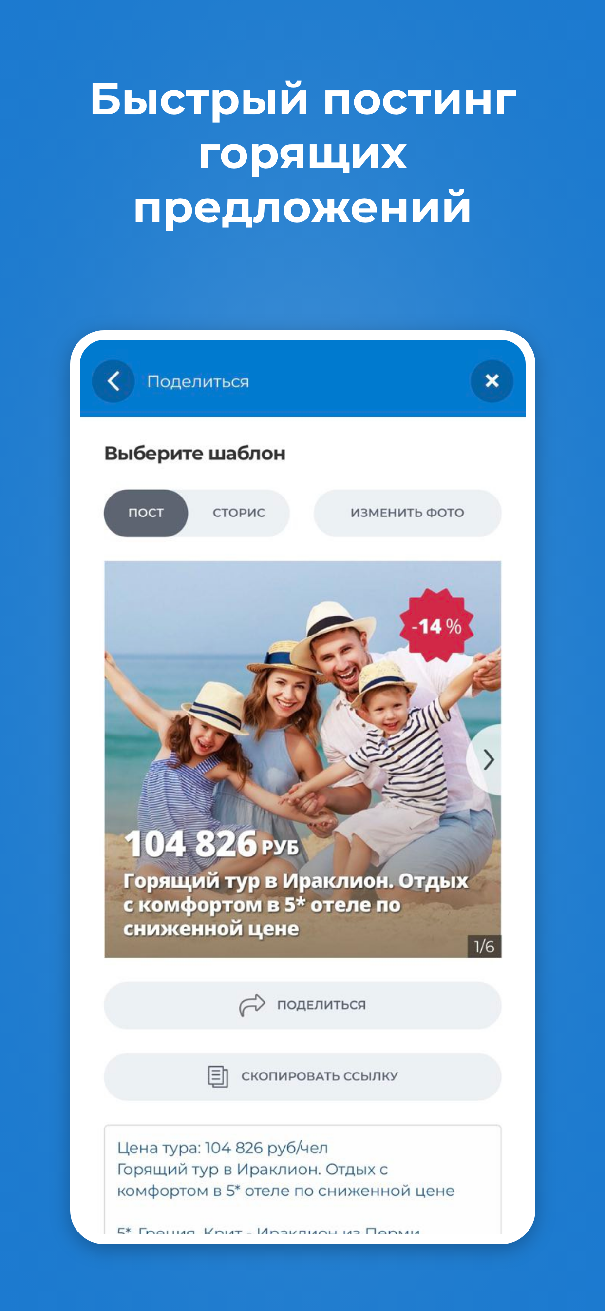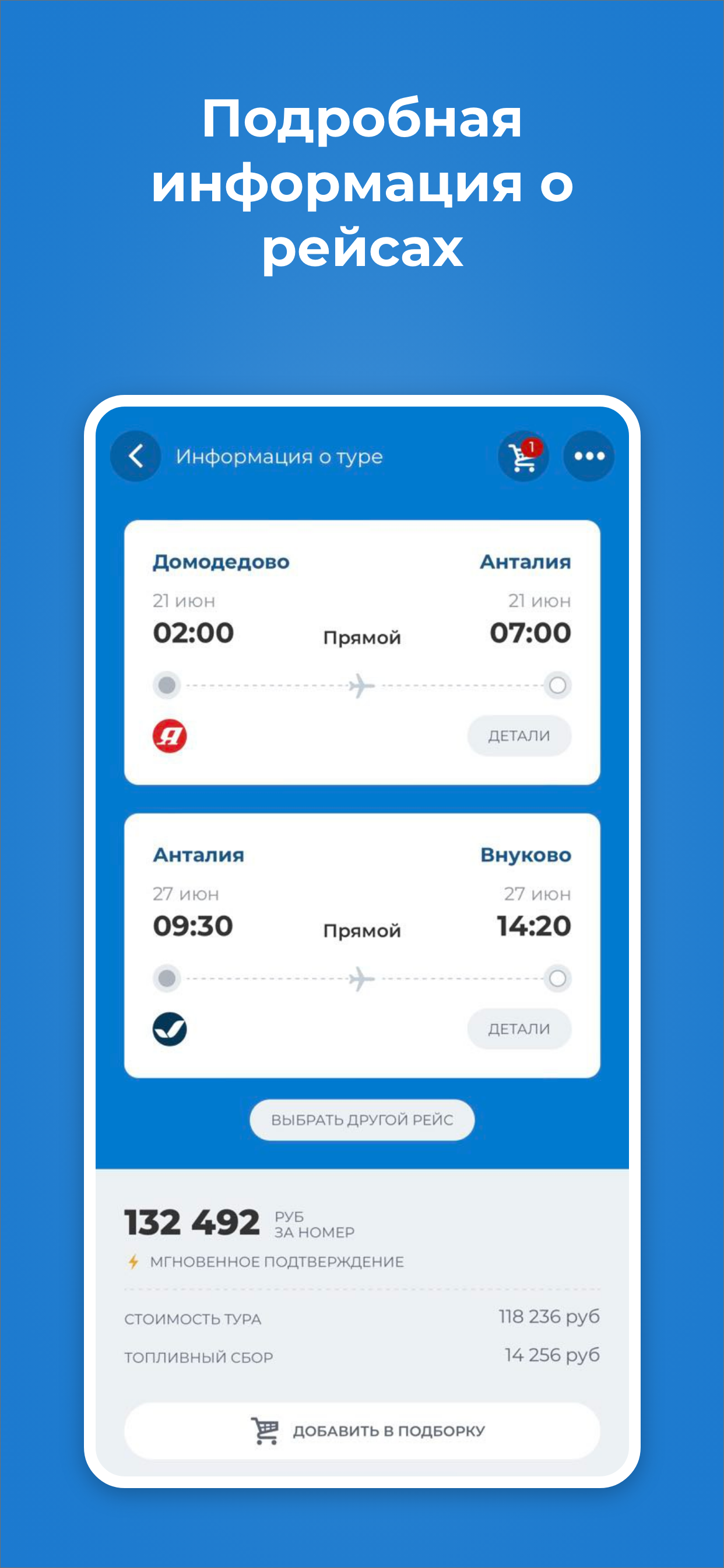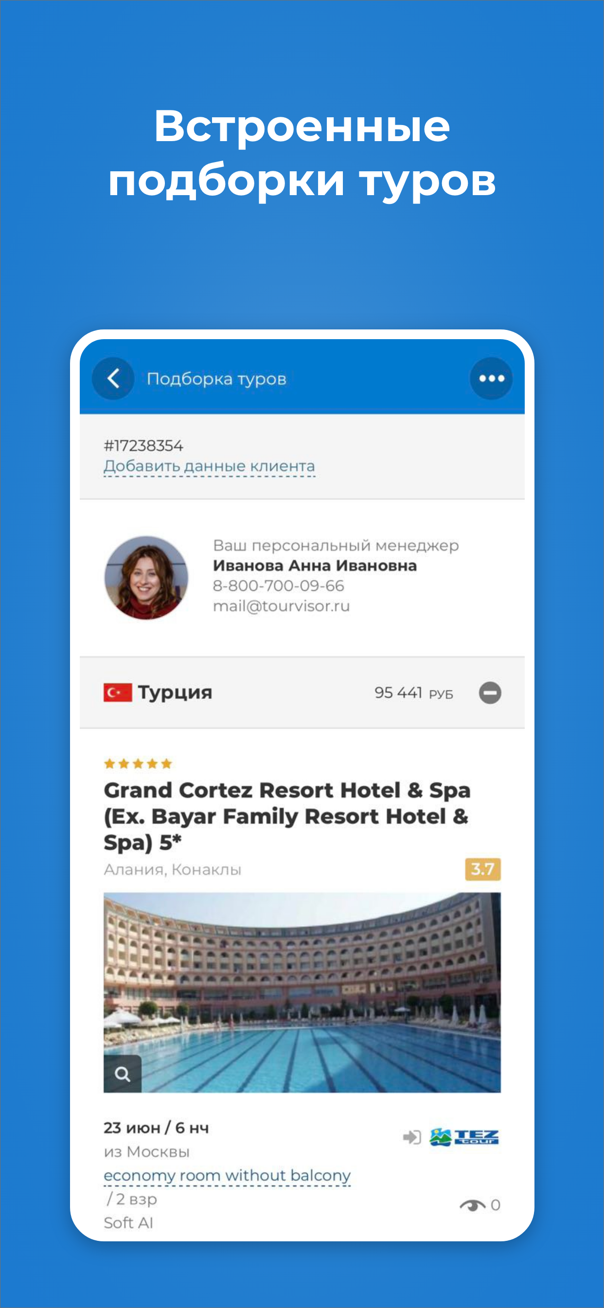 Una aplicación móvil gratuita para encontrar tours y hoteles del principal motor de búsqueda ruso Tourvisor. Es utilizado con éxito tanto por turistas como por agentes de viajes, te permite comparar ofertas en menos de un minuto, navegar a los precios más bajos y elegir la mejor opción para tus vacaciones. Es suficiente agregar la ciudad de salida en el formulario de búsqueda si elige un recorrido al que desea ir (país, resort o ciudad), fechas, duración del descanso, composición de los turistas y haga clic en el botón "Buscar". La aplicación incluye recorridos de más de 90 operadores turísticos y más de 100 mil hoteles y posadas. Al elegir una ciudad de salida, el usuario tiene acceso al aeropuerto de llegada deseado, y el calendario le indicará el horario y el costo promedio por persona. Miles de turistas ya utilizan la aplicación cuando eligen tours que parten de Moscú, San Petersburgo, Kazan, Nizhny Novgorod, Ekaterimburgo, Perm, Novosibirsk, Krasnoyarsk, Chelyabinsk, Samara, Ufa, Rostov-on-Don, Krasnodar, Voronezh, Volgograd , Sochi y otras ciudades rusas, así como cuando salen de sus ciudades de Kazajstán y Bielorrusia. Si el usuario está buscando un hotel u hotel en concreto y quiere reservarlo, tras comparar el coste del alojamiento con diferentes proveedores para no pagar de más, la aplicación permite encontrar el precio mínimo de la habitación seleccionada. Gracias a una combinación de ofertas de operadores turísticos y servicios de reserva líderes, los ahorros para un turista pueden alcanzar alrededor del 50%. El sistema agrega y rastrea los precios no solo de los hoteles, sino también de los tours. Por lo tanto, los turistas podrán encontrar tours de última hora y al mismo tiempo ver el porcentaje de descuento, por lo que puede comprar un tour y ahorrar mucho. Puede comprar un boleto en línea o reservar un hotel que desee a través de nuestros socios: agencias de viajes y operadores turísticos representados en el sistema. Y el servicio "Dónde comprar" hará que la elección de una agencia de viajes sea aún más conveniente para un turista y mostrará las ubicaciones de todos los socios en el mapa. Funciones de búsqueda Turvisor: - precios con todos los recargos y tarifas que son inmediatamente visibles - una enorme base de datos de ofertas de los principales operadores turísticos con salidas desde diferentes regiones - búsqueda separada y comparación de precios de hoteles, tours con vuelos, tours de última hora y precios mínimos - la capacidad de crear cualquier colección y compartirla en mensajería instantánea y redes sociales - resultados rápidos, un formulario de búsqueda conveniente y filtros claros para diferentes solicitudes de turistas - falta de publicidad e imposición de servicios, los propios usuarios eligen donde les es más conveniente comprar o consultar - información completa sobre las instalaciones de alojamiento y las ventajas de los hoteles u hoteles + calificaciones Tourvisor es un socio confiable entre más de 7500 agentes de viajes desde Vladivostok hasta Kaliningrado, Kazajstán y Bielorrusia, operadores turísticos líderes en Rusia y la CEI y servicios clave de reserva de hoteles, y ayuda a los clientes a aumentar las ventas y la lealtad de los turistas todos los días. Entre nuestros socios: Anex Tour (Anex tour), Biblio Globus, Coral Travel (Coral Travel), Sunmar (Sanmar), Pegas Touristik (Pegas Touristik), Tez Tour (Tez Tour), FUN & SUN (Fun & Sun), Intourist (Intourist), Alean, Ostrovok.ru (Isla), Bronevik.com (Vehículo blindado) y muchos otros. Características adicionales que están disponibles para los agentes de viajes en la aplicación después de la autorización: - crear hermosas selecciones de marca para turistas con actualizaciones de precios - fuente de tours populares - base de datos profesional de los últimos tours calientes para agencias de viajes - suscripción a último minuto: la capacidad de suscribirse a notificaciones en nuestro bot de Telegram de acuerdo con los parámetros especificados para ser el primero en recibir información sobre nuevos recorridos - reenvío rápido - puede publicar una publicación en una red social con solo un par de clics, para esto creamos un generador de imágenes y textos para cada oración - acceso al administrador principal para el trabajo continuo con los turistas ¡Descarga la aplicación Tourvisor, únete a miles de otros usuarios felices y experimenta por ti mismo la comodidad de elegir y comprar un tour u hotel al mejor precio!