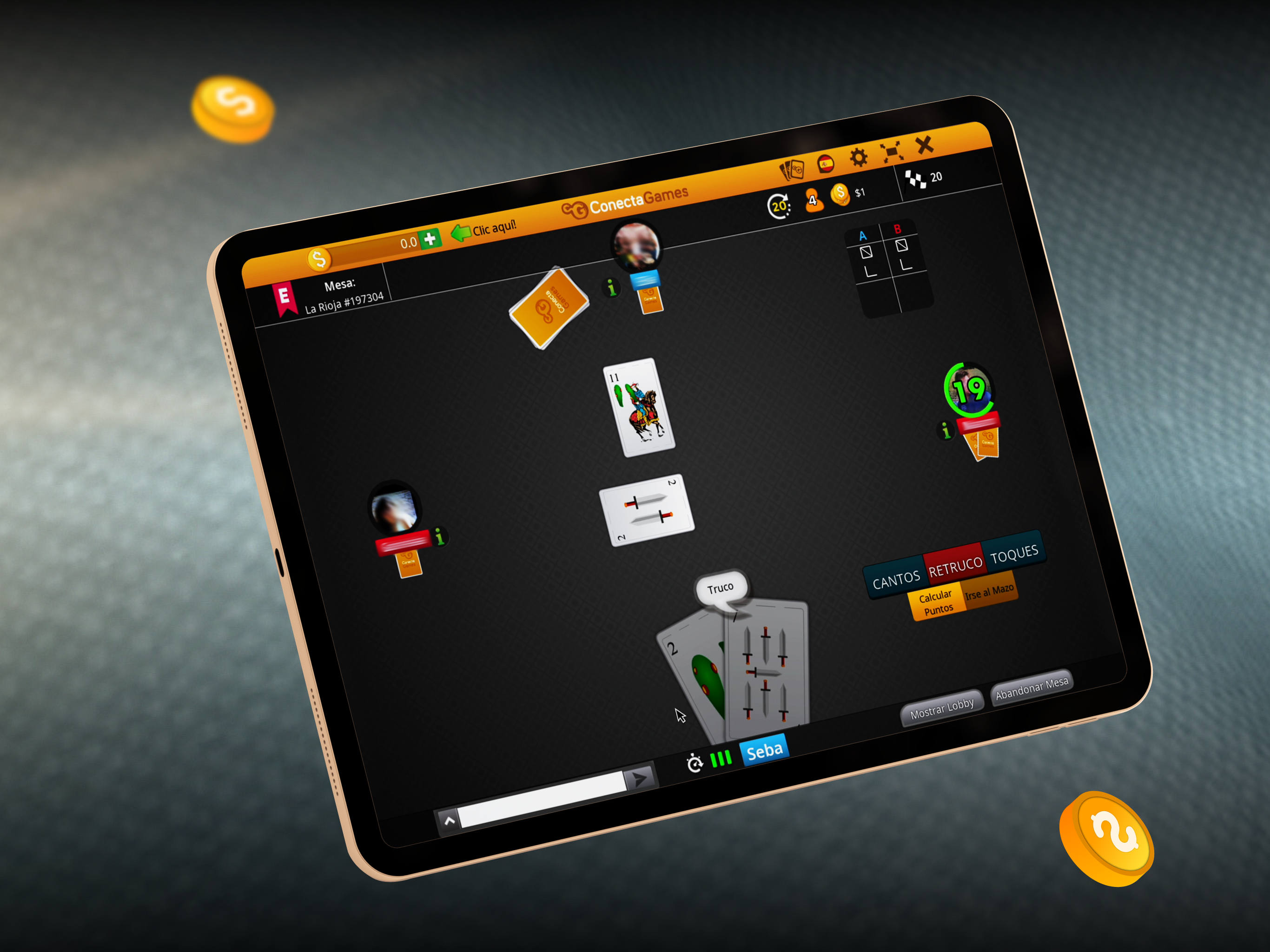 El objetivo es ser el primero en alcanzar un número de puntos, que pueden ser 10, 20, 30 o 40. Se puede jugar un mano a mano (1 contra 1), o jugá en equipo, de a dos o tres jugadores (4 o 6 jugadores en total). Para la modalidad con 6 jugadores se puede elegir si jugar pico a pico o no. Cada jugador recibe 3 cartas. Quien tira la carta más alta gana la baza, el mejor de tres gana la ronda (mano) y los puntos que esta valga dependiendo de los cantos, toques o gritos que se hayan acordado. • Cantos: Flor, Contraflor, Contraflor al Resto. Toques: Envido, Real Envido, Falta Envido. Gritos: Truco, Retruco, Vale 4. Valor de las cartas (de menor a mayor): • Comunes: 4, 5, 6, 7. • Cartas Negras: 10, 11, 12. • Cartas Bravas: 1, 2, 3, 7 de oros, 7 de espadas, 1 de bastos, 1 de espadas. • Valor de las cartas para el envido o la flor: las cartas valen lo que su número indica, a excepción del 10, 11 y 12 que valen cero. Con 2 cartas del mismo palo, se suman 20 puntos. Podés mirar las cartas de tu compañero pulsando en sus cartas, como alternativa a hacer las señas del truco. ¡Elegí si jugar con flor o no! ¡Este truco online te permite jugar en cualquier momento, con solo rotar tu teléfono móvil o tableta podés disfrutar del juego en vertical u horizontal! Puedes encontrar más información en nuestra página de Facebook: https://www.facebook.com/jugartrucoargentino