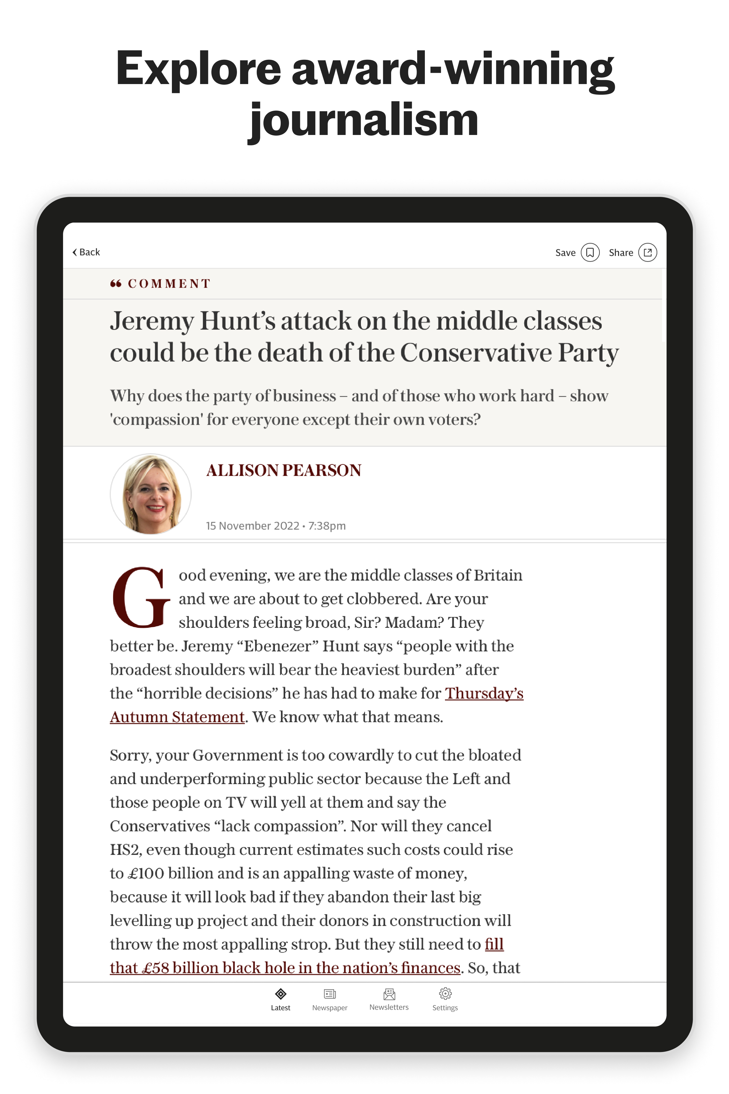 Descargue la aplicación Telegraph para seguir los últimos titulares de noticias nacionales y mundiales y lea el periódico digital diario, todo en su teléfono o tableta. Desde temas globales cruciales hasta las últimas noticias del Reino Unido, explore la gama completa de artículos informativos y esclarecedores de The Telegraph sobre política, negocios, finanzas, deportes, tecnología y más. LEE EL PERIÓDICO TELEGRAPH EN LÍNEA EN TU TELÉFONO O TABLETA Lea la versión digital de los periódicos británicos Daily y Sunday Telegraph y hojee los periódicos de cabo a rabo, sin importar adónde le lleve el día. Disfrute cada edición desde las 5 am todos los días, con todas sus secciones, suplementos y revistas favoritas, incluidas Stella y The Telegraph Magazine. Nuestro periodismo cubre una variedad de temas globales y artículos de noticias. Asegúrese de estar perfectamente informado sobre las últimas noticias mundiales, noticias de EE. UU. y eventos actuales del Reino Unido, incluidos artículos sobre: • Política • Finanzas, economía, noticias de negocios y acciones • Deporte, incluyendo fútbol, noticias de cricket • Educación • Familia y salud • Tecnología • Arte y Cultura • Noticias de viaje Descargue el periódico para leer en línea o fuera de línea, y manténgase informado de manera experta dondequiera que esté. Ya sea que viaje al trabajo, necesite reflexionar durante el almuerzo o simplemente se esté relajando en casa, siempre podrá recurrir a nuestra visión esclarecedora, análisis en profundidad y comentarios incisivos, además de nuestro prestigioso crucigrama. rompecabezas SIGA LAS ÚLTIMAS NOTICIAS No te pierdas las historias que están dando forma a nuestro mundo, con actualizaciones de noticias en vivo a medida que se desarrollan. Visite la sección "Últimas" y encontrará los principales titulares de noticias para mantenerse informado sobre las noticias británicas de hoy, así como noticias y desarrollos mundiales más amplios. • Noticias del Reino Unido: sea el primero en la fila para conocer las últimas noticias nacionales y los principales titulares del Reino Unido, presentados por periodistas británicos de confianza. • Noticias mundiales: lea los principales artículos de noticias internacionales actuales • Noticias de Europa: acceda a las noticias de hoy de toda Europa LEER BOLETINES EXCLUSIVOS PARA SUSCRIPTORES Explore aún más información de sus periodistas favoritos en sus últimos boletines exclusivos para suscriptores, todo dentro de la aplicación. Sus boletines elegidos aparecerán tan pronto como se publiquen, para que pueda disfrutarlos sin tener que buscar en su bandeja de entrada de correo electrónico. Los boletines de la aplicación incluyen el boletín semanal de Matt, con todas sus caricaturas de la semana y una caricatura extra semanal exclusiva. También encontrará boletines como Your Royal Appointment, Investor y Beyond Brexit Bulletin, todos disponibles para leer directamente en su aplicación. EXPLORA NUESTRAS CARACTERÍSTICAS Y CONTENIDO ADICIONAL Además de noticias de última hora y el periódico nacional diario, también encontrará cobertura de estilo y vida de primer nivel: • Navegue por nuestras revistas en línea, incluidas Stella y The Telegraph UK Magazine, que le brindan textos que invitan a la reflexión junto con los últimos artículos de noticias en línea sobre comida, moda y noticias de celebridades. • Renueva tu plan de comidas habitual y prueba algo diferente con recetas inspiradoras de nuestro libro de cocina. Desde recetas rápidas y fáciles para comenzar la semana hasta comidas especiales para cualquier ocasión, lo tenemos cubierto. • Tómese un descanso y sumérjase en uno o dos rompecabezas. Ya sea que sea un fanático del sudoku o disfrute del crucigrama diario, seguramente encontrará algo que se adapte a sus gustos en la revista The Telegraph. DISFRUTA DE LAS NOTICIAS QUE FUNCIONAN A TU ALREDEDOR Los artículos del periódico Telegraph están organizados por secciones y temas familiares, lo que hace que sea más fácil que nunca leer noticias detalladas que le interesen. Dé su opinión y exprese su opinión a través del canal de redes sociales de su elección, utilizando el botón para compartir. Acceda a las últimas noticias mundiales explorando los titulares que son importantes para usted, con temas que van desde la política del Reino Unido hasta Europa, Brexit, eventos actuales a nivel nacional y todo lo demás. Descargue la aplicación Telegraph ahora y disfrute del periodismo galardonado de uno de los periódicos y revistas más establecidos del Reino Unido.