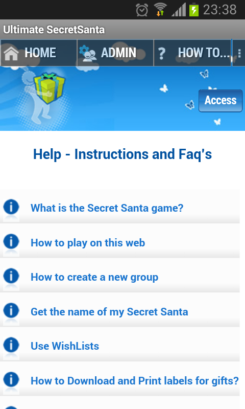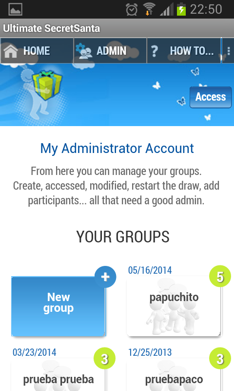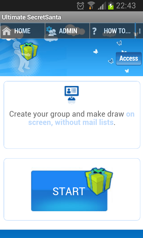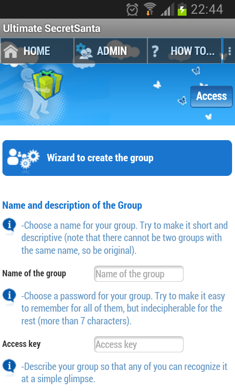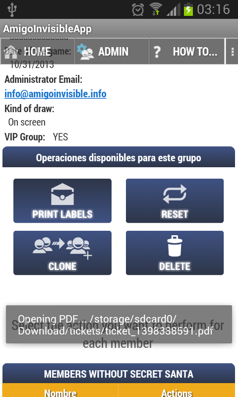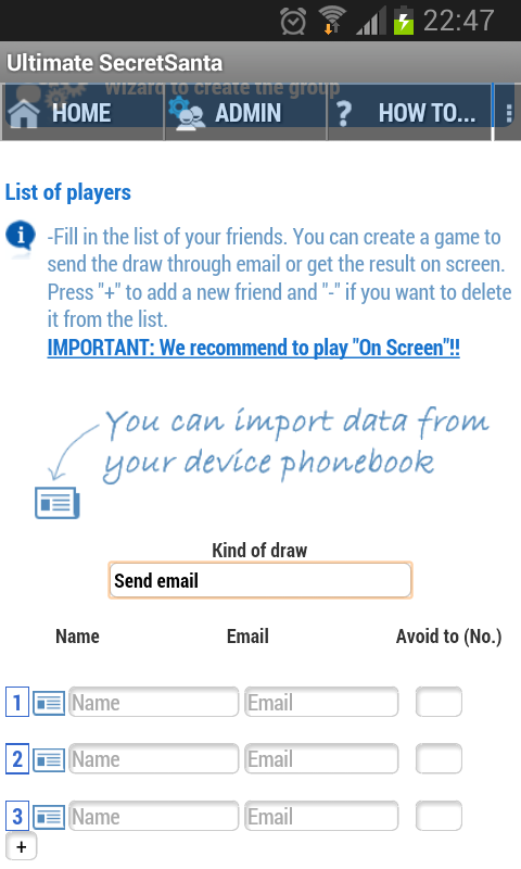 • No es necesario que el resto del grupo tenga instalada esta App para participar ni que disponga de dirección de Email para poder ver el resultado del sorteo. El grupo es accesible a través de web, web móvil y esta app. Todas las funciones están libremente disponibles en/desde esta App. Ten en cuenta, de todos modos, que para participantes web algunas funciones están restringidas sólo para grupos VIP (juego en pantalla/WhatsApp, corrección de emails, lista de regalos e impresión de etiquetas,recordatorios).