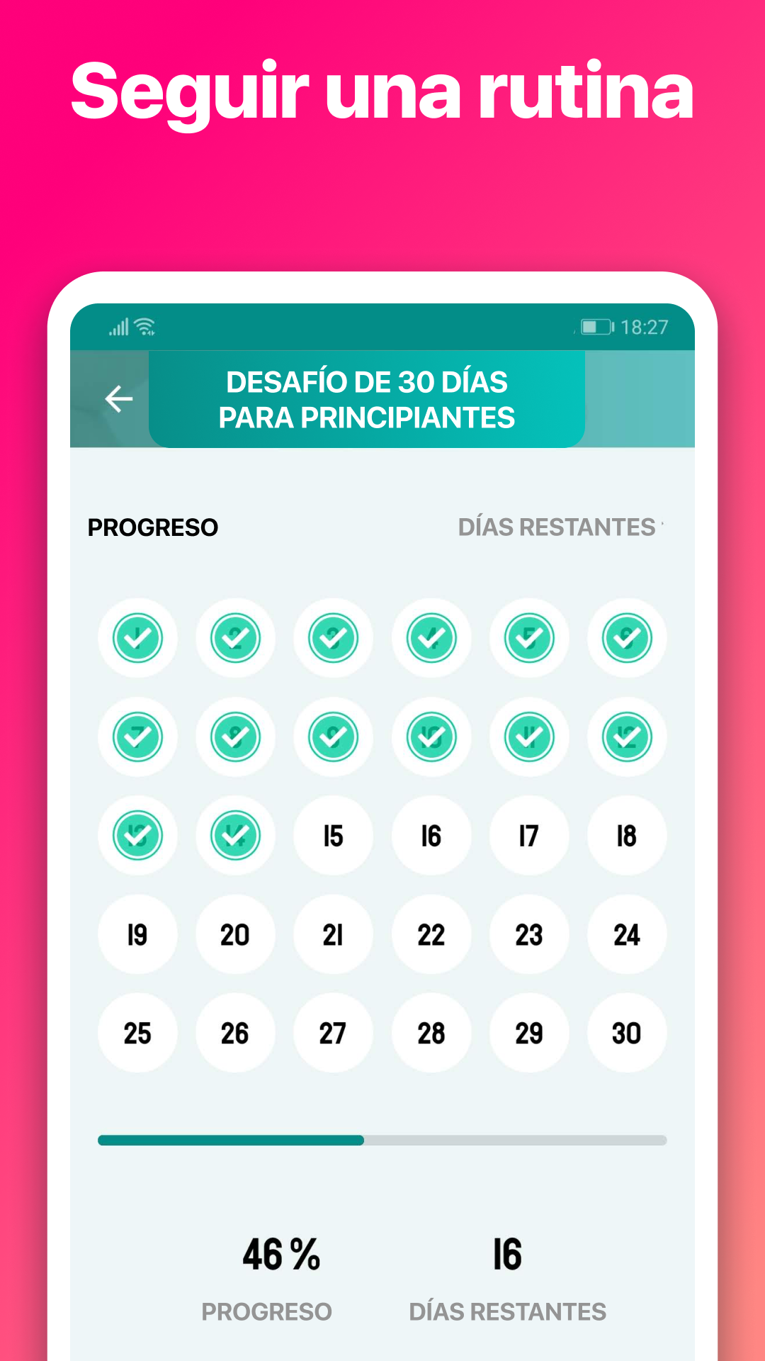 Desafíos de 30 díasNuestros desafíos de 30 días lo guiarán a su meta en 4 semanas y ofrecen 3 niveles de dificultad diferentes. Los entrenamientos se vuelven un poco más difíciles cada día, por lo que al final del desafío, podrá comenzar un nuevo desafío con un nivel de dificultad más alto.