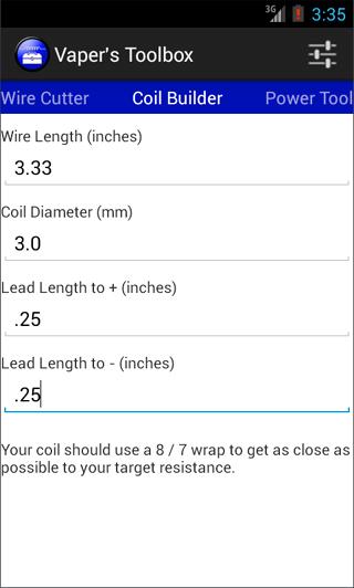 1. Wire Cutter helps you calculate how long each piece of coil wire needs to be to achieve the proper resistance. Supports single, dual, triple, and quad coil design. Wire types supported are Kanthal (A-1, A, and D), Nichrome (60 and 80), SS (304, 316, 316L), NI200, and T1 as well as Kanthal A-1 Ribbon wire. It can also display calculated lengths in inches, cm, mm, and even fractional inches (4 3/16).