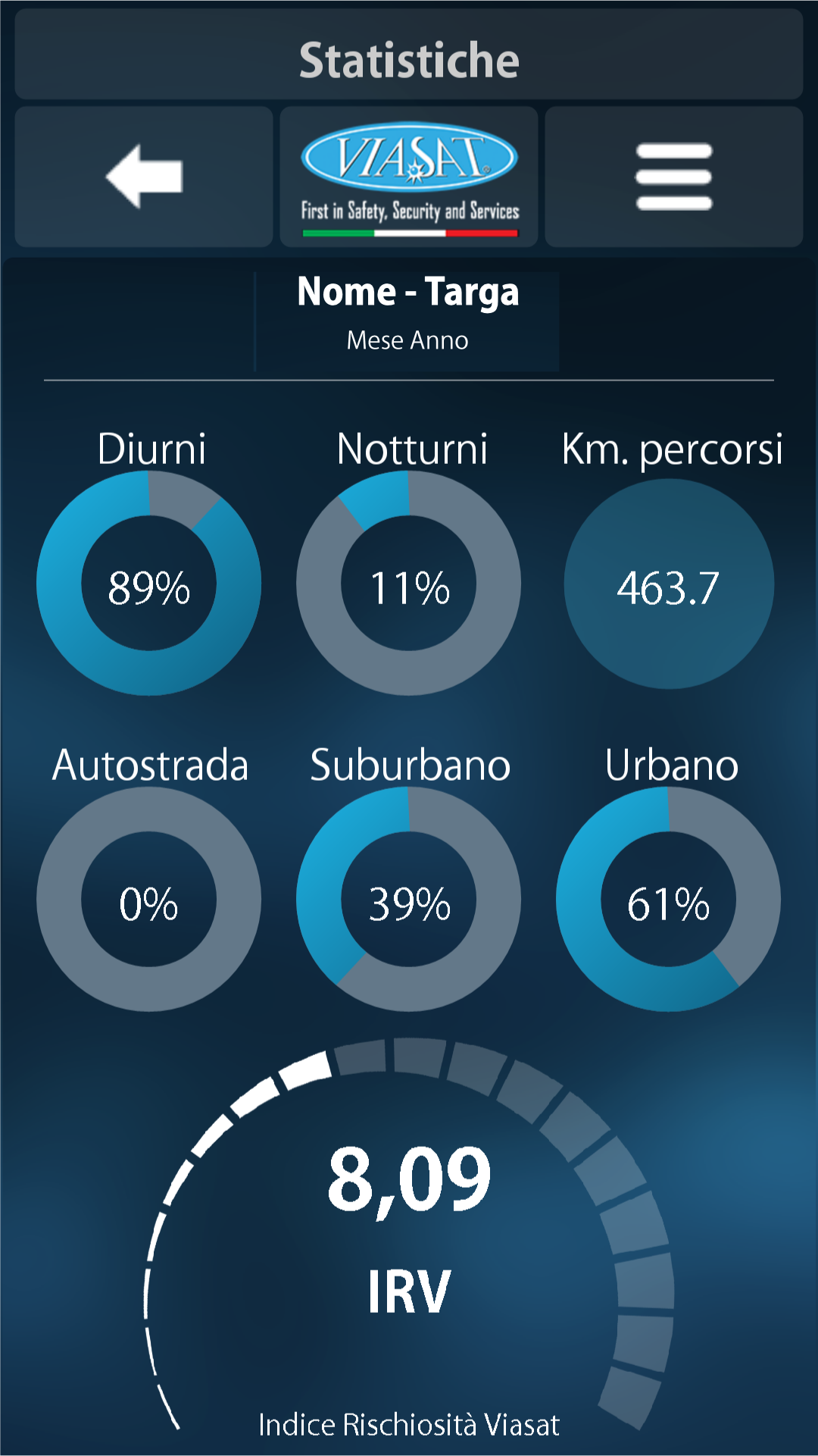 Estadísticas: le permite ver, mes a mes, los kilómetros recorridos, las estadísticas de uso del vehículo y, en forma gráfica, el índice de riesgo 'Viasat (si la hubiere).