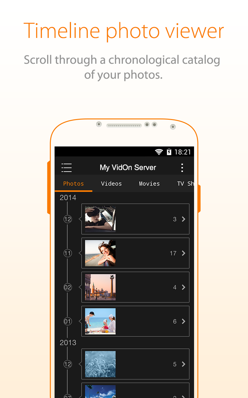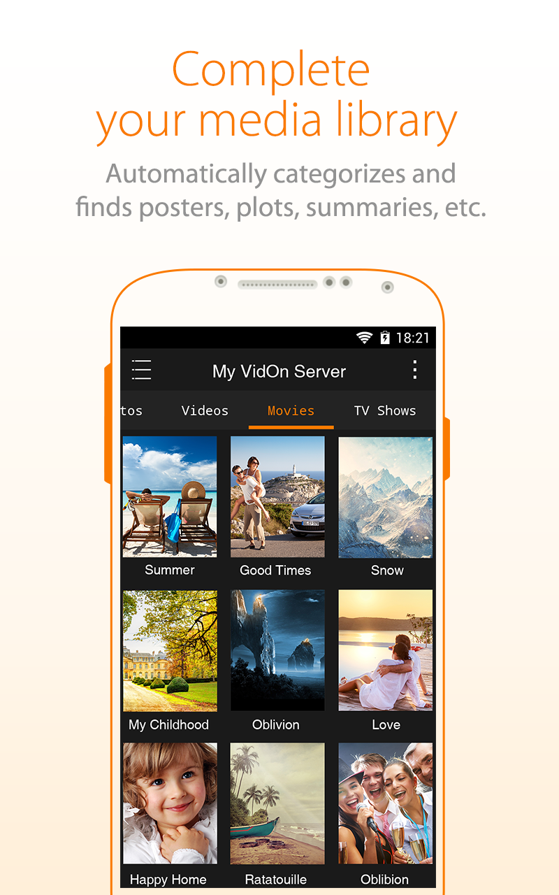 VidOn Cloud + VidOn Server puede ayudarle administrar, descargar, copiar y reproducir transmitiendo todas sus medias personales entre su dispositivos portables y VidOn Server. 1. Administrar Bibioteca Multimedia - Categorizar Multimedia automáticamente - Respadar información de película automáticamente 2. Reproducir video con toda libertad - Compatible con todos formatos populares de videos, subtítulos y fotos - Reproducción de 1080P por hardware aceleración - Reproducción y desencriptación de Blu-ray - Cambiar pista de audio y subtítulo 3. Hacer Copia de Seguridad de Foto a Nube Privada - Hacer copia de seguridad de fotos a VidOn Server - Filtrar y mostrar fotos según lugar, fecha y dispositvo, etc. 4. Ver Fotos por Biografía - Desplazarse a través de un catálogo cronológico de sus fotos VidOn Cloud: http://es.vidon.me/vidon_server.htm