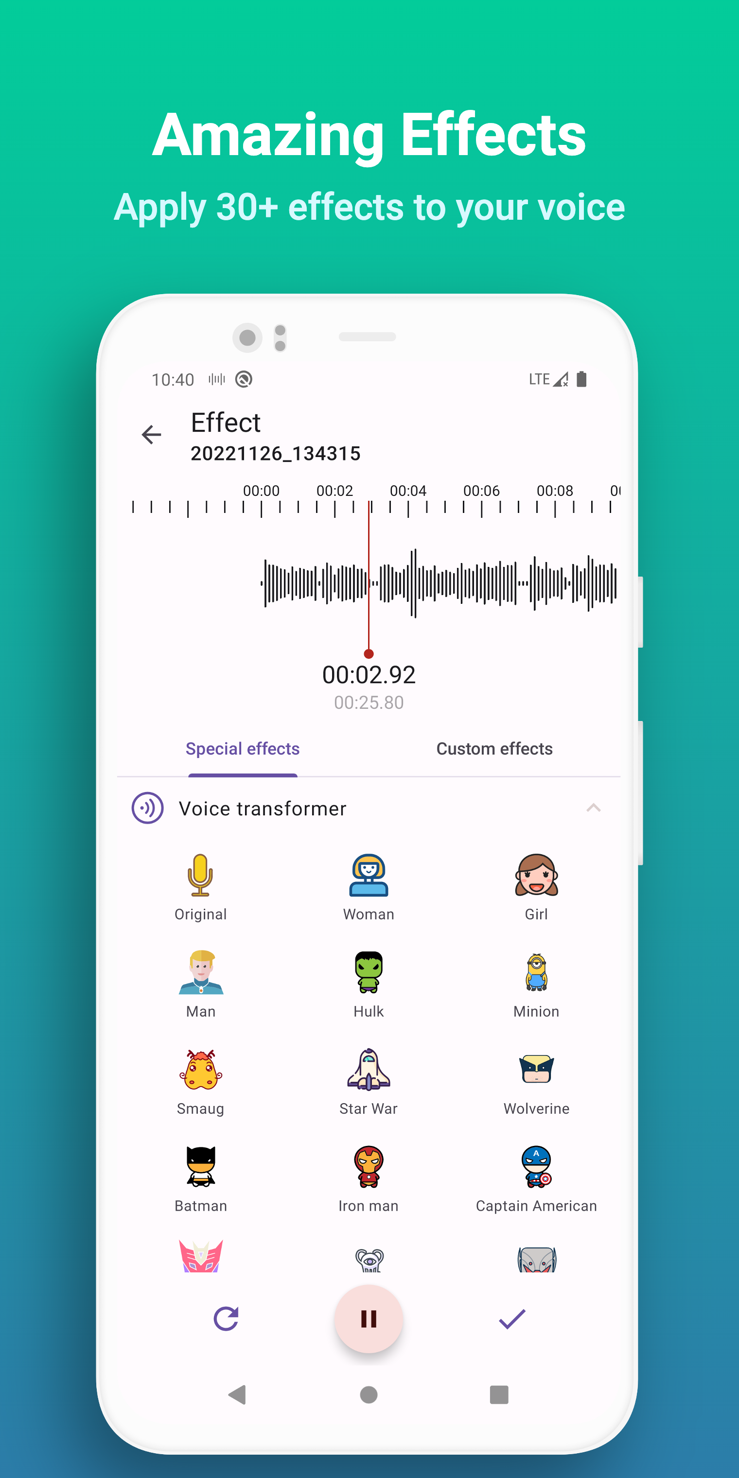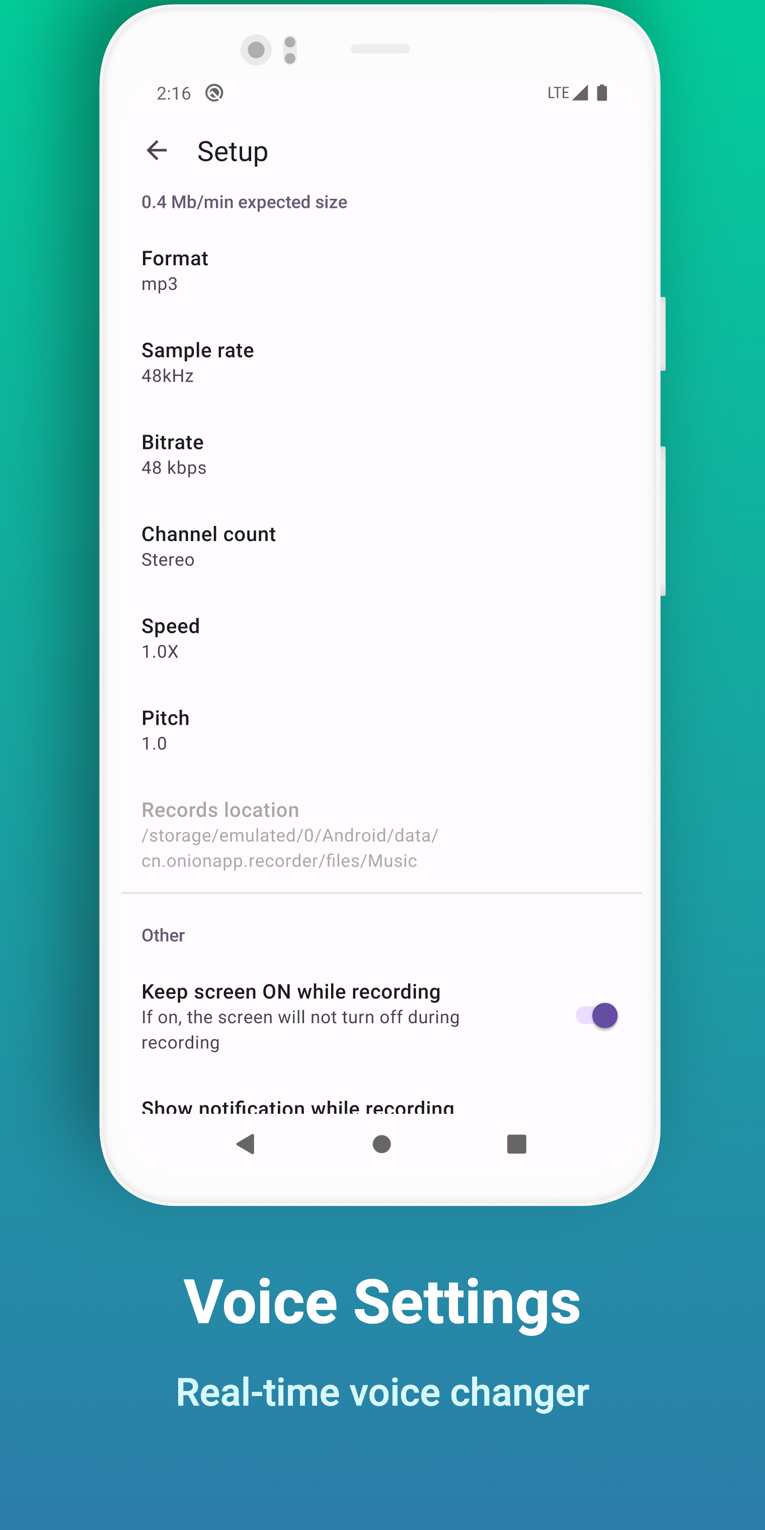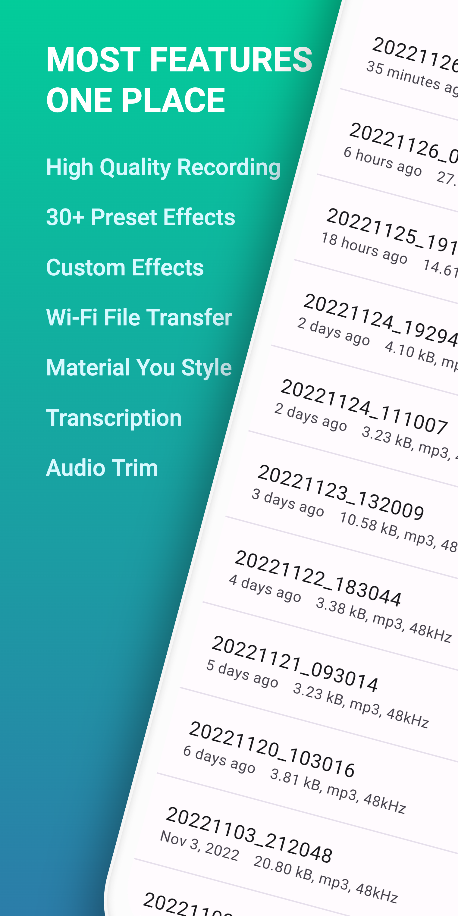 Es una grabadora con cambiador de sonido de alta calidad que puede cambiar la voz (tono y velocidad) en tiempo real, admite una frecuencia de muestreo de hasta 48k, sin límite de tiempo, lo que le brinda la mejor experiencia de grabación. Puede grabar de manera confiable sus reuniones, notas personales, discursos, conferencias, canciones. Tiene las siguientes ventajas: - Interfaz simple, sin límite de tiempo, solo una tecla para comenzar a grabar sin internet. Puede agregar etiquetas, pausar/reanudar mientras graba - Formato de archivo: MP3, WAV - Mejora de la voz: amplifica el sonido para grabar voces más claras - Edición de audio: seleccione fácilmente la duración de la música que desea cortar y recorte la grabación con precisión. - Transcripción: convierta con precisión archivos de grabación en texto - Transferencia de archivos Wi-Fi: use Transferencia de archivos Wi-Fi para exportar datos de forma rápida y sencilla a su computadora sin ningún software adicional. Solo asegúrese de estar conectado a la misma red y listo para comenzar a transferir. - Cambiador de voz en tiempo real: cambie automáticamente el tono y la velocidad del habla durante la grabación. Proteja su privacidad y ahorre espacio en su memoria - Efectos de cambio de voz: más de 30 efectos de sonido preestablecidos, si no está satisfecho, puede personalizar los efectos de sonido - Agregar categoría: puede organizar sus grabaciones en categorías - Configuraciones personalizadas: formato de grabación (mp3, wav), frecuencia de muestreo, número de canales, velocidad de voz, tono - Editor de etiquetas de audio: soporte para modificar título, subtítulo, nota, álbum, artista del álbum, año - El reproductor incorporado admite controles de medios como omitir silencio, doble velocidad, modo de bucle, pista anterior y siguiente - Admite grabación en segundo plano, oculta notificaciones al grabar, grabar ya no es vergonzoso - Reanudar la grabación desde un punto de interrupción: la aplicación se cierra de forma anormal, la grabación no finaliza normalmente, etc., abra la aplicación nuevamente para continuar con la grabación - Papelera de reciclaje: reversión con un clic de grabaciones importantes eliminadas - Comparta, elimine o exporte varios archivos al mismo tiempo (soporte de selección de clic largo) - Importa audio libremente, admite la mayoría de los formatos de audio
