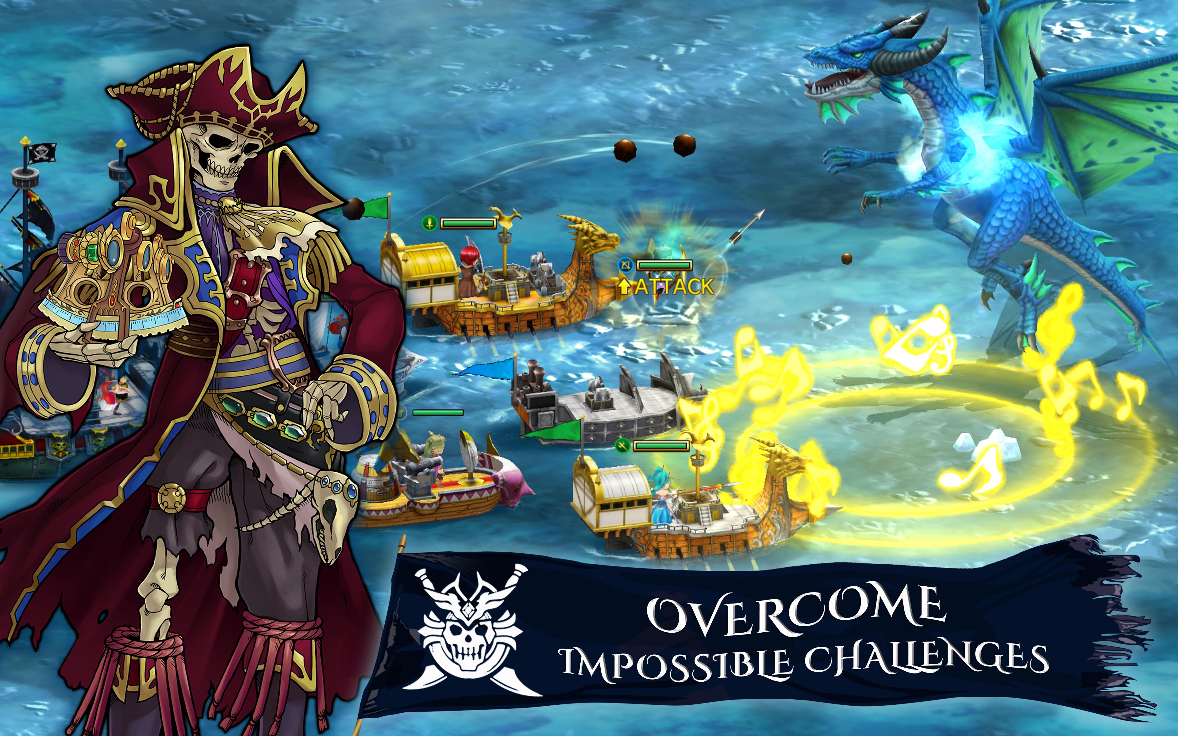 - Clash in real-time battle against pirates crews, siege fortresses, and crush legendary sea creatures