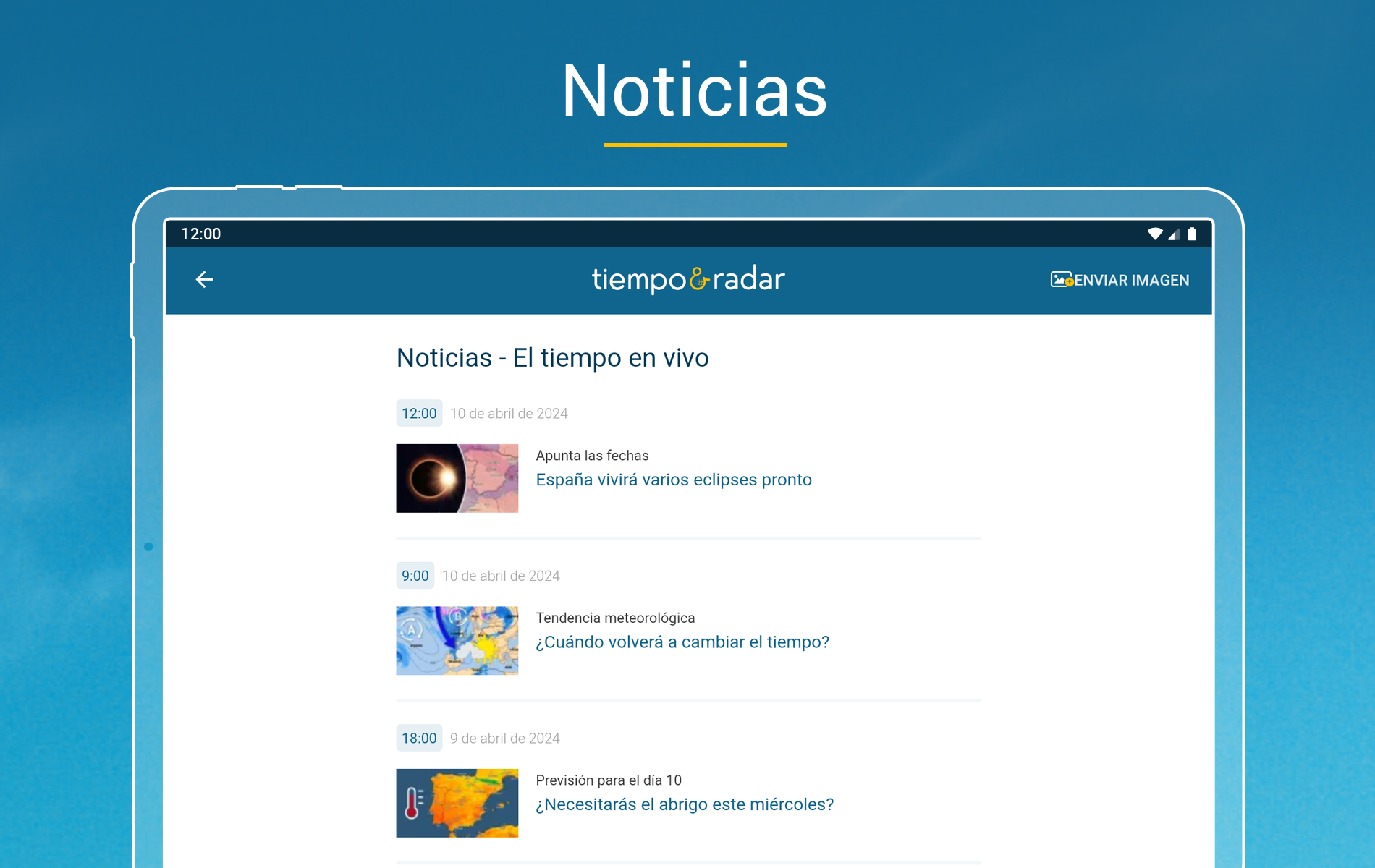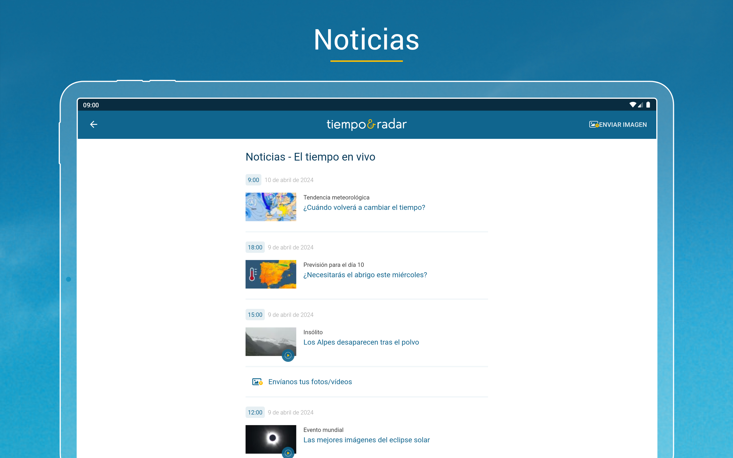Noticias del clima de última horaLee cada día en la app la previsión redactada del tiempo para hoy y el pronóstico para mañana. Sigue también las noticias de última hora sobre el clima y la actualidad meteorológica nacional e internacional.