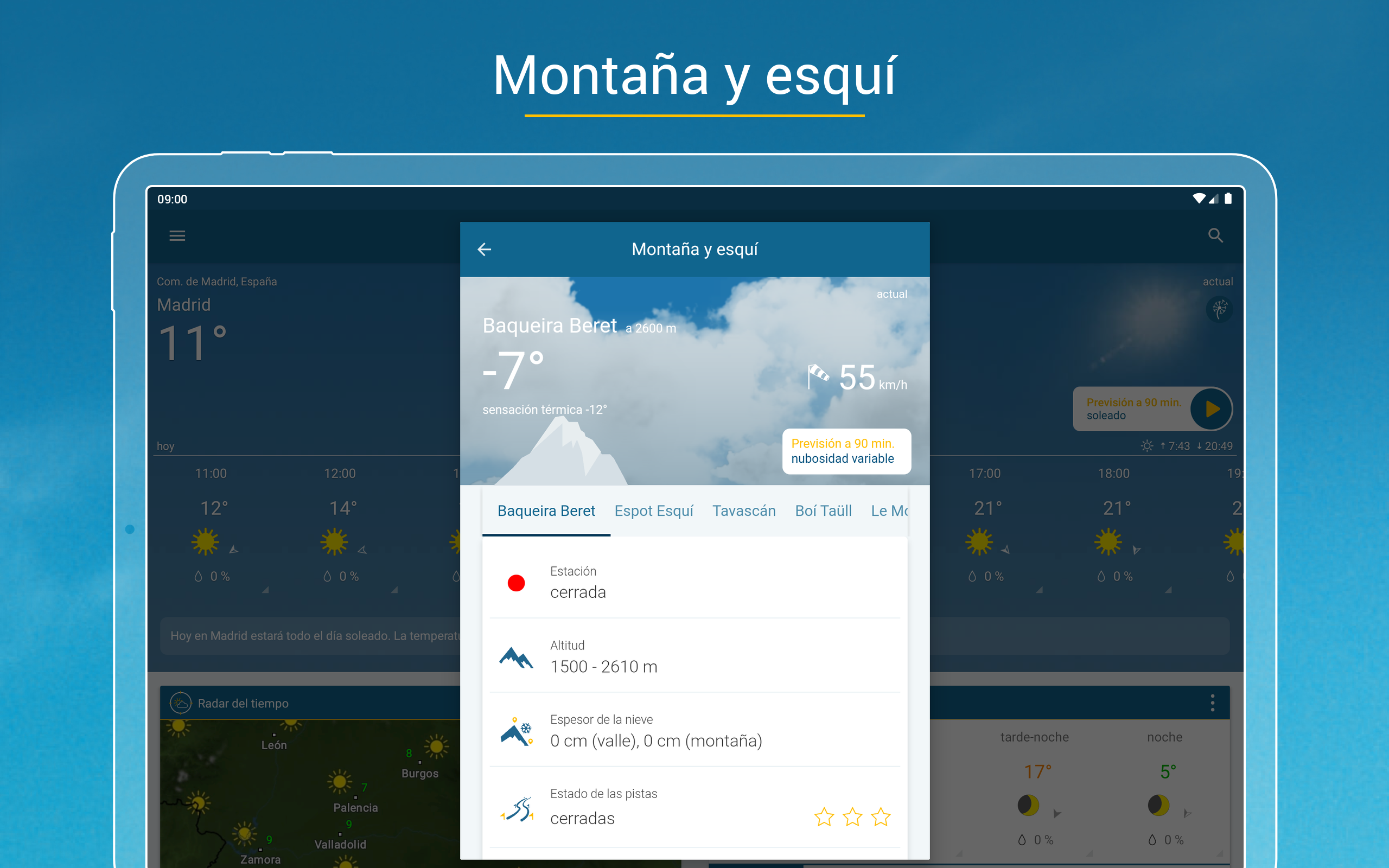 Montaña y esquí¿Planeas una escapada a la nieve? Tiempo & Radar te muestra toda la información que necesitas sobre el tiempo en la montaña, así como la mejor estación para practicar esquí, snowboard o tu deporte de invierno favorito. Accede gratis al parte de nieve de las mejores estaciones de esquí europeas.