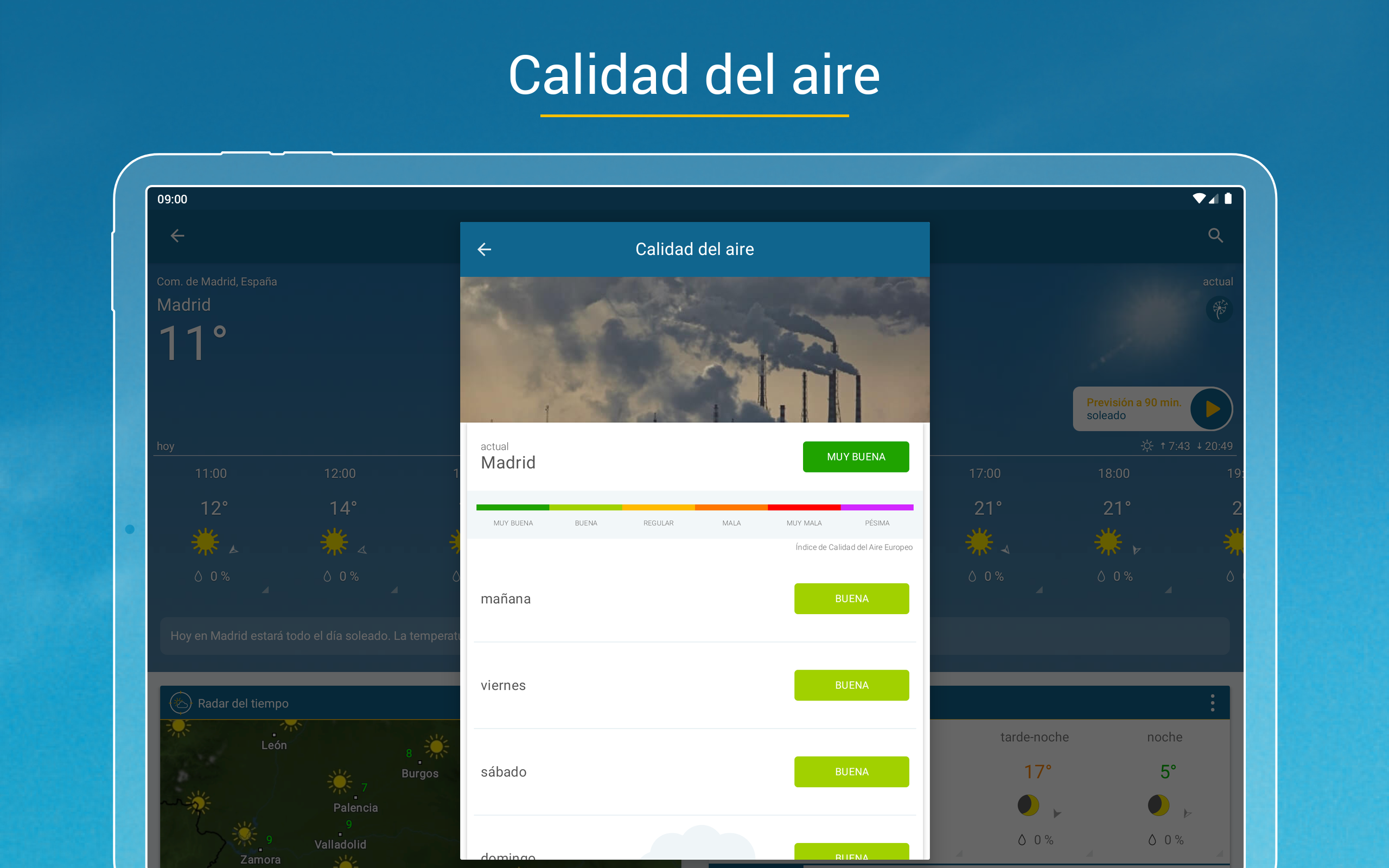 App de previsión del tiempo¡Tu tiempo de un vistazo! La aplicación Tiempo & Radar te ofrece el pronóstico a 90 minutos, por horas, el tiempo hoy y mañana, a 7 y a 14 días en España y cualquier localidad del mundo. Ten siempre a tu alcance datos actualizados sobre temperatura, lluvia, nieve, viento, presión atmosférica, humedad relativa y probabilidad de precipitación.