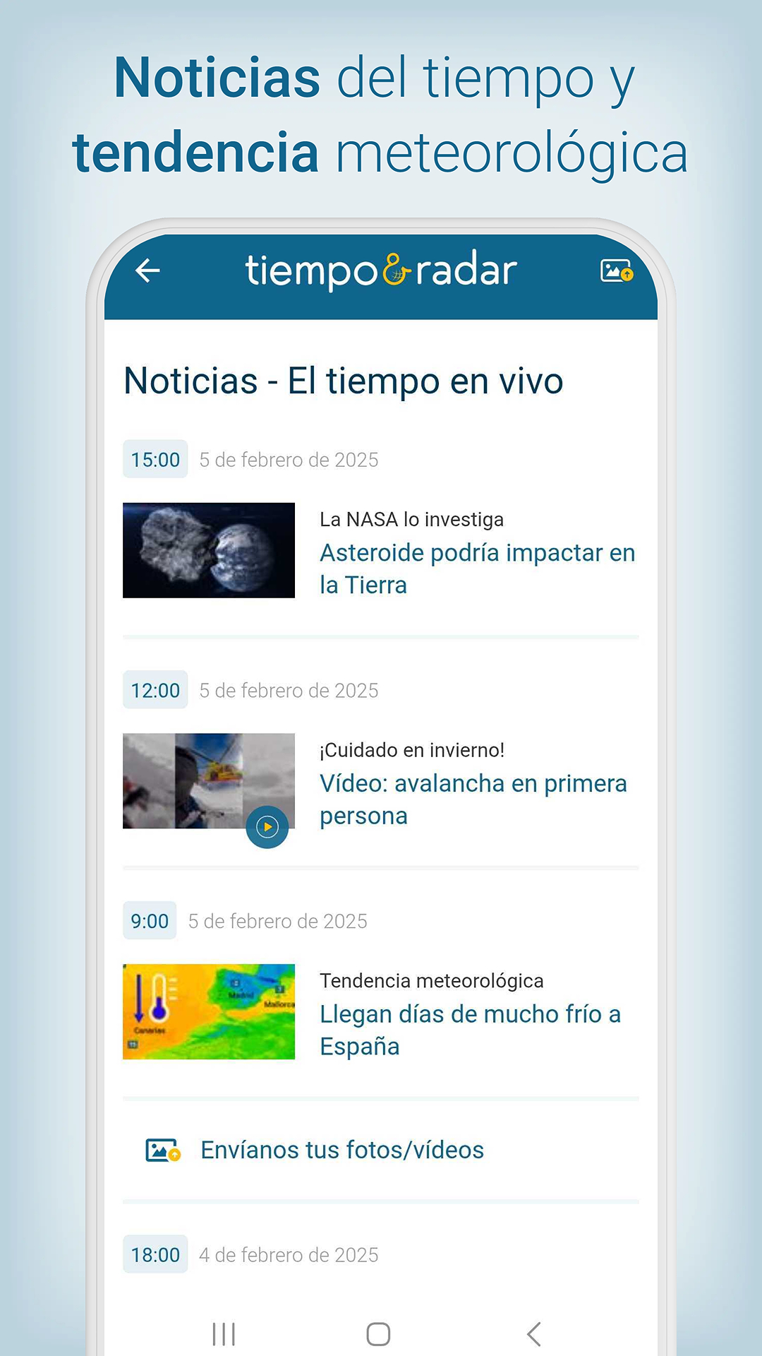 Aviso de lluvia y alertas por tiempo extremoTanto si se aproxima lluvia como si hay riesgo de tormenta fuerte, hielo o temporal, recibirás una notificación desde Tiempo & Radar para que estés siempre preparado ante cualquier condición meteorológica adversa.