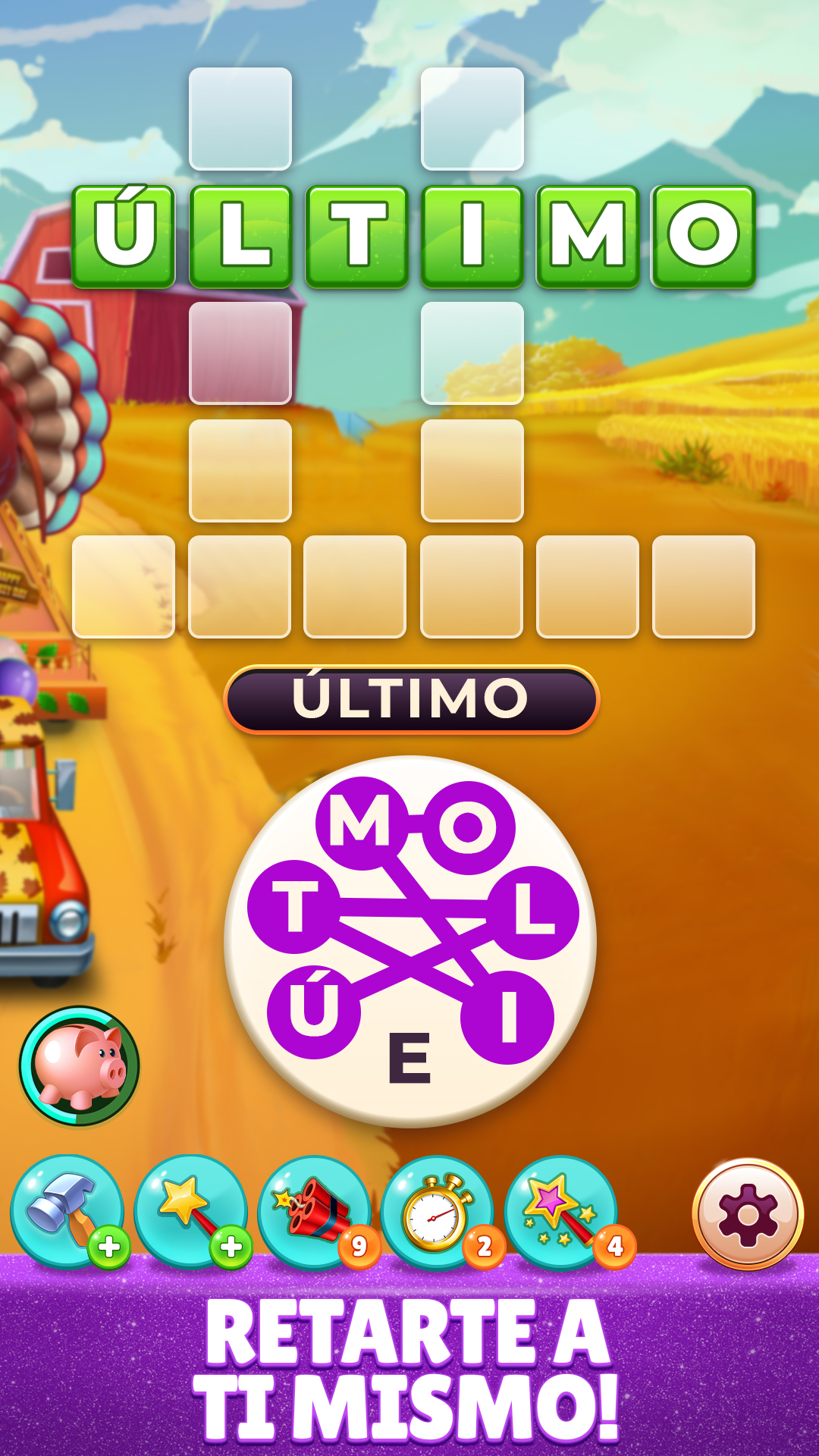 Recompensas: después de resolver cada puzzle de palabras, serás recompensado con monedas y estrellas para ayudarte a completar misiones y restaurar la granja.