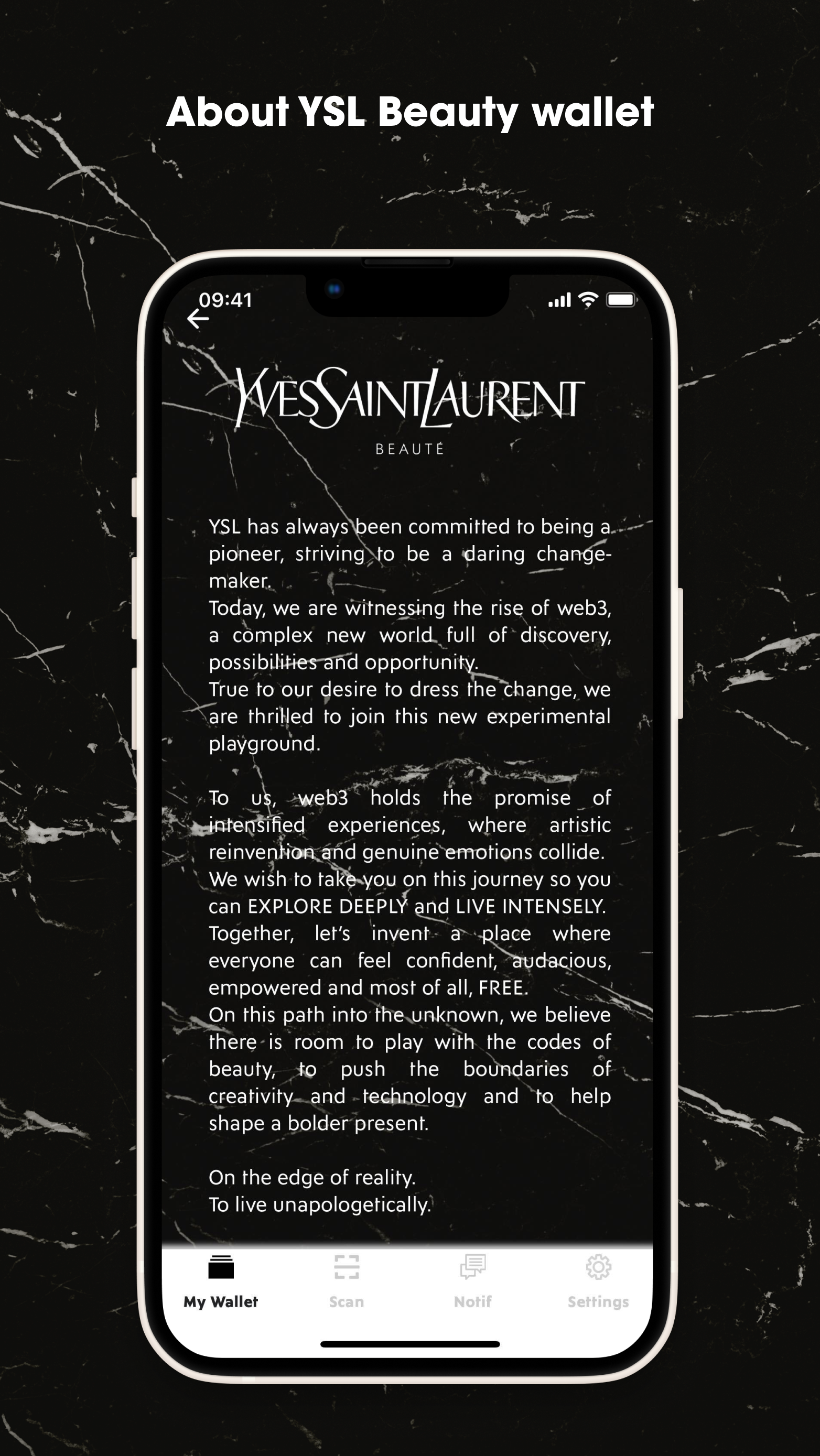 YSL Beauty Wallet es una billetera criptográfica única que permite a sus propietarios almacenar y poseer realmente sus tokens no fungibles. Basado en la infraestructura web3, YSL Beauty Wallet brinda un control completo de los datos personales sin seguimiento.