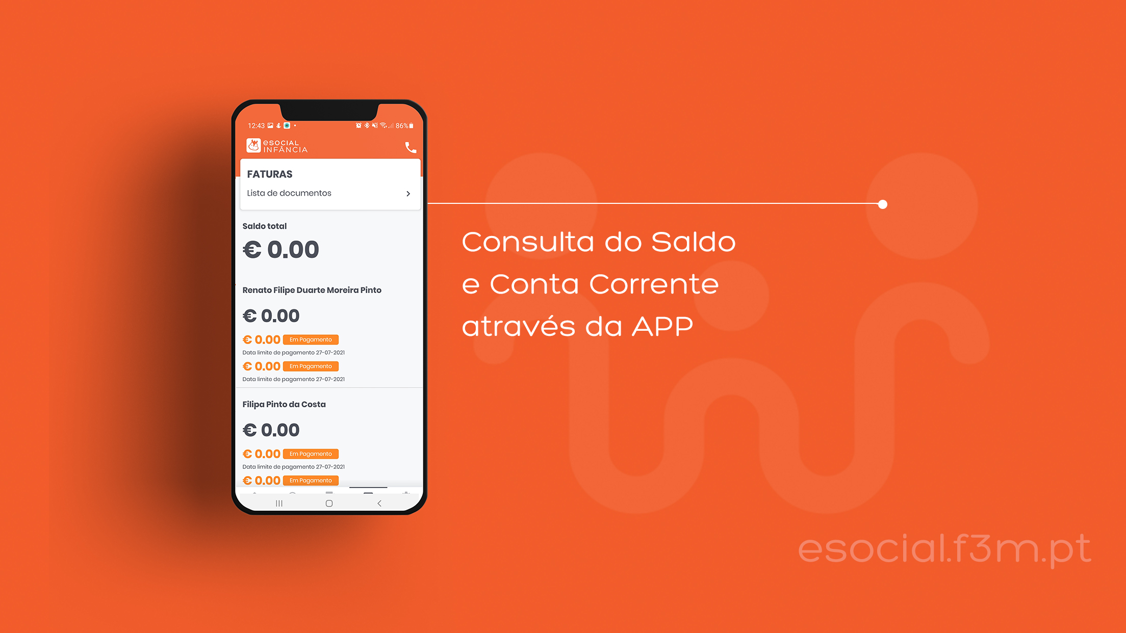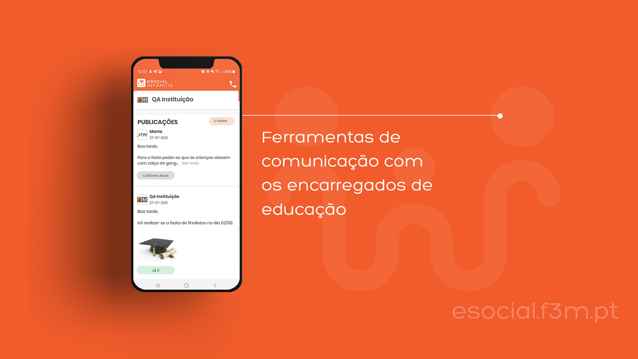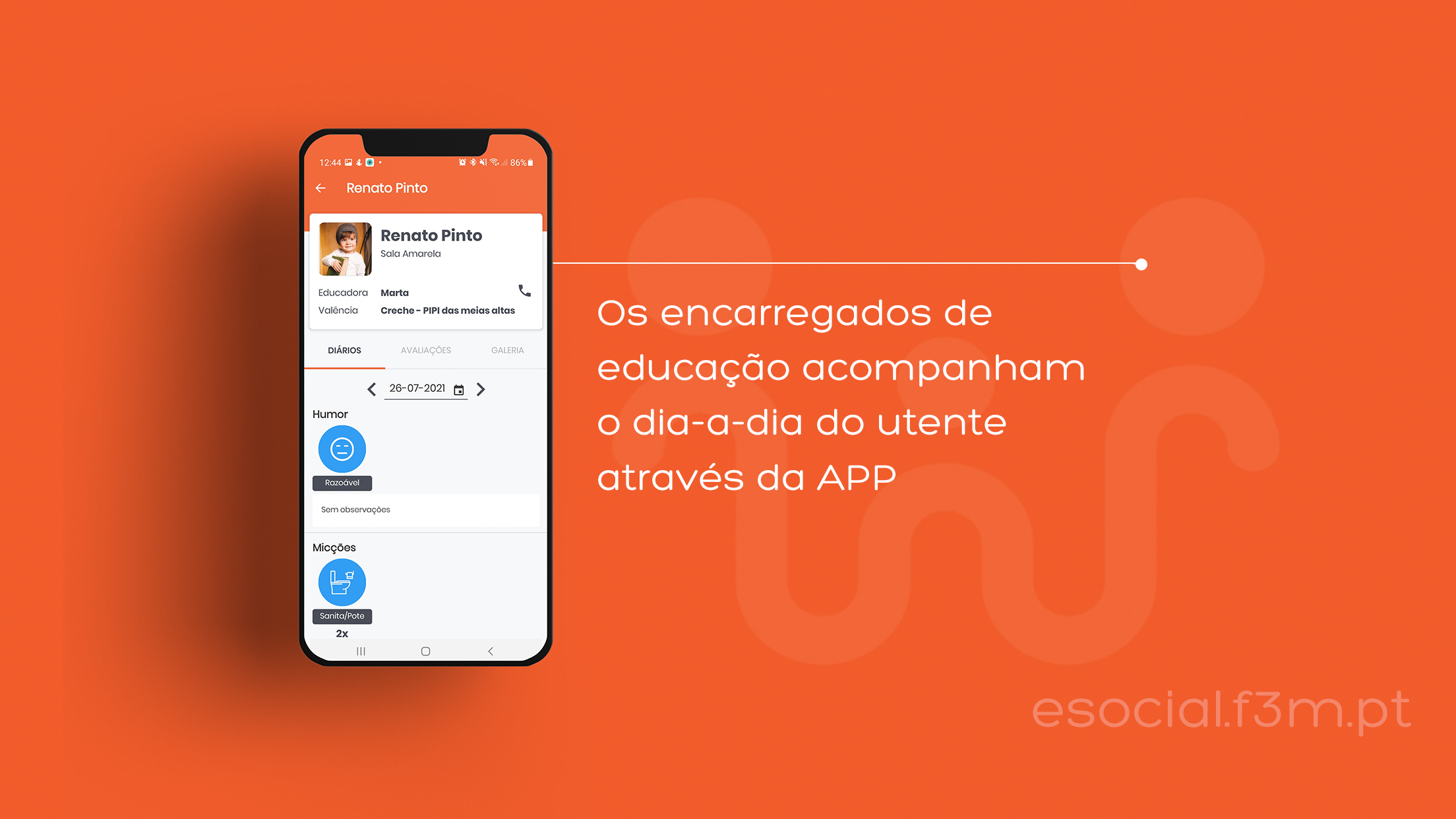 eSOCIAL INFÂNCIA is an APP developed by F3M for those responsible for educating users of nurseries, day care centers, kindergartens, study centres, ATLs and pre-school education. MAIN FEATURES: . Consultation of the User File; . Consultation of Daily Records and Summaries; . User Evaluation Consultation; . Checking the Balance and Current Account; . Possibility of consulting the ATM reference for payment of document(s); . Publications; . Photo gallery; . QrCode for registering children's entries and exits; . Chat; . Notifications and Menu Consultation (available soon). Visit our website https://esocial.f3m.pt.