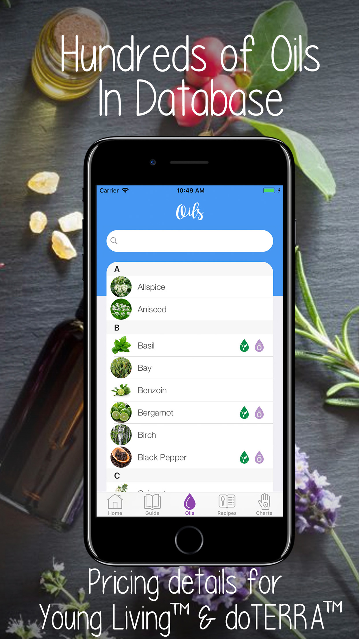 • Ability to see which oils are offered by Young Living™ or doTERRA™ and their current prices for each.