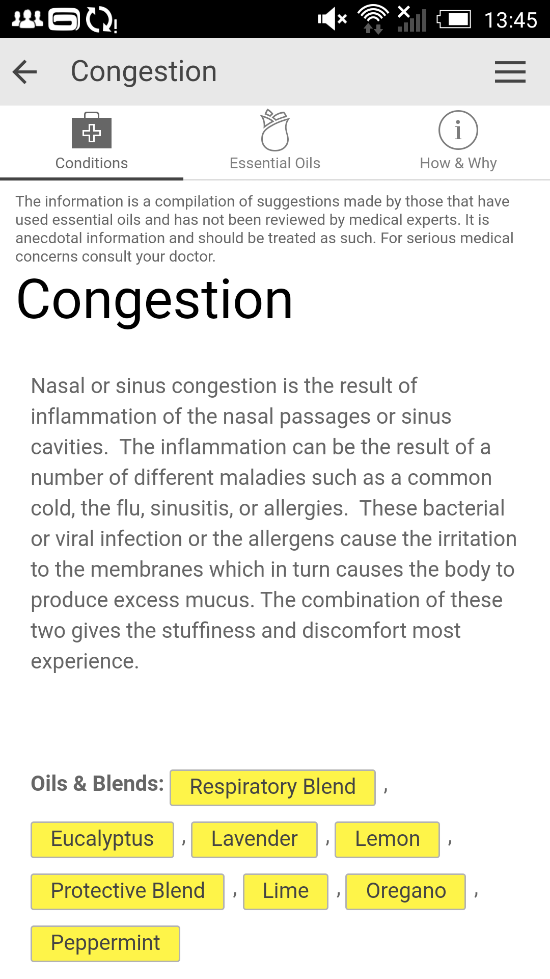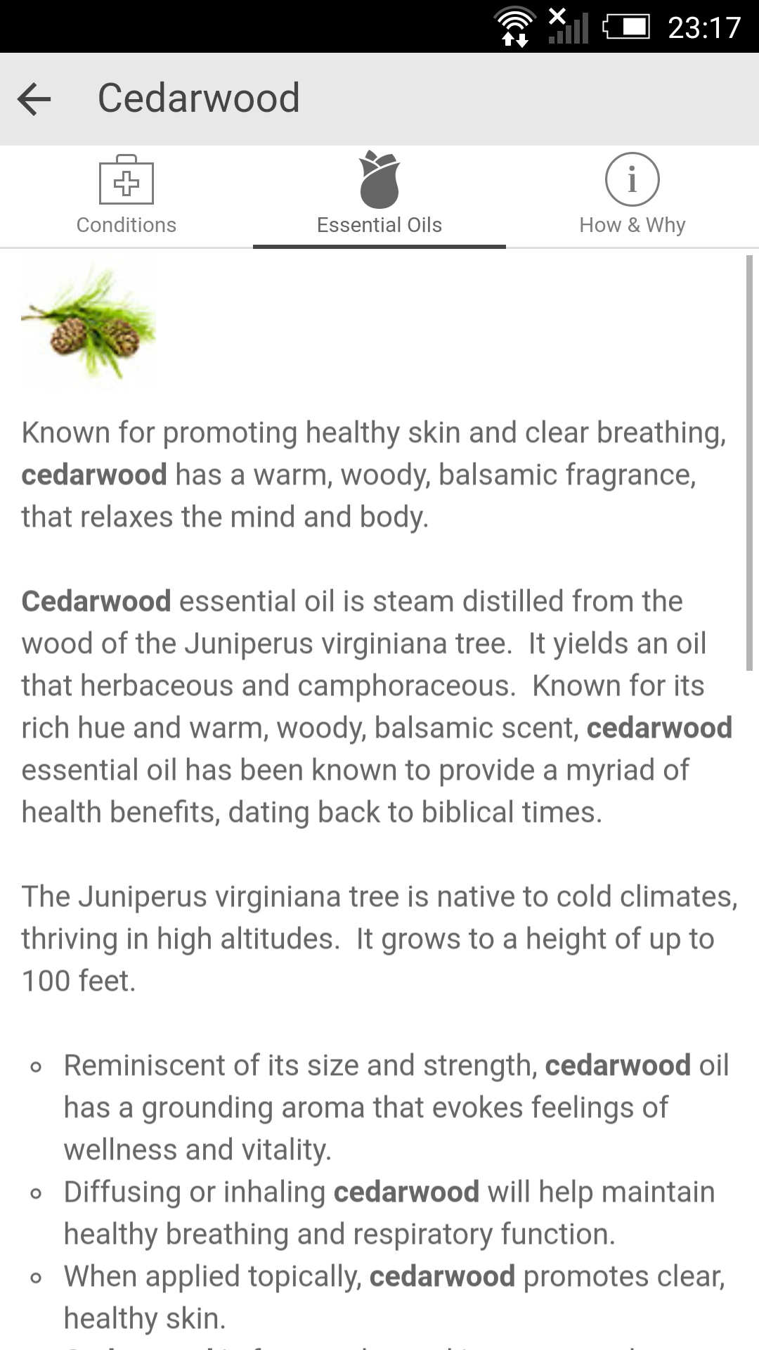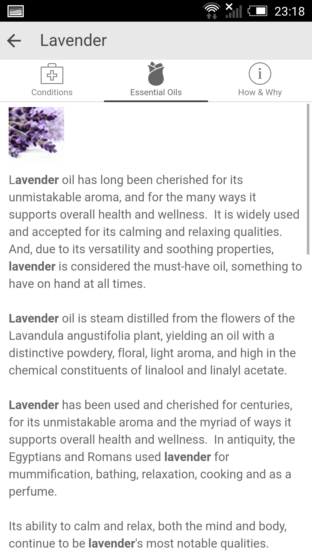 The app features a guide section that details over 234 health conditions for which essential oils are commonly used to help support the body’s natural ability to heal itself. Additionally, you can find information on over 60 single oils and 19 commercially-available oil blends that will help you better understand and use essential oils.