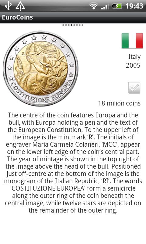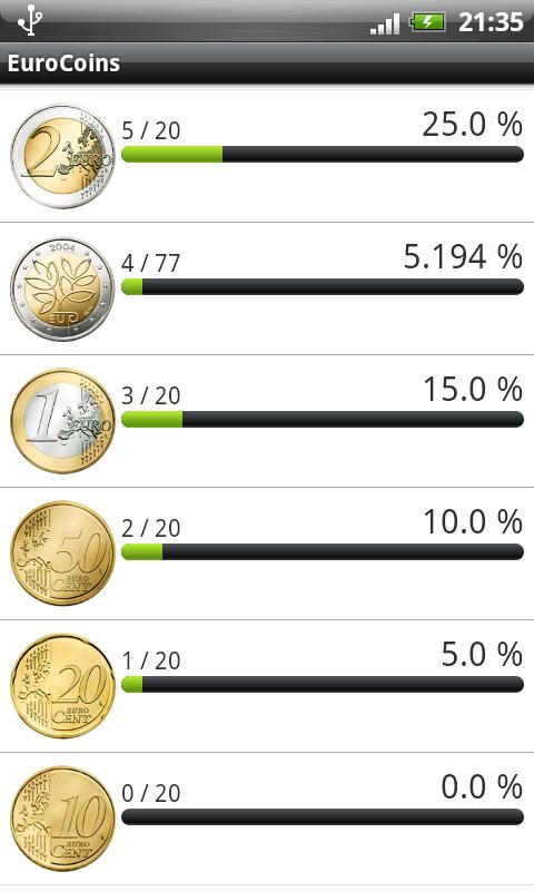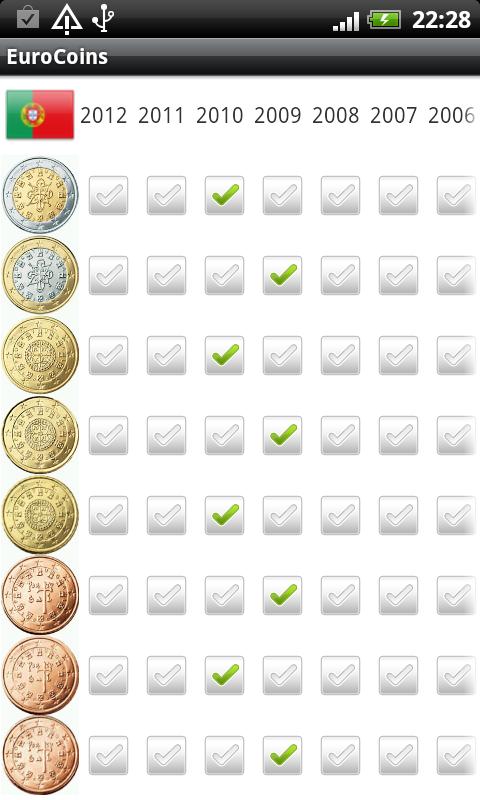 EuroCoins is an application for Euro coins collectors. Supports: - national coins - commemorative coins (2004 - 2020) - years / mints - grading - note - backup / restore Coins descriptions in 11 languages: - Deutsch - English - Eλληνικά - Español - Eesti keel - Français - Italiano - Nederlands - Português - Polski - Slovenčina