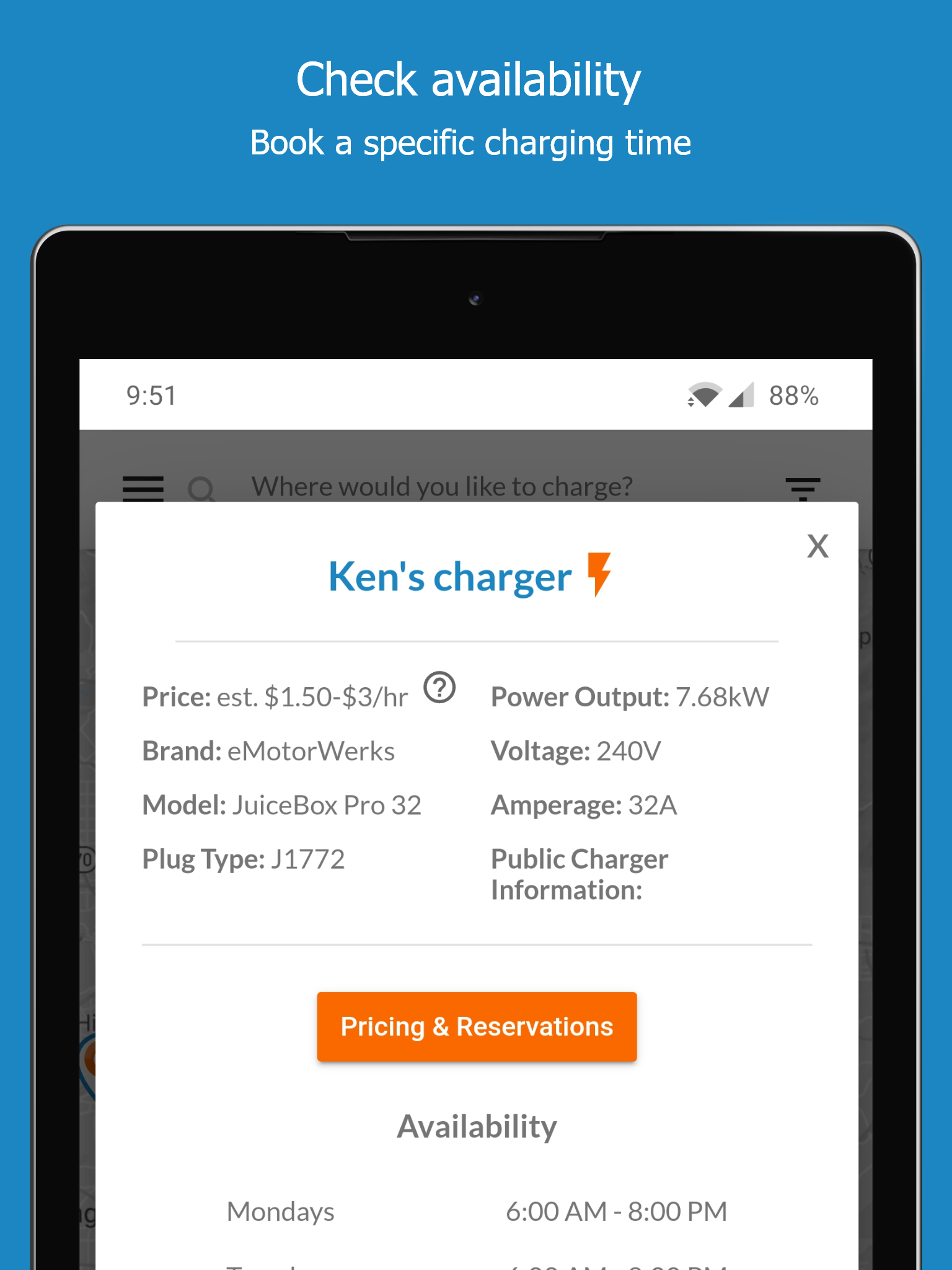 Find hundreds of electric car charging stations that aren’t listed on other car charging apps with EVmatch’s peer-to-peer charging network. You can find, reserve, and pay for use of private electric car charging stations with just a few clicks. Whether you’re looking for car charging near your apartment, your workplace, or on a road trip, you can find it all on the EVmatch electric vehicle charging station map. You can also share your own electric car charging station to earn extra money and help more people drive electric cars! There are no sign-up fees for residential car charging hosts so get started today supporting your community. EVmatch is now operating its electric car charging sharing service nationwide! Perfect for renters and apartment and condo dwellers that drive a Tesla Model 3, Tesla Model S, Tesla Model X, Nissan LEAF, Chevrolet Volt, BMW i3, Chevrolet Bolt EV, Fiat 500e, Ford Fusion Energi, Volkswagen e-Golf, Prius Plug-in, Kia Soul EV and all other electric vehicles currently available. You will have access to Level 2 electric car charging station brands including Enel X, ChargePoint, Tesla, Bosch, ClipperCreek, Siemens, and more. Invite your friends to earn free EVmatch car charging credit! Earn $10 of credit after they make their first charging station reservation. Earn $15 in bonus credit when they become an electric car charging host and host a charging session. For electric car drivers: -Get access to more electric car charging stations (Level 1 and 2) by booking the use of private home and business chargers in advance. -Some charging stations now have a Charger ID, and can be booked instantly using the new Charge Now feature on the map and in the main menu. Just enter the Charger ID and the duration of your reservation, and you are ready to charge! -Enter access codes to unlock exclusive availability and pricing at electric car chargers you’ve been granted access to. -Filter by electric car charger connector type (J1772, Tesla, NEMA 14-50 and more), charging speed, daily and hourly availability, price, and instant booking. -Load your wallet with EVmatch credit to easily pay for electric vehicle charging on the go. Purchase credit with a credit card or Google Pay. -Receive app notifications when your electric vehicle charging sessions are approved and ending. For residential charging station hosts: -Share your home electric car charging station or electrical outlet with fellow EV drivers for a price you control. -Update your electric car charging station listing, availability, and per kWh or hourly access fee. -Input your electricity provider and rate structure so you never have to think about how much to charge electric car drivers for using your EV charging station. -Manage bookings and get paid for hosting your electric vehicle charging station. -Convert your earnings into credit for charging your own electric car on our shared EV charging network. For apartments and condos: -Install an affordable Level 2 240V, WiFi-enabled smart electric car charging station and share it among tenants, guests, and/or the general public. -EVmatch software provides payment processing, booking and reservations, and access control features so you can easily and efficiently share electric car charging stations among multi-family housing communities of any size. For commercial charging station hosts: -Install and share an affordable, WiFi-enabled smart electric car charging station on the app and earn money from thousands of electric car drivers. -Manage your electric vehicle charging stations's public versus private availability. -Create user groups with exclusive access codes for your electric car charging stations. -Set specific hours to activate payments. -Manage pricing - set hourly or energy-based prices for your electric car charging station. -Receive payments through our secure payment processing system. -Set charging session hour limits and disable future reservations during specific time periods.