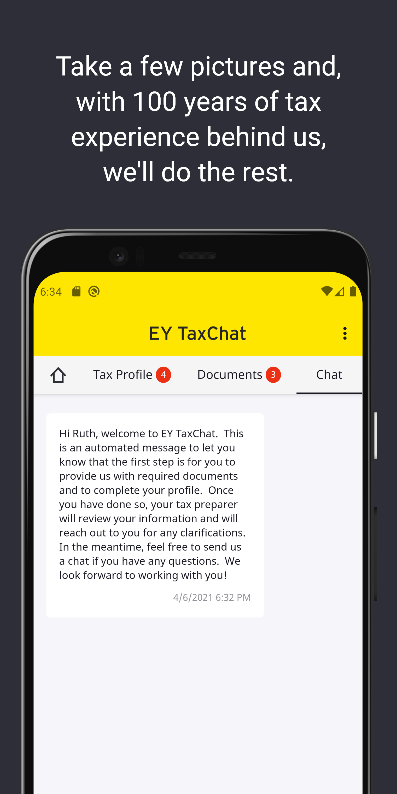 Stop struggling to understand software forms or guesswork about which tax laws apply to you. Try the award-winning, on-demand tax preparation service, EY TaxChat. It offers licensed tax professionals who prepare and file your individual federal and state returns through the app. An EY tax professional can handle your tax returns for you at a competitive price. Tax return preparation and filing begins at $199 for your federal and one state return. How it works: Answer some simple questions about last year. Did you have a job? Did you have a mortgage? Did you have charitable deductions? Then EY TaxChat provides a price quote tailored to your situation. You can easily submit your tax documents by taking pictures to upload through the app on a smartphone or tablet, or by uploading via the Cloud or computer. In addition, the platform’s chat function allows users to connect to an EY professional to ask questions at any time during the process. Here are some key Features of the new version: • Mirrored web-to-app interfaces for easy switching between devices • Additional customer service support available by phone Once your preparer has all the information, the tax return is then prepared and sent to the individual for review and approval before EY files it on your behalf with state and federal authorities. Ask questions from a dedicated professional tax preparer, using the text feature or by calling the toll-free number, +1 833 TAX CHAT (+1 833 829 2428), Monday–Friday from 9 a.m. to 9 p.m. ET.