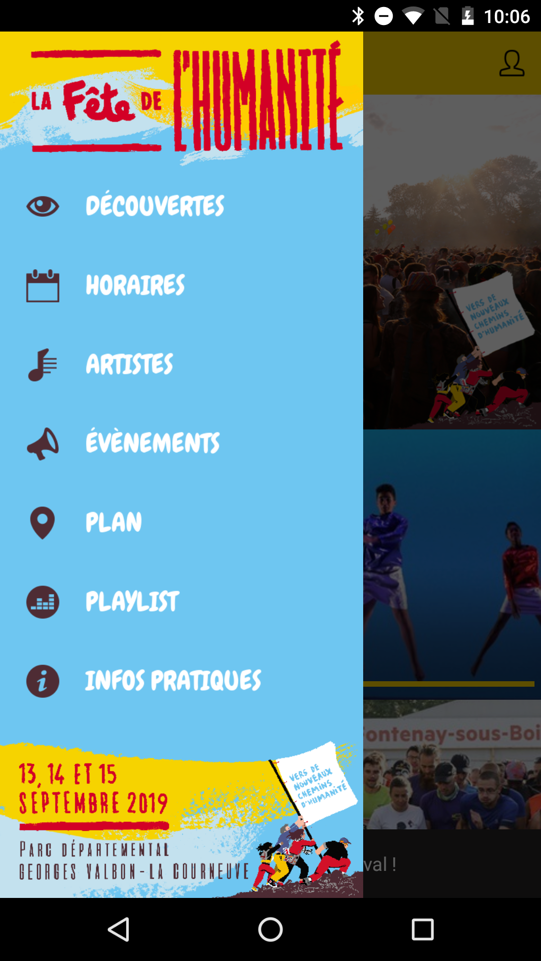 La Fête de l'Humanité est une fête organisée tous les ans par le journal L'Humanité. Chaque année, plus de 500.000 personnes en font la plus grande fête populaire de France ! Les 13, 14 et 15 septembre 2019 prochains, la Fête de l'Humanité fêtera sa 84ème édition ! Venez découvrir ce lieu unique de fête, de musique, de culture, de politique, de sport, de convivialité et de rencontres… Venir à la Fête de l’Humanité, c’est vivre des moments inoubliables où les mots solidarité, fraternité, liberté, égalité, justice sociale, paix et fraternité prennent tout leur sens. Faites le plein de rencontres en explorant les 400 stands dont plus d’une centaine venus des quatre coins du monde. Au programme : découverte des régions et leurs attractivités culinaires, rencontres avec de nombreuses associations, syndicats et forces citoyennes présentes. Enfin, la Fête de l'Humanité c'est aussi plusieurs dizaines de concerts tous plus enflammés les uns que les autres ! Cette année retrouvez notamment Soprano, Aya Nakamura, L'Or du Commun, Kassav', Les Négresses Vertes, Paul Kalkbrenner, Eddy de Pretto, Shaka Ponk, Marc Lavoine, Youssou Ndour, Miossec, Aziz Sahmaoui et bien d'autres encore... Sur cette application vous retrouverez toutes les informations vous permettant d'organiser au mieux votre venue à la Fête de l'Humanité : programmation musicale, programme des différentes conférences et débats, horaires, infos pratiques, billetterie ou encore des plans pour vous repérer dans le dédalle des allées du Parc de la Courneuve ! Et pour ne passer à côté d'aucun évènement susceptible de vous intéresser, nous avons tout prévu : programmez des alertes afin d'être prévenu du commencement imminent de chacun de vos évènements favoris !