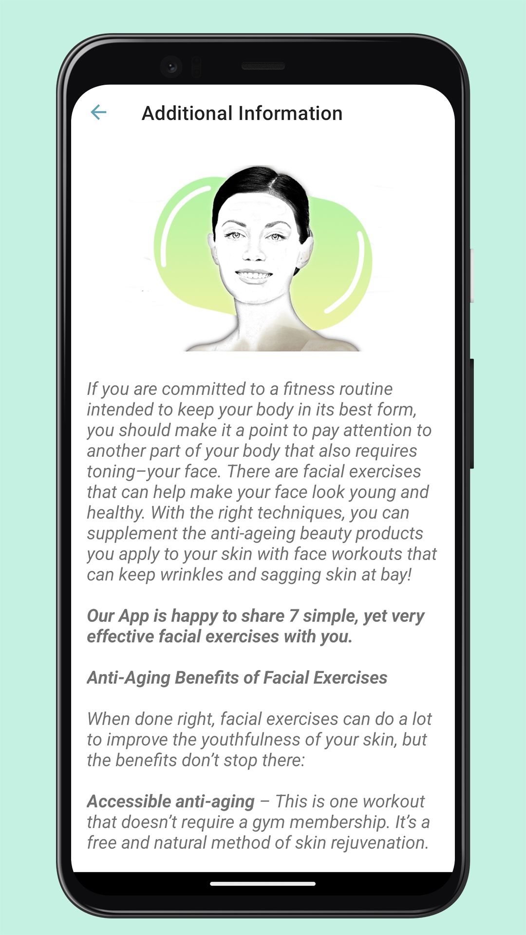 Welcome to our Facial Exercises for Women mobile app! Our app is designed to help you achieve a youthful, toned, and slim face with a range of effective face yoga workouts, facial exercises, cheek exercises, and face slimming exercises. Facial exercises have been used for centuries as a natural and non-invasive way to tone and strengthen facial muscles. Our app features a variety of facial muscle exercises and face yoga facial exercises that can help you sculpt your face and reduce the appearance of fine lines and wrinkles. Our face yoga app includes a range of face yoga workouts that target different areas of the face, including the forehead, eyes, cheeks, mouth, and neck. These workouts are designed to improve blood circulation, stimulate collagen production, and promote lymphatic drainage, resulting in a more youthful and radiant complexion. If you're looking to reduce face fat and achieve a slim face, our app also features a variety of face fat exercises, face exercises, and facebuilding techniques. You'll learn exercises to lose face fat and slim your face, including cheek exercises and face yoga face exercises. Our facial exercises for women are suitable for all ages and skin types. Our face yoga workouts and facial exercises are designed to improve the overall health and appearance of your skin, promoting a natural face lift and reducing the signs of aging. Our app also includes new face massages & yoga that are designed to enhance your natural beauty. Our facial massage techniques can help you achieve a more relaxed and radiant complexion, while our yoga face exercises can help you improve your posture, reduce stress, and enhance your overall well-being. Whether you're looking to achieve a slim face, reduce face fat, or simply improve the health and appearance of your skin, our "Facial Exercises for Women" mobile app has everything you need. Download our face yoga app and start your journey towards a more beautiful you!