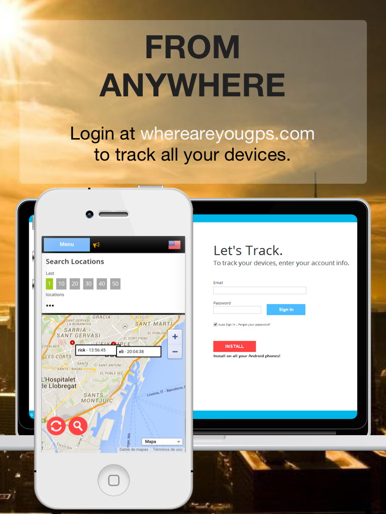 Family Locator is the newest family tracker app that uses GPS phone tracking technology to locate all your family’s cell phones and get the peace of mind you need. We make parental supervision easier so you never have to worry about your family safety again. We use GPS locator that is available in every Android phone to help you locate family members at all time. We also have other features that make this a superior child tracker & kids locator app for any family. ► 5+ million users have already installed our GPS phone tracker FAMILY LOCATOR. Get your kids phone real-time location on the Family Locator website from anywhere. Just install Family Locator on the mobiles you want to track, and the app will start to run silently and send cell phone locations to your private web account. Kids have so many activities in their live, from school, playing with friends, clubs, music lessons, and many more. As a parent, you must feel concerned about their whereabouts all the time but it’s not always easy to do parental supervision when you’re busy. You need a powerful kids locator and child tracker to know about their location. This is why we create our family tracker app with real time tracking. Our app also informs you if the battery is low or if the kids are going too fast. So, no more wondering how to find my family. TOP FEATURES OF FAMILY LOCATOR: GPS tracker is for parents peace of mind. Family Locator is made for parents that need a mobile application to track their child's location. The difference with other GPS phone trackers applications is that Family Locator mobile app runs silently and automatically. Once Family Locator is installed the cell phone tracker do not display any message. Easy to install cell phone tracker. Our family tracker app is very simple to install and use, and yet very powerful and will provide every information you need to ensure your family safety. To install Family Locator on all your family's devices you just need 1 minute. For example, if you install Family Locator on your child cell phone, you will then start to get Joanna's real-time location by logging in at whereareyougps.com website. Install Family Locator for Free. You can download our app and install it on your device for FREE. Your family safety is the most important thing in the world. Don’t waste your time installing GPS locator that doesn’t give information you need. With Family Locator, you no longer have to worry every time and wonder how to find my family anymore! GPS phone tracking technology. Every Android phone has a GPS locator that is built as part of its cell phone tracker function. We use this technology for your advantage to locate family members that have this app installed on their phones. Family map. See on the map where your family members are. You don’t have to ask yourself how to find my family anymore because we will point out the precise location of your kids. Low battery detection. Our app helps to let you know when your kid’s phone is low in battery. Speed tracking. You are worried that your kids drive too fast without your supervision? We have speed tracking that inform you how fast your kids are going. Text Notifications. You don’t have access to the internet? Send and SMS and get the GPS tracking information we gather via text messages to you. HOW TO INSTALL FAMILY LOCATOR? 1. Create an account when you first install this kids locator app. Click on the “Create Account” and set your email and password. 2. Install this GPS tracking app on your family members’ phones to begin the real time tracking using our app. You can enter a name for the device (for example: “Joanna's Phone”). 3. Log onto the whereareyougps.com website to see real time tracking of your kids’ phones. See the family map to locate family members by the device’s name. (Will be visible as “Joanna's Phone”). -- If you have any problem using our GPS tracking app please send us an email and we’ll be happy to help you!
