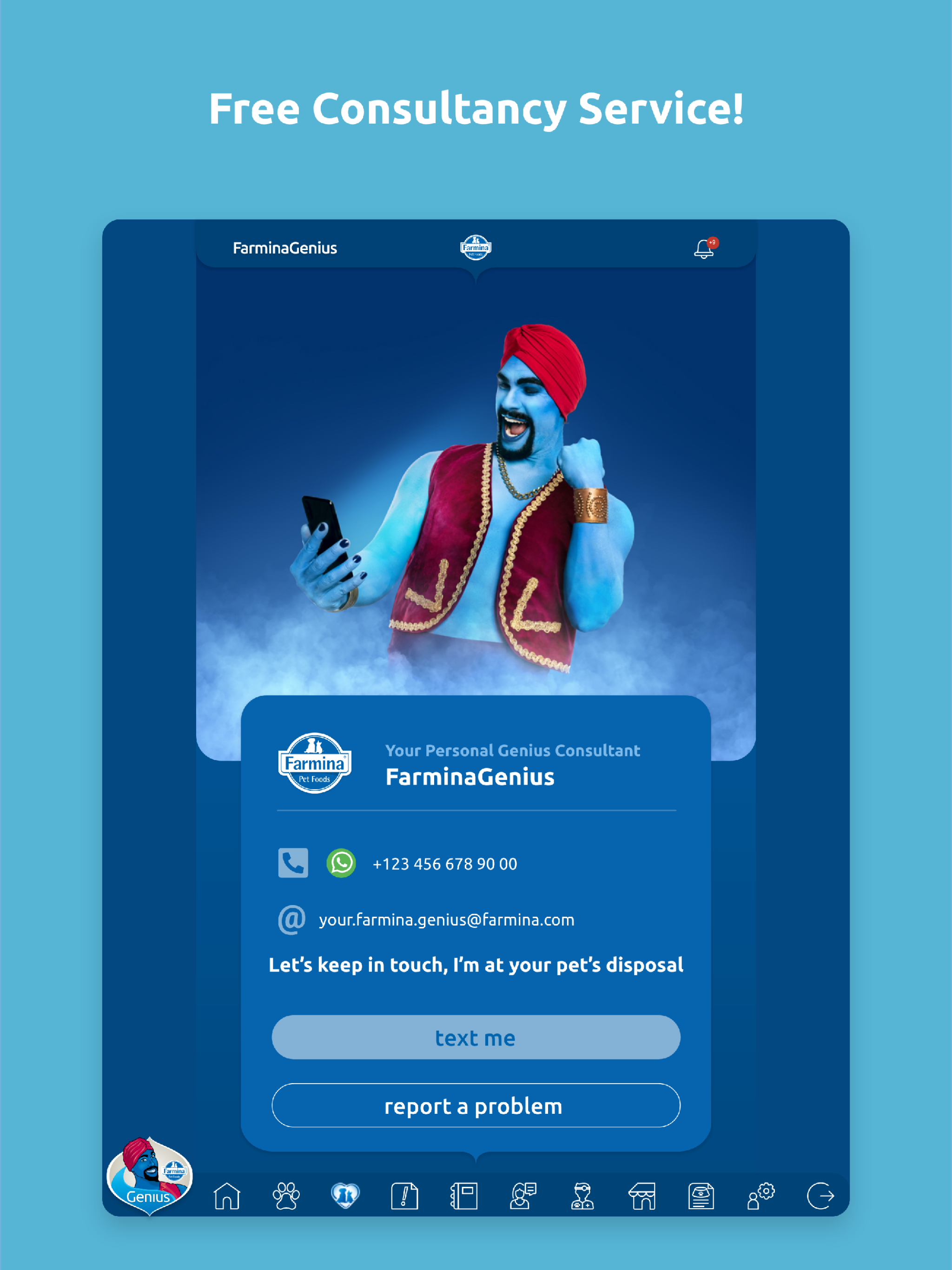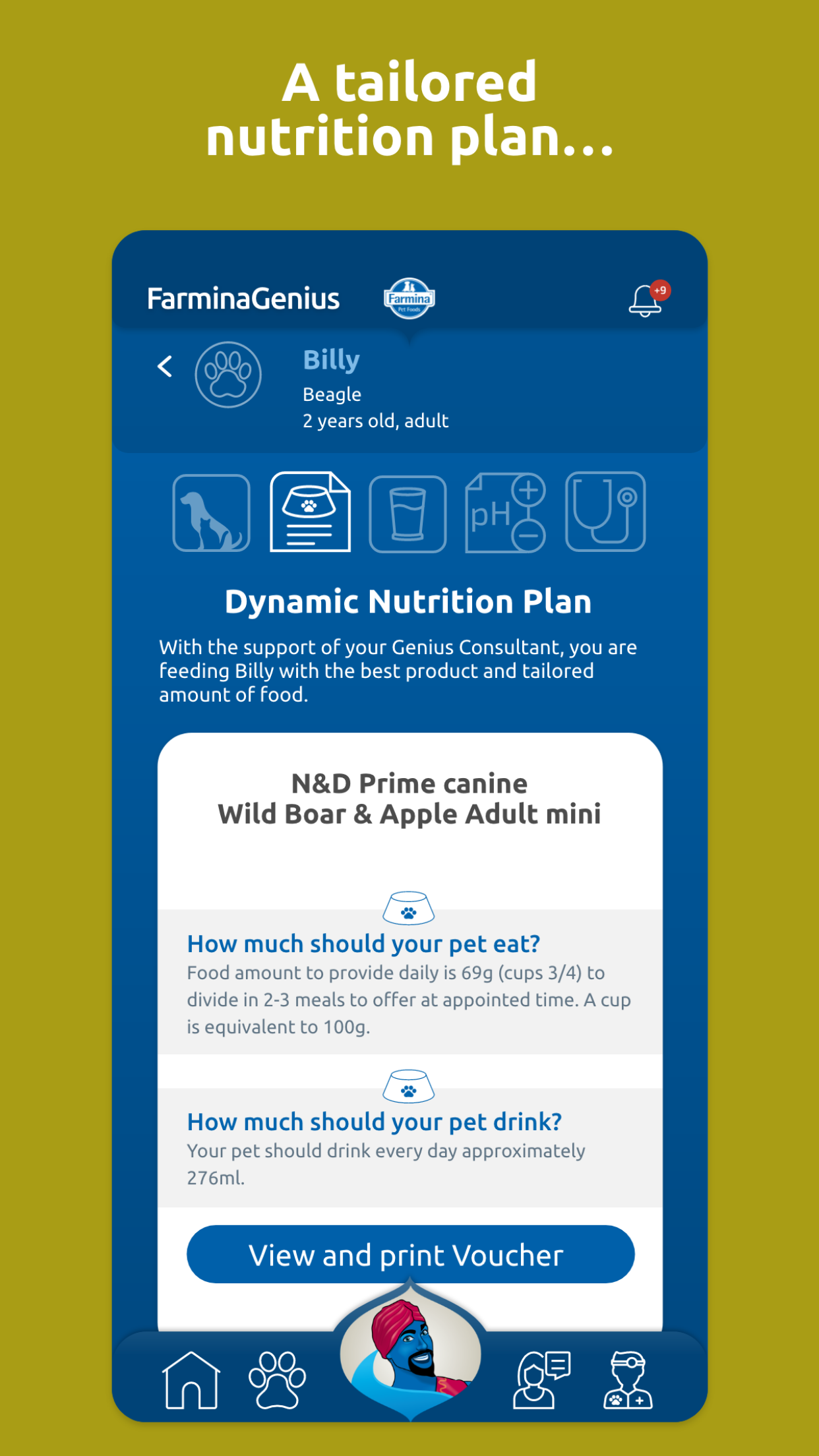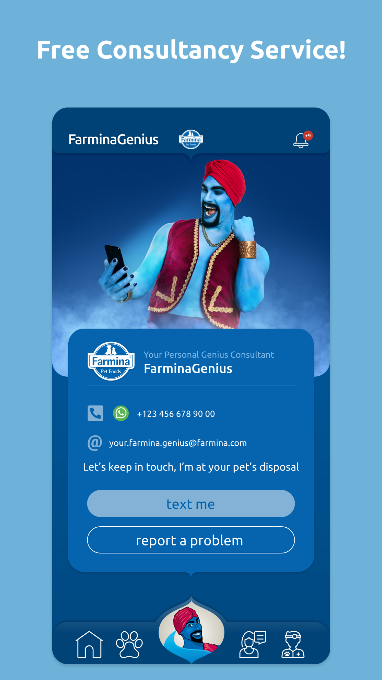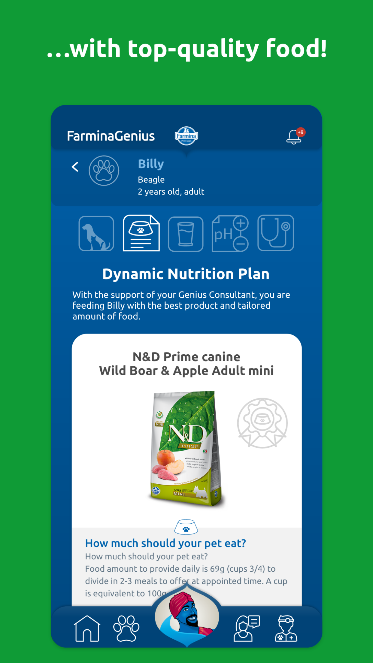 Who is the Farmina Genius? The Farmina Genius is the genie who will always be by your side to help you manage the well-being of your four-legged family members. Unlike your typical lamp genie, there is no limit to how many wishes can be made! Your pets require attention and care, but love is not enough to make up for proper health management and sometimes serious mistakes are made due to too much love (for example, a pet could be over-fed). Thanks to the Farmina Genius Pet Health Coach's competent support, you can receive expert guidance when it comes to the overall Health Management of your beloved pets with a personalized approach. By downloading the FREE Farmina Genius App, you can register your pets in the Pet Care Program. The Genius Pet Health Coach, in collaboration with a trusted Vet, will guide your pet through a 5-step wellness plan that will help provide for a healthier and longer life! " "The Five Key Indicators Through extensive collaborations between our internal Vet Research team and several major universities, these are five pieces of information you need to monitor. These parameters establish a clear prevention program that provides real-time data to your Genius Pet Health Coach and your Vet, who will be able to intervene if necessary." "1 – Body Condition Score Reaching the target weight, in other words the correct Body Condition Score, allows you to support your pet during every stage of life. Not only will you be able determine the need for any weight loss treatments , but you will also be able to prevent related pathologies such as obesity, joint problems, cardiovascular diseases, reproductive system complications or fat deposits." "2 – Dynamic Nutrition Plan A tailor made nutritional plan is the basis for maintaining a healthy pet. Thanks to our coaching service, you will be provided a dynamic nutritional plan. Why is it dynamic? Because it evolves with any changes in your pet’s health, habits, and environment: your pet’s life changes could require a change in its nutrition and through this app you are going to get the necessary info needed to maintain the proper rationing." "3 – Water Intake Tracking the average amount of water that your pet is drinking is critical: is your pet drinking enough? Or are they drinking too much? Any change may indicate the onset of pathologies like diabetes, kidney or thyroid disease. With the app’s support, you will make sure to find out and tackle these issues as soon as possible." "4 – Urinary pH With a simple clinical exam you will decrease your pet’s risk of kidney stones and lower urinary infections. Your Vet and your Genius Pet Health Coach can guide you!" "5 – Health Check Last but not least, the FarminaGenius App lists all the basic exams that must be done with the help of your Veterinarian in order to detect any “unwanted guests” or developing diseases. In addition to all the fundamental vaccinations that help to prevent many pathologies." "Download the FarminaGenius App! With a Personal Genius Pet Health Coach and your Vet, we will help you monitor the five key health parameters and help your pet lead a happy and healthy life. Register for the Pet Care Program completely free of charge in under 3 minutes: 1. Download the FarminaGenius App 2. Register your pet’s health data 3. Contact your personal Genius Pet Health Coach There are only three minutes between you and your pet’s health and happiness!" "More perks for you! -A personal coaching service via chat/mail/phone, forever -One click reporting service for any pathologies or issues that may arise -A tailored and dynamic nutritional plan -Vaccination reminders -Reminders for Vet appointments Pets are unique, just as their nutrition should be. Now thanks to the FarminaGenius App they can have their own personal nutritional plan! Download the FarminaGenius App now!