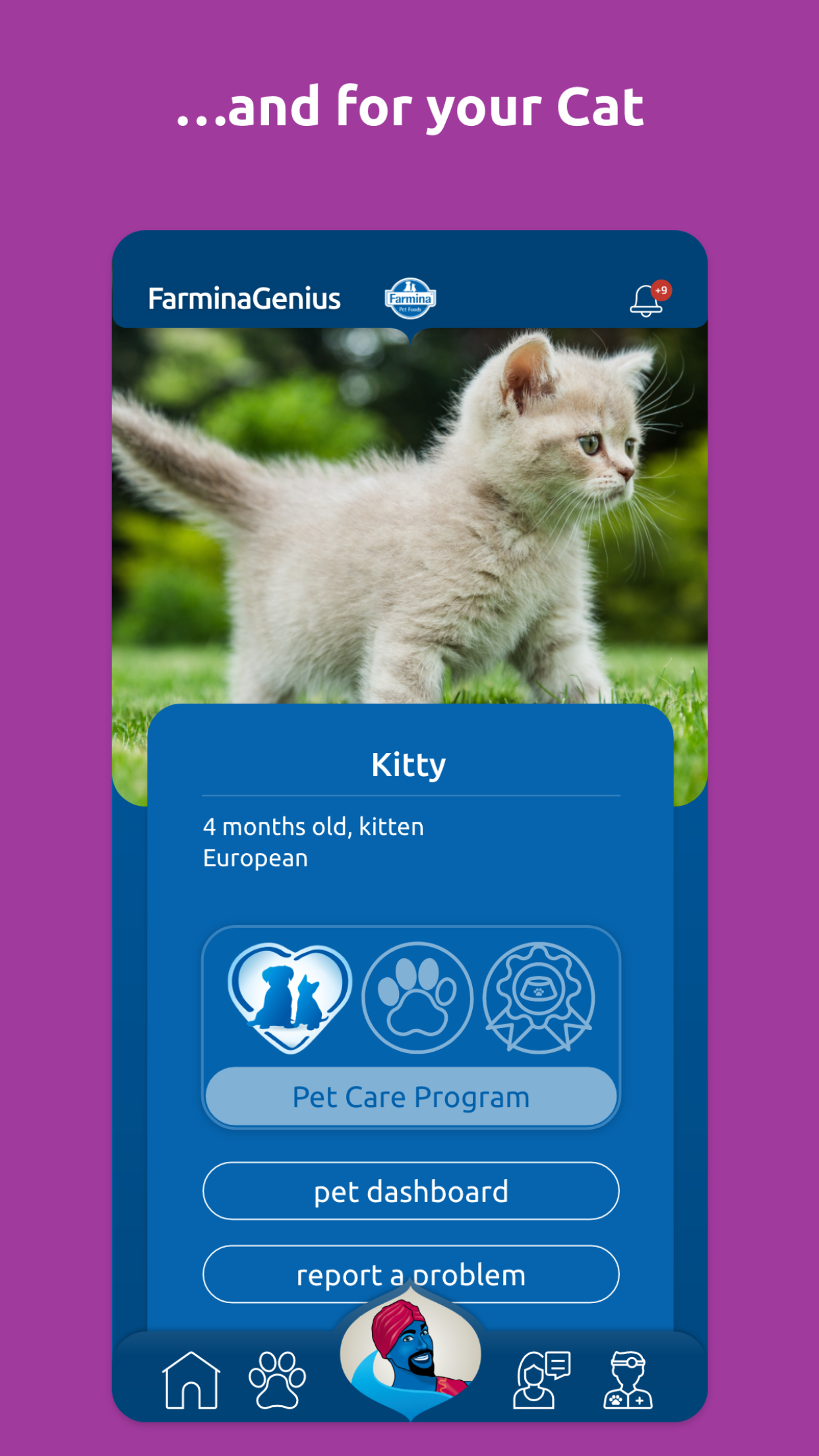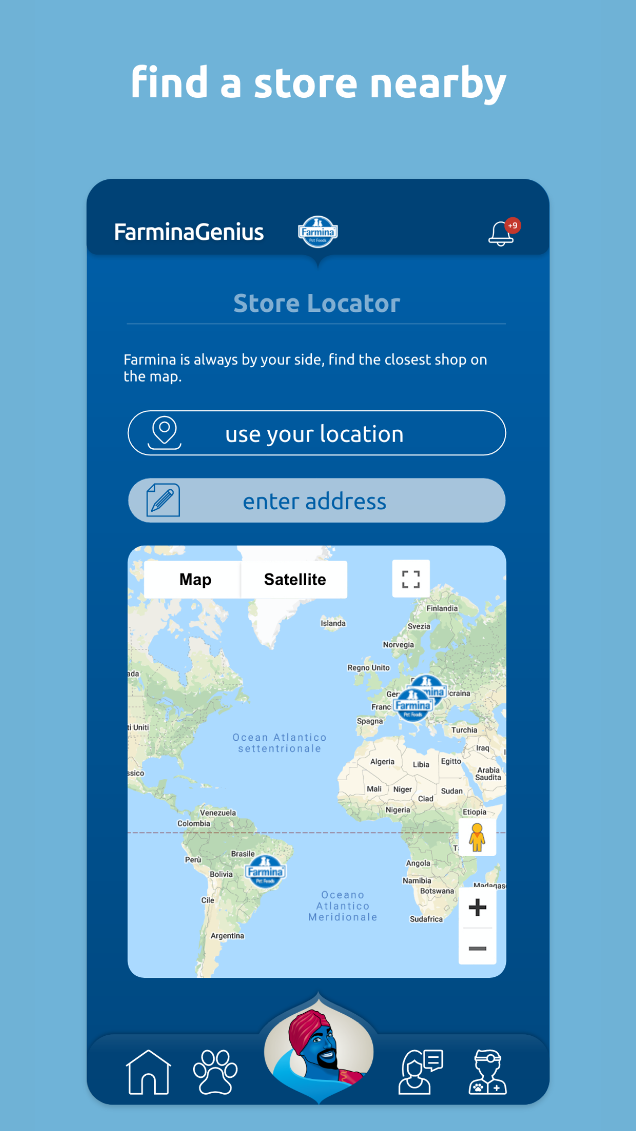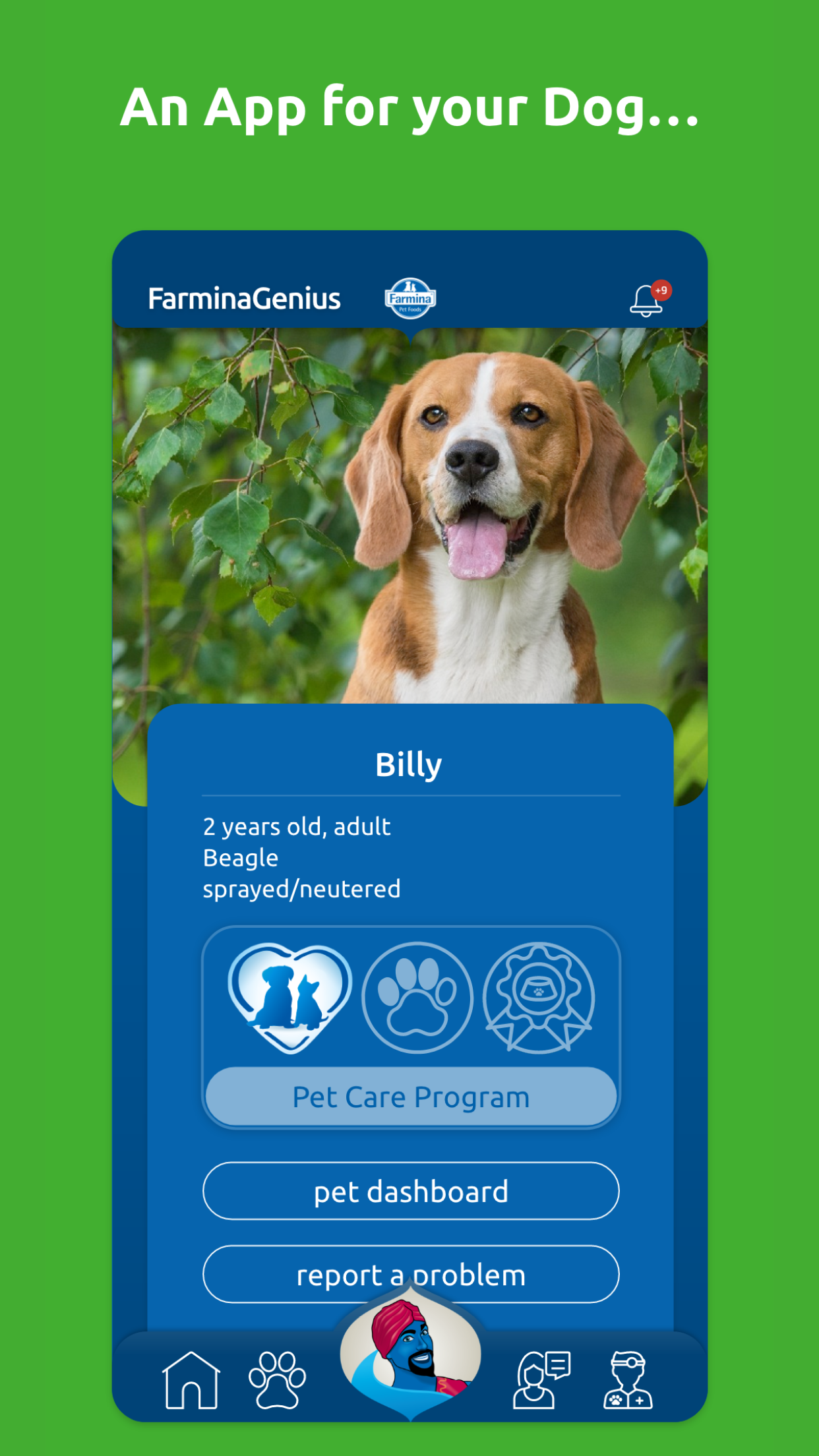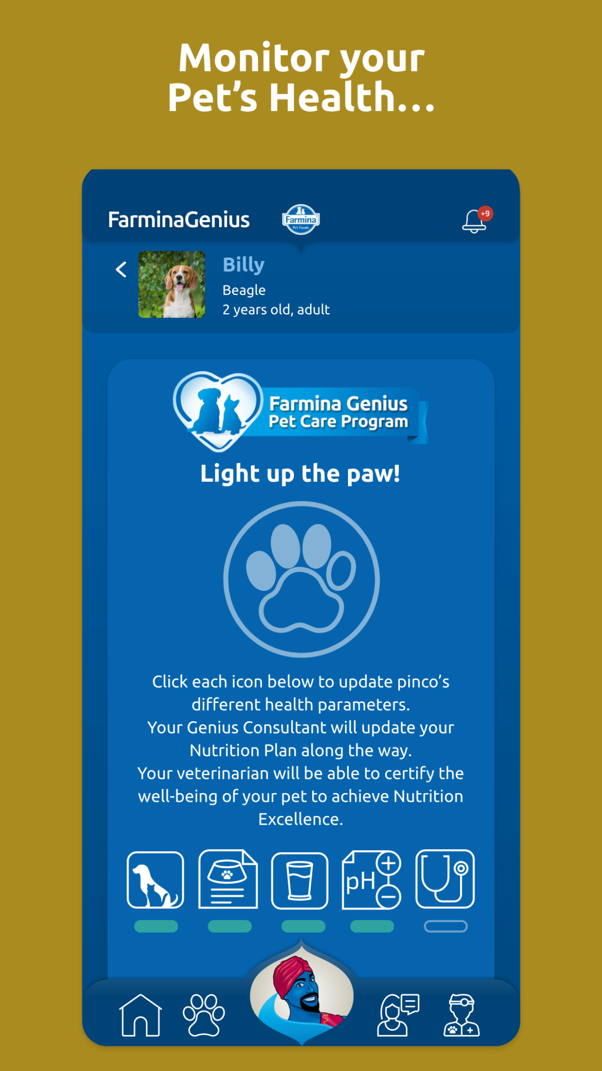 Who is the Farmina Genius? The Farmina Genius is the genie who will always be by your side to help you manage the well-being of your four-legged family members. Unlike your typical lamp genie, there is no limit to how many wishes can be made! Your pets require attention and care, but love is not enough to make up for proper health management and sometimes serious mistakes are made due to too much love (for example, a pet could be over-fed). Thanks to the Farmina Genius Pet Health Coach's competent support, you can receive expert guidance when it comes to the overall Health Management of your beloved pets with a personalized approach. By downloading the FREE Farmina Genius App, you can register your pets in the Pet Care Program. The Genius Pet Health Coach, in collaboration with a trusted Vet, will guide your pet through a 5-step wellness plan that will help provide for a healthier and longer life! " "The Five Key Indicators Through extensive collaborations between our internal Vet Research team and several major universities, these are five pieces of information you need to monitor. These parameters establish a clear prevention program that provides real-time data to your Genius Pet Health Coach and your Vet, who will be able to intervene if necessary." "1 – Body Condition Score Reaching the target weight, in other words the correct Body Condition Score, allows you to support your pet during every stage of life. Not only will you be able determine the need for any weight loss treatments , but you will also be able to prevent related pathologies such as obesity, joint problems, cardiovascular diseases, reproductive system complications or fat deposits." "2 – Dynamic Nutrition Plan A tailor made nutritional plan is the basis for maintaining a healthy pet. Thanks to our coaching service, you will be provided a dynamic nutritional plan. Why is it dynamic? Because it evolves with any changes in your pet’s health, habits, and environment: your pet’s life changes could require a change in its nutrition and through this app you are going to get the necessary info needed to maintain the proper rationing." "3 – Water Intake Tracking the average amount of water that your pet is drinking is critical: is your pet drinking enough? Or are they drinking too much? Any change may indicate the onset of pathologies like diabetes, kidney or thyroid disease. With the app’s support, you will make sure to find out and tackle these issues as soon as possible." "4 – Urinary pH With a simple clinical exam you will decrease your pet’s risk of kidney stones and lower urinary infections. Your Vet and your Genius Pet Health Coach can guide you!" "5 – Health Check Last but not least, the FarminaGenius App lists all the basic exams that must be done with the help of your Veterinarian in order to detect any “unwanted guests” or developing diseases. In addition to all the fundamental vaccinations that help to prevent many pathologies." "Download the FarminaGenius App! With a Personal Genius Pet Health Coach and your Vet, we will help you monitor the five key health parameters and help your pet lead a happy and healthy life. Register for the Pet Care Program completely free of charge in under 3 minutes: 1. Download the FarminaGenius App 2. Register your pet’s health data 3. Contact your personal Genius Pet Health Coach There are only three minutes between you and your pet’s health and happiness!" "More perks for you! -A personal coaching service via chat/mail/phone, forever -One click reporting service for any pathologies or issues that may arise -A tailored and dynamic nutritional plan -Vaccination reminders -Reminders for Vet appointments Pets are unique, just as their nutrition should be. Now thanks to the FarminaGenius App they can have their own personal nutritional plan! Download the FarminaGenius App now!