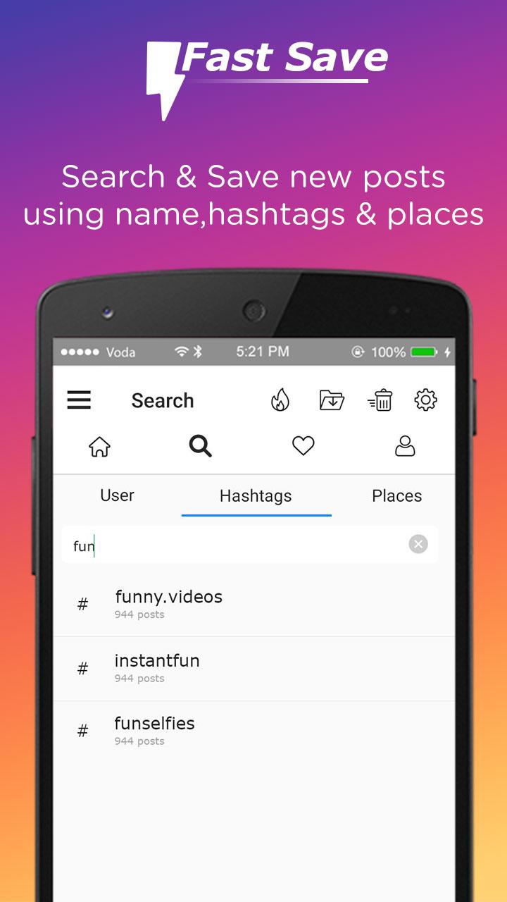Discover and save: Search for your favorite posts by Username, Hashtags and Places and save them in your phone to repost with this quick saver app.