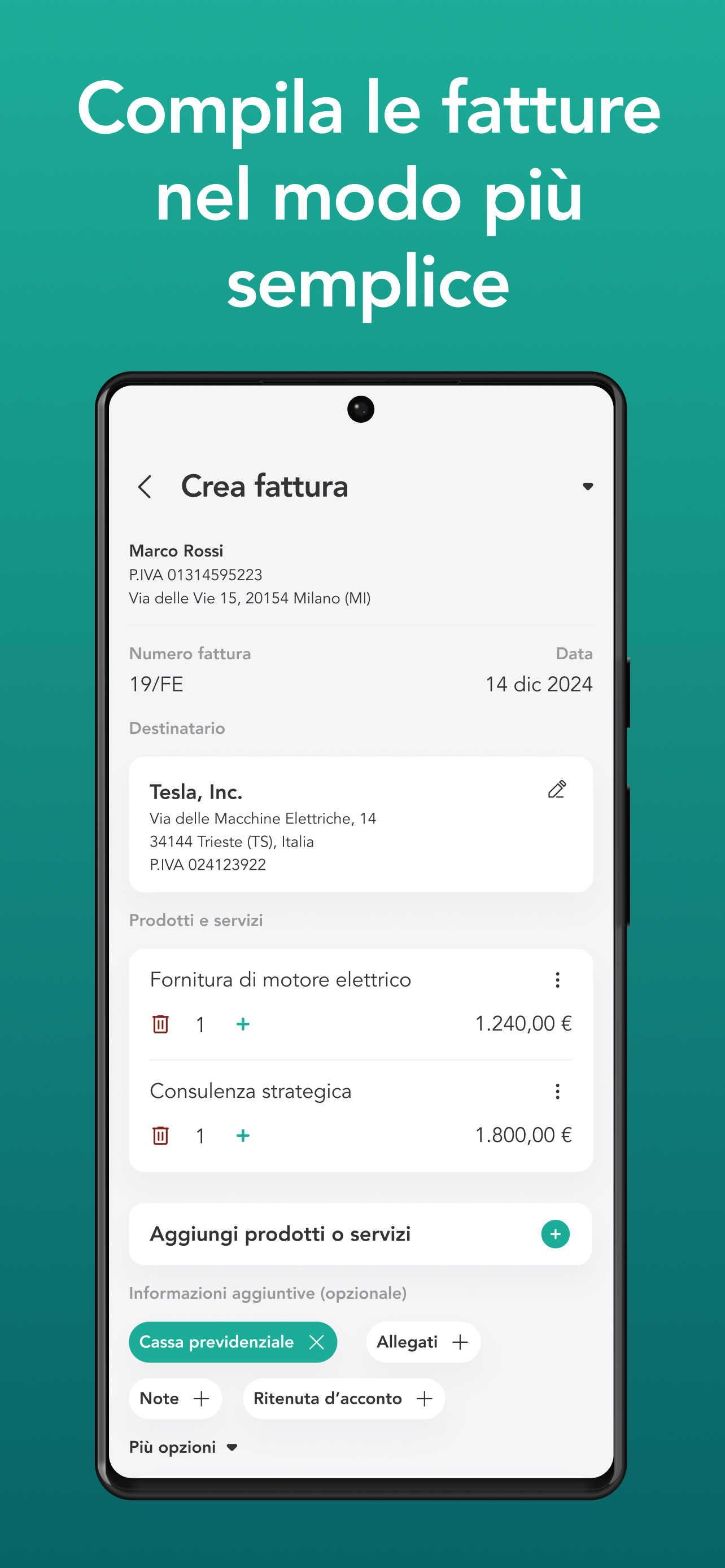 Send, receive and store electronic invoices in compliance with the simplest app out there! Create and send compliant electronic invoices Manage your invoices from one place Storage included for 10 years as per legislation Simplified compilation, forget codes and bureaucracy Assistance via chat, email and telephone always included and free Unlimited bills Recipient code included Send to Public Administrations, Companies or individuals Sending invoices via e-mail to your customers No digital signature, no certified e-mail Receive email notifications whenever you receive an invoice Log in with your FatturaElettronica APP account and find out how easy it is. A few numbers: 62,000 companies have already chosen FatturaElettronica APP to manage their business, and more than 8 million invoices have passed through our systems. Find out more on invoiceelettronica-app.it!