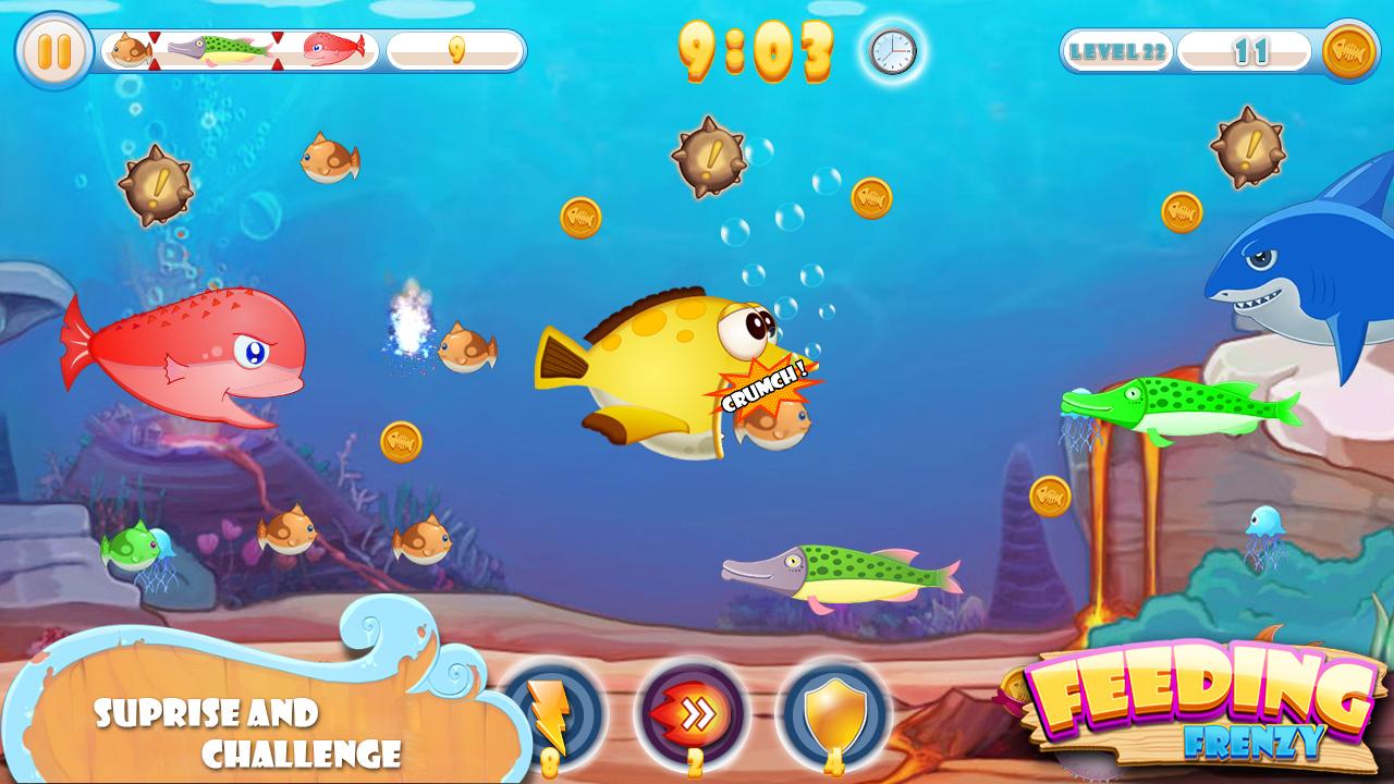Feeding Frenzy is an eat or get eaten action game for Windows PCs. If the "Finding Nemo" film is on your favorites shelf, you already have a hint that you'll probably enjoy the graphics and objectives to this light-hearted video game. But unlike happy fish, all fishes in the Game are trying to eat you and a fishy ocean through your perilous journey. This is not a fishing game (game fishing) about bass fishing but it about fishes eating each other. Become a hunter, kill or be killed. Hunt other small fishes. The red button indicate danger. Just like in Feeding Frenzy 2, the goal is to overcome the Shark King. To do this, you have to face off against a variety of different red sea creatures. You are always a hungry fish. Your only weapon is your stomach and the sky's the limit as to what you can eat. Just be careful not to chomp on something harmful or end up getting eaten yourself. Don't come near bigger fishes's diameter or you will get eaten. Become the big gold fish and eat all the small fishes. In Feeding Frenzy, it's definitely survival of the fittest. Feeding Frenzy's Deluxe version features cartoon-like graphics that children will enjoy but some experienced gamers might find a bit juvenile for their tastes. The game isn't particularly challenging but it is amusing to see your character get increasingly large as you move through the later levels. Since there's very little violence present in Feeding Frenzy, it's a great option for younger children or people who prefer not to deal with gory scenes during their forays into PC games. Feeding Frenzy is a simple game that'll keep kids entertained but can't hold a candle to games with better graphics and more challenging gameplay. There are also a lot of chests in this Game contain different collectable. In Feeding Frenzy, players control a hungry marine predator intent on munching as many other fish as possible. Your one and only job is eat fish, yes, eat all other fishes. During your fish adventure through the course of the game's 40 levels, you will switch off between 5 marine animals. The last level is where you attempt to dethrone a large shark, the "Shark King", using Orville the Orca. The player takes on the role of different aquatic species each trying to move up the food chain. As smaller fish are eaten, the player's own fish grows in size and becomes capable of eating somewhat larger fish. By the end of each level, the fish is sufficiently large enough that it can eat almost anything on-screen. Players must be vigilant for hazards which include depth charges, larger predators, naval mines, radiation-poisoned fish, and jellyfish.If the player eats a sufficiently large number of fish in a short period of time, a score-enhancing Feeding Frenzy is initiated. If the player continues to rapidly consume other fish, a further Double Frenzy can be achieved. These both end when a short period of time without further rapid consumption elapses. The full game includes both a normal mode and a "time attack" mode. Feeding Frenzy will bring you satisfaction and finest experiences that you will never forget.