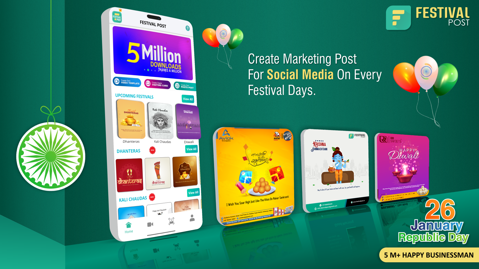 26 January Poster Maker, Festival Post is #1 Festival Poster Maker App. Republic Day Poster Maker, 26 January Poster 2026 & Indian Republic Day Poster. Being No. 1 Indian Festival Poster Maker App, Festival Post offers unique Indian 26 January Banner Maker Online, Poster & Video Maker creative designs via Indian Festival Poster Maker with Photo, Name & Image in all major Indian languages including Hindi, Marathi, Gujarati, Tamil, Telugu, Bengali, Punjabi, and Kannada. Festival Post includes Festival Poster Maker 2026 for all upcoming National & International Days. Festival Poster Maker has ready-to-use designs for Election Banner, Political Posters, Digital Card, Intro Video Maker, etc. Festival Post offers unique Indian Festival Flyer Maker Online, Posters & Videos with Status & Story. Create a short video status with Festival Poster Maker with Name and Image. How to Use “Festival Post - Festival Poster Maker With Photo And Name” Signup in Festival Poster Maker App, Add details, choose Category to Create Post & Choose Festival Poster Maker Frame or Video, Save your Festival Post in Gallery. Create unique festival posters with this intuitive app, offering a library of pre-made templates for customization. Add text, images, logos, colors, and upload your own designs or choose from a wide range of available designs. Happy New Year Maker Sankranti Republic Day Maha Shivratri Holi Gudi Padwa/Ugadi Ramadan Ram Navami Mahavir Jayanti Akshaya Tritiya Bakri Id Moharrum Ashadhi Bij Independent Day Raksha Bandhan Krishna Janmashtami Ganesh Chaturthi Gandhi Jaynati Dussehra Diwali Merry Christmas When is Republic Day 2026 in India ? Republic Day 2026 are celebrating on 26th January, 2026 in India. When to design Republic Day 2026 Poster in India ? Get 26 January Poster Maker app right now on your phone because republic day is just about to corner. we will share here a very amazing Republic Day Poster to celebrate India’s biggest day. Here available 26th January Banner includes Indian Dancing Woman, National Costume, Flag Pattern, Ashoka Chakra, Tricolor, etc. Use this Tricolor 26 January Poster to promote your business and brand. Creating a Poster of Happy Republic Day is very easy and handy nowadays. Republic Day Poster Maker 2026 You can create social media graphics and videos in minutes with the Republic Day Poster Maker app. Send Warm Wishes on Ganatantra Diwas to your business clients, colleagues, friends, and family. This is the best Happy Republic Day Poster Maker app to create which allows you to make colorful posters of your choice. Vasant Panchami Poster Maker Vasant Panchami is a major Hindu festival that celebrates the goddess Saraswati. Make your own Vasant Panchami Poster with our easy-to-use readymade frame. Happy Vasant Panchami Poster Maker Template to send wishes to all. Make a unique poster that celebrates Vasant Panchami 2026 Poster! फेस्टिवल पोस्टर मेकर ऍप के द्वारा भारतीय गणतंत्र दिवस पोस्टर मेकर, 26 जनवरी पोस्टर मेकर, गणतंत्र दिवस पोस्टर बनाये और हार्दिक शुभकामनाएं भेंजे| गणतंत्र दिवस फोटो फ्रेम 2026, गणतंत्र दिवस वीडियो डाउनलोड, 26 जनवरी स्टेटस और बैनर बनाएं| Poster Maker with Festival template layout is for forthcoming days Vasant Panchmi, Indian Army Day, Maha Shivratri etc. with Festival Post App. Festival Poster Maker is a simple app with powerful features to help you create posters in minutes. Customize Republic Day Post Maker with business info. Uttarayan Banner & Makar Sankranti Banner Background in full hd quality. Sign up, add company details, create posts or videos, and enjoy the customizable layout with stylish fonts & color text. Festival Status Video Editing option is also available here. Call us on “9979044449” for more details.