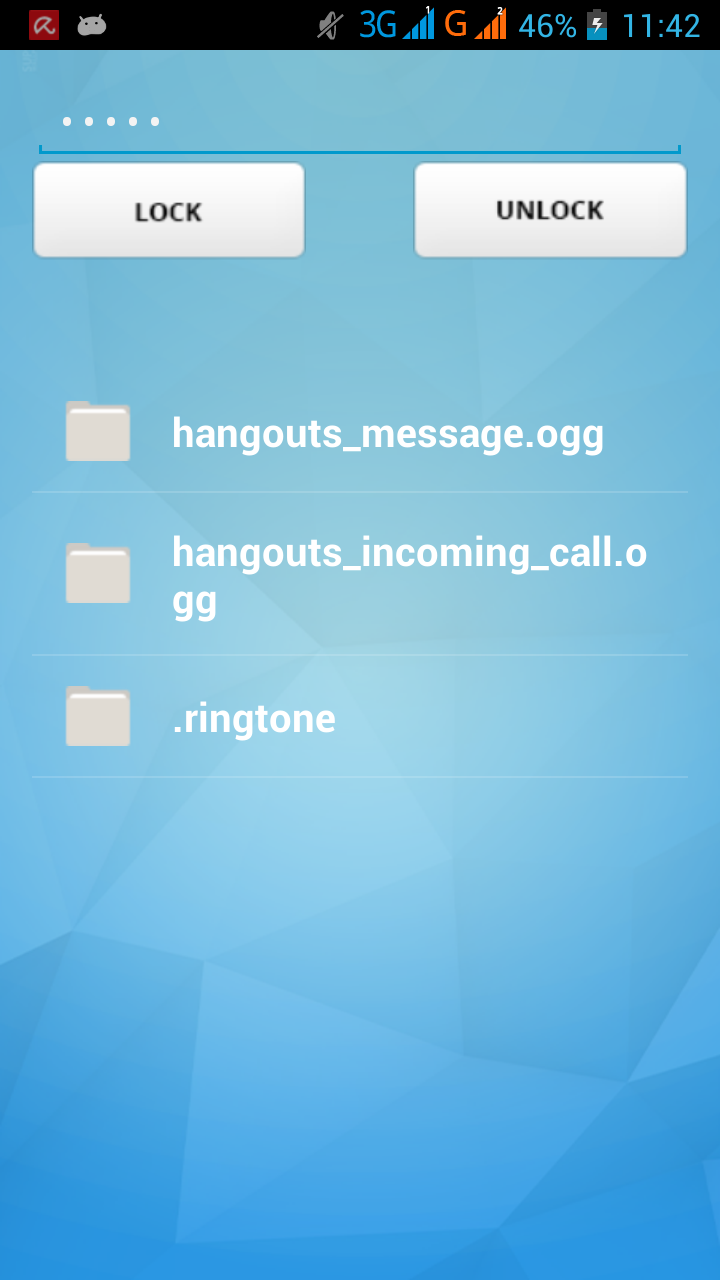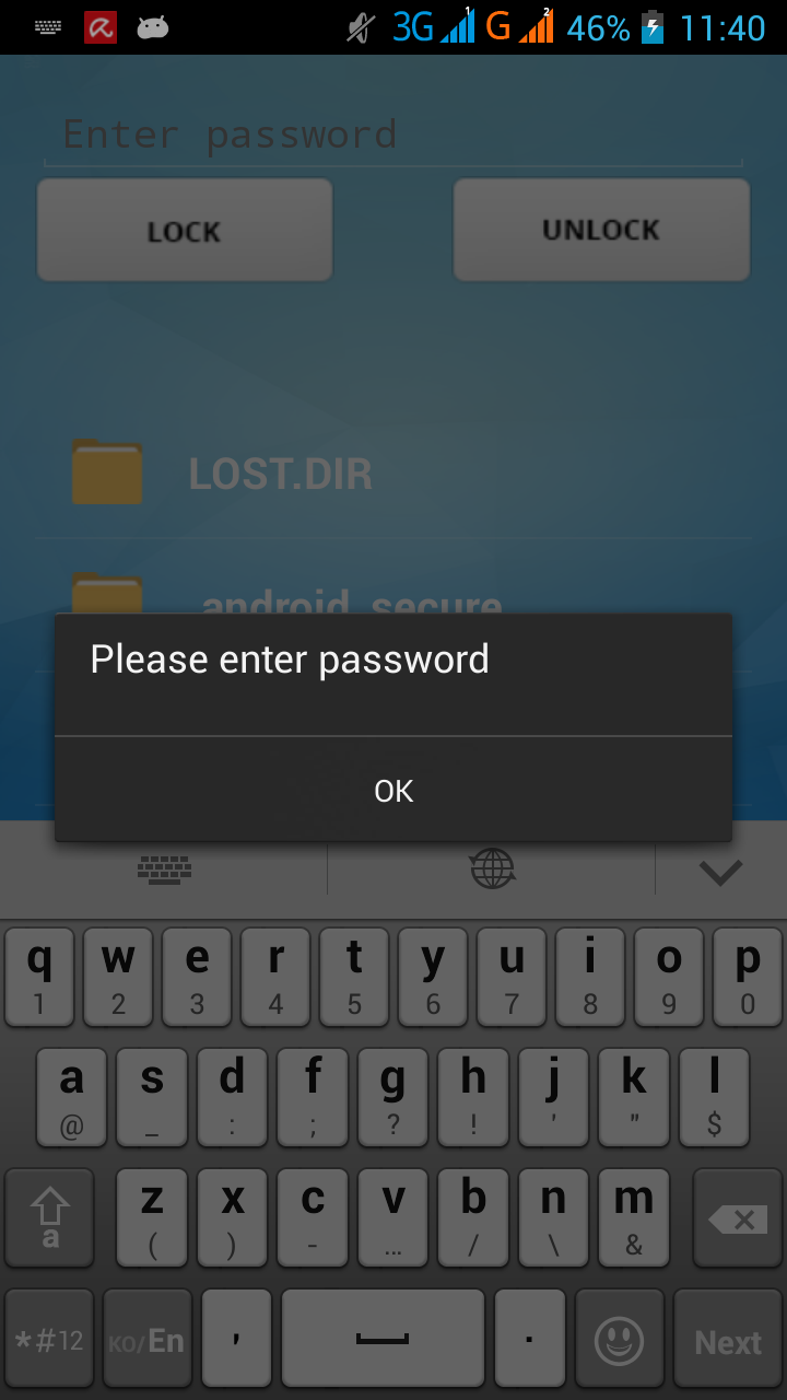 This application is useful to protect the files from unauthenticated users. If anybody wants to access your secret files or you want to hide those files, then by this app you can achieve your goal. To protect the desired file, just select that files, enter password and lock that file. To unlock that file you have to enter the password and unlock that file. All the files will be shown in list where you can easily find and select the file and protect it by your password. You can any time you can unlock it by applying same password. Main Features: * Easy Interface and HD Graphics * Password Protected * Smart looking through directories for documents, locked and unlocked files. *Opens documents directly from app. * Notifies about forgotten unlocked files, which were left by user. *Free to download and enjoy Import files from: * Gallery * SD Cards * Secure Browser Folder Lock provides security to your data, mainly when you share your mobile with somebody else and you want to hide some personal information. Parents and kids are our best reviewers. If you have a moment, feel free to rate and review our app.