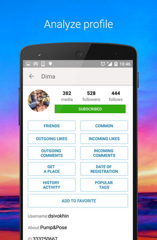The application uses the open method of social network Instagram. Therefore, all information obtained by legal means.