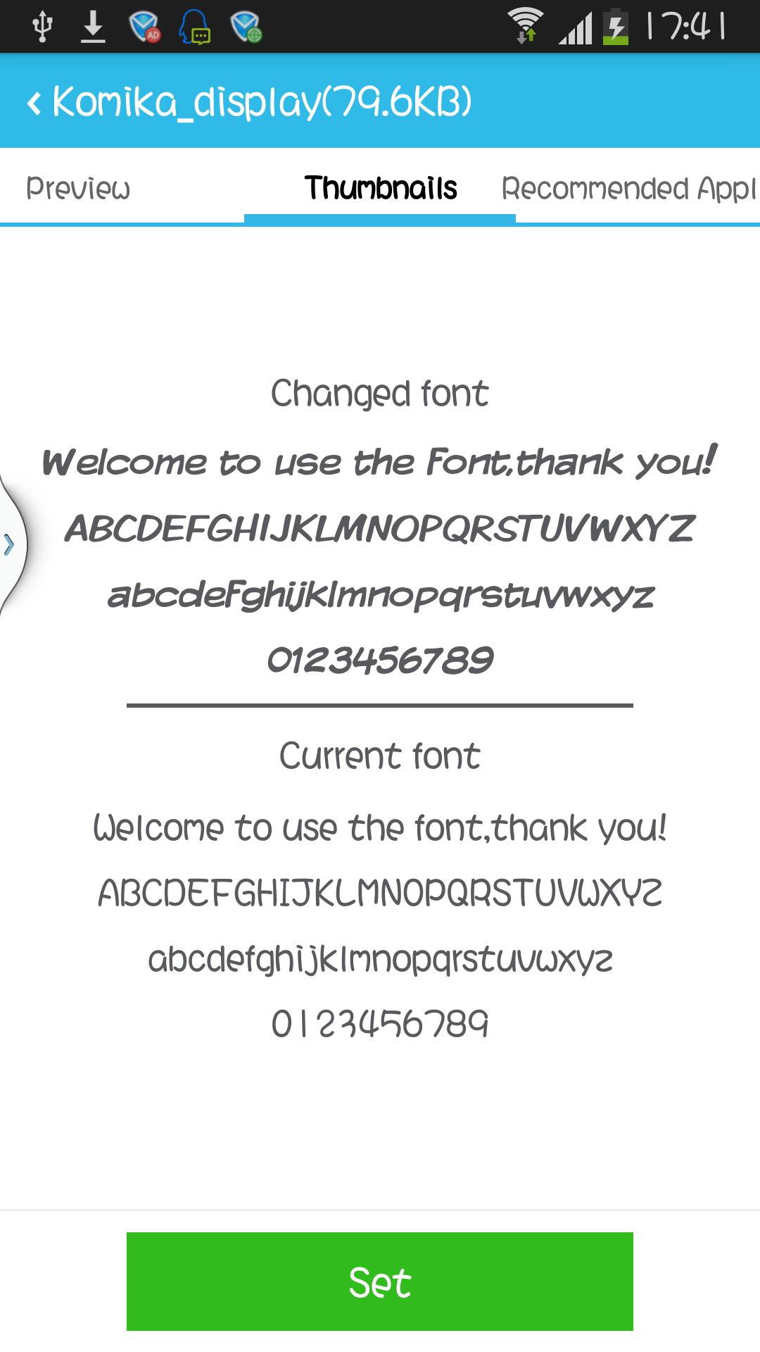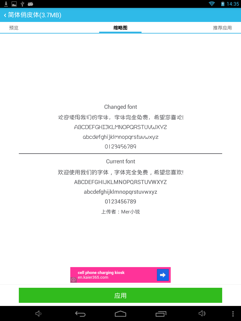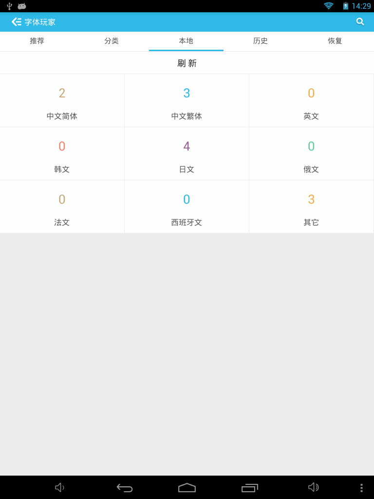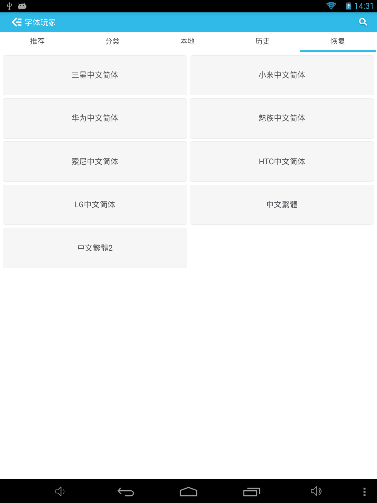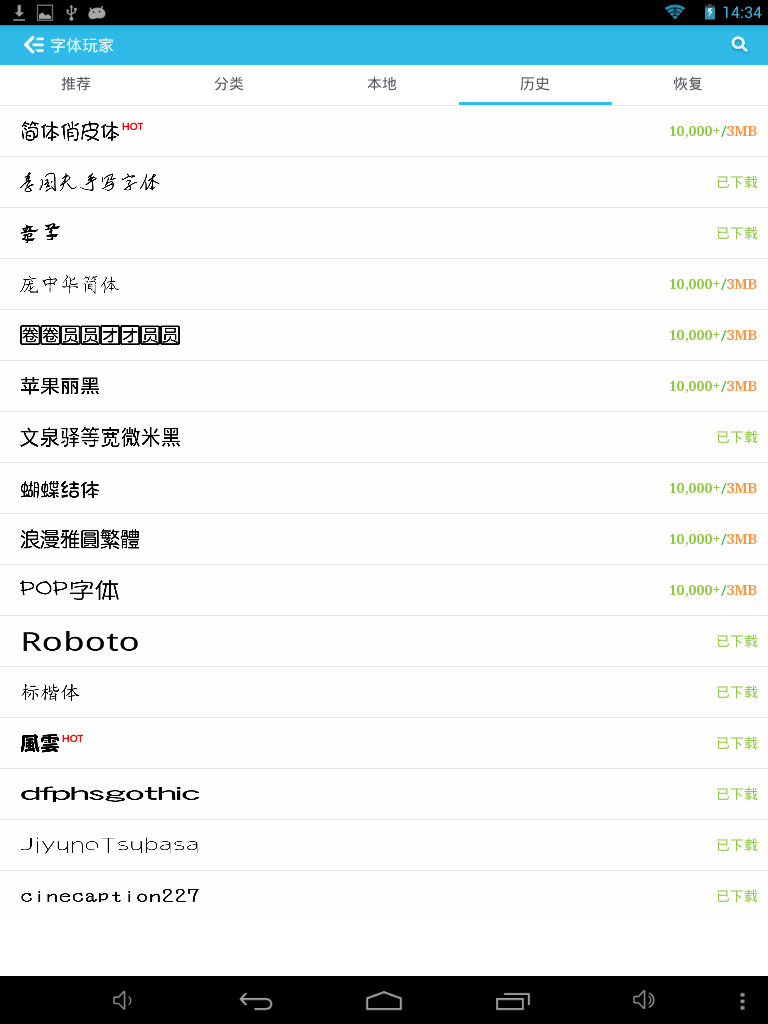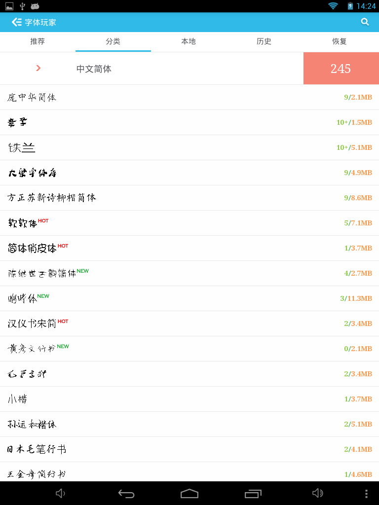 3/9 1.Fixed the bug,Restore the font,Some softwares fonts will disappear. 2 Fixed font decompression error 3 Fixed screen missing bug 3/8 1.fix some download bug. 2.The program has been optimized to reduce the size of the memory usage。 2/25 New Feature: 1.Support restore factory font; 2.Support Select download path; 3.Support clear the cache garbage; 4.Support the use of tablet; 5.Support no Sd Card Status. Bug: 1.Downloads error; 2.Under certain circumstances font download error;