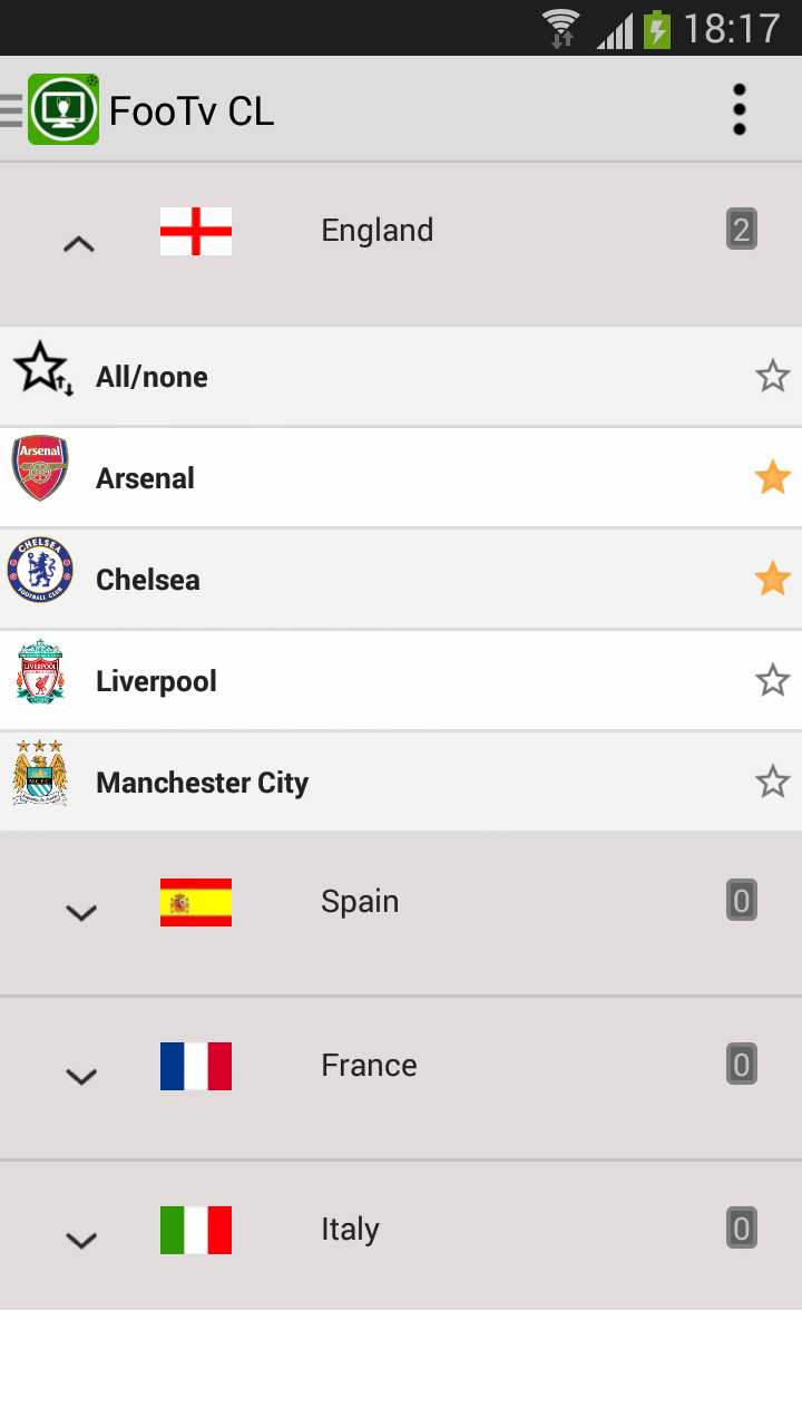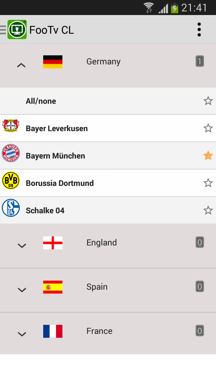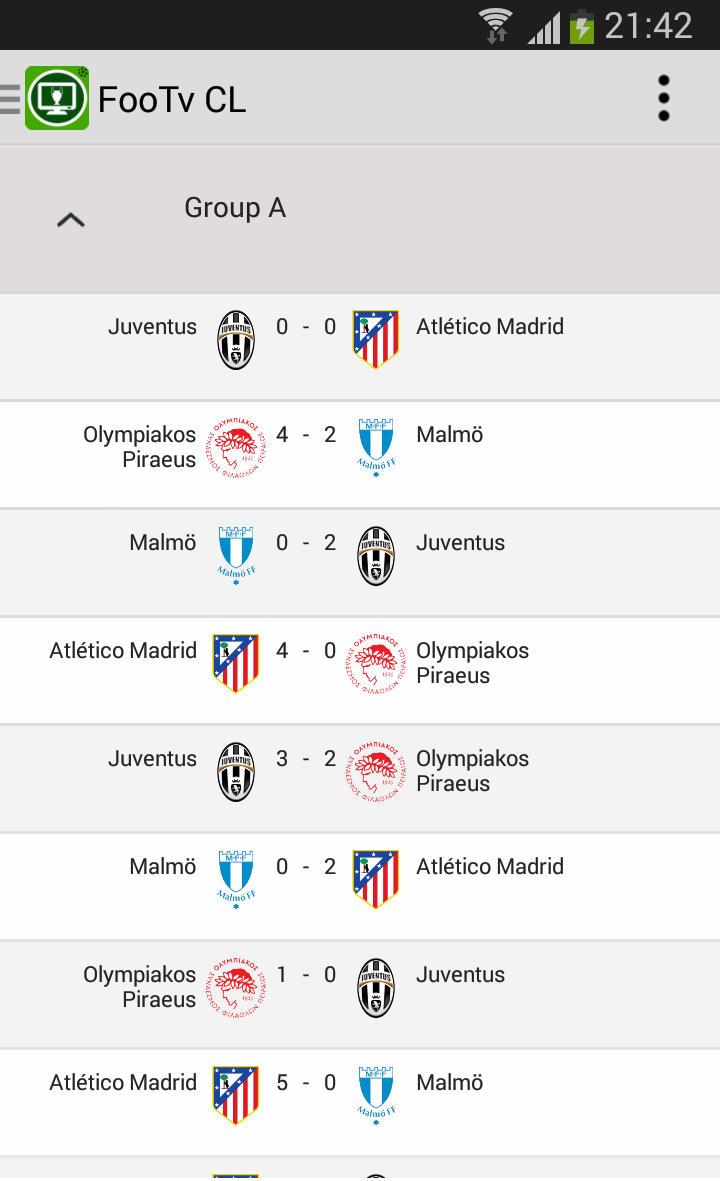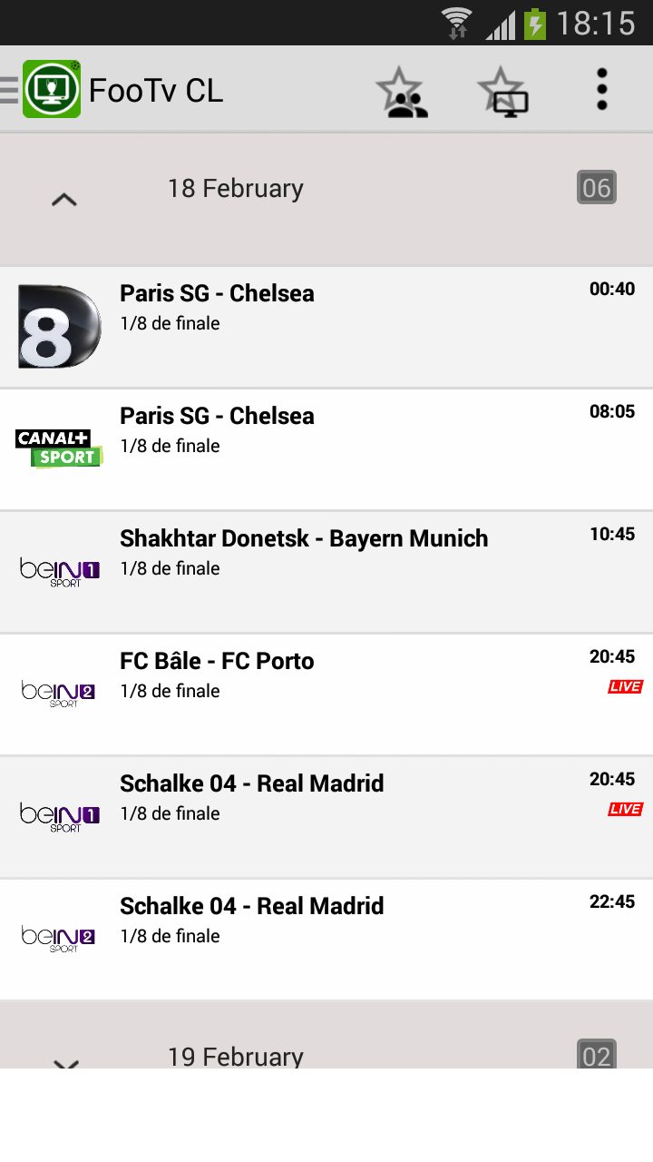 With FooTv CL, get the TV Champions League TV schedule in a nice and user friendly interface. Advantages of our football TV schedule : - the schedule allows users to get all the Champions League match day after day, - get quickly all the live match thanks to the "Live" logo, - you can filter the TV schedule with your favorite teams (Bayern Munich, Schalke 04, Leverkusen, PSG, Monaco, Milan, Arsenal, Chelsea, Barcelone, Real Madrid, FC Porto, CSKA Moscou, ...) - you can filter the TV schedule with your favorite channels (TF1, Canal +, Canal + Sport, Canal + Décalé, BeIn Sports 1, BeIn Sports 2, BeIn Sports Max, ect ...), - NEW : get the last Champions League news !, - NEW : get the standing, - NEW : get the results of each match, Do not miss match on football Champions League and now follow news and results with fooTv CL. Follow Chelsea, Arsenal, Manchester City, Manchester United, Barcelone, Real Madrid, Milan AC, Inter Milan, Bayern, Munich and do not miss their TV broadcastings. With your filters, you can see quickly your week Champions League schedule. For now, only french TV are displayed. -= NEW =- Follow us onTwitter : @devncow