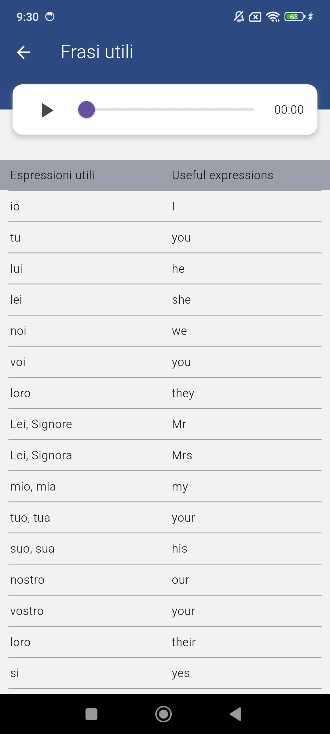 The most essential words and phrases of the language, each with native speaker audio. Perfect travel app! All audio is downloaded to the device and accessible even in airplane mode or without expensive international roaming fees.