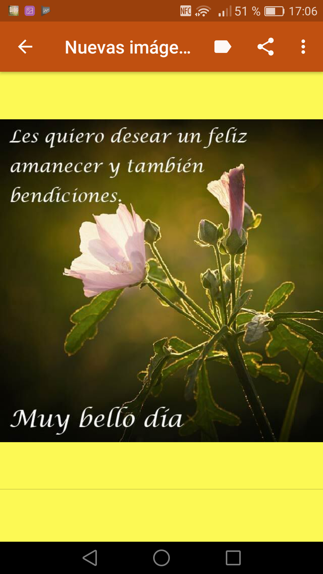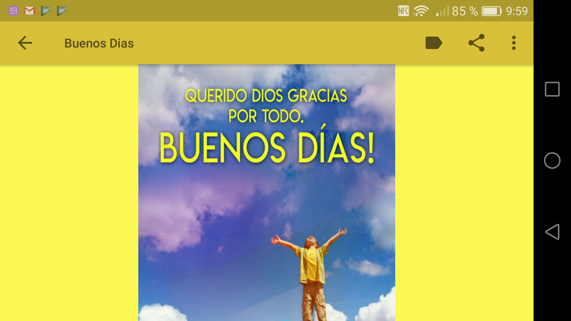 ¿ Te gusta compartir bellas frases cristianas con imagenes de Buenos Dias con tu amor, tus amigos y seres queridos ? ¿ Quieres sorprender con saludos de Buenos Dias para una amiga o amigo y demostrarle lo mucho que le importas? Despertar y desear un bonito día de la mejor manera es algo que a todos los católicos nos gusta, compartir unos saludos con bendiciones de Dios y unas imágenes muy bonitas es algo que nos hace muy felices. Con estos mensajes cristianos de buenos días puedes saludar a tus hermanos de la iglesia que se encuentran en un grupo de WhatsApp, y desearle muchas bendiciones de parte de Dios, que tengan un día lleno de bendiciones. Muchos de nuestros amigos ya conocen esta aplicación de Amor y Amistad que hemos creado con mucho cariño y sentimiento para TI amig@ Los mensajes de Buenos Dias cristianos verdaderos, los que se proclaman con el corazón y la fe en todo su esplendor , siempre tendrán un efecto positivo en nuestras vidas. Frases cortas de Buenos Dias para compartir con amigos, imágenes sencillas pero con buenos mensajes cristianos para enviar a las personas que quieres deseando un buen dia que empieza. Descarga ya mismo esta aplicación ideal para dar las Buenos Dias y disfruta enviando tarjetas de amistad, frases de amor y mensajes cristianos de Buenos Dias . Demuestrales lo mucho que quieres a tus amigos, ellos sabrán valorar estas imagenes de bendiciones de Dios y frases deseando Buenos Dias amor o Buenos Dias amigos. Las personas que reciben estas frases cristianas de Buenos Dias se sienten queridas, nunca olvidadas y seguro que les animarás y sacarás una hermosa sonrisa aún cuando se dio mal el día. Estas frases de Buenos Dias con imagenes también te servirán como fondos de pantalla o wallpapers, ideales para compartir en las redes sociales, en esta app encontrarás frases hermosas cristianas para whatsapp. En esta aplicación gratuita hemos utilizado imagenes de dominio público, no obstante si alguna imagen tuviera derechos de autor hazlo saber para retirarla de inmediato, queremos ser honestos y cumplir con las normas. Muchas gracias por tu valoración positiva, si no te gusta algo de esta aplicación envianos tu opinión con un email antes de darnos un comentario negativo. Queremos mejorar y darte las aplicaciones que estés buscando. Ayúdanos a seguir creando aplicaciones gratuitas para TI. Cumplimos con el Reglamento General de Protección de Datos (GDPR) de la Unión Europea (UE), que entró en vigencia el 25 de mayo de 2018 - Puedes descargar las imagenes con la opción establecer imagen como... y sin hacer más las tendrás ya en tu galería - Puedes compartir las imagenes por el medio que tengas instalado, facebook, whatsapp, email, etc. - Puedes usar las imagenes como fondo de perfil y como fondo de pantalla Por último darte las gracias por tu descarga, muchísimas gracias amiga o amigo desde el lugar del mundo donde te encuentres, un fuerte abrazo ! ¡Buenos Dias Dios os bendiga! P.D: Dedicamos esta aplicación "Frases Cristianas de Buenos Dias" a todas las personas que descargan nuestras apps gratuitas para compartir y dedicar. Buenos Dias DIOS MIO, a ti te debo todo lo que he logrado, y no me canso de agradecerte una y otra vez..