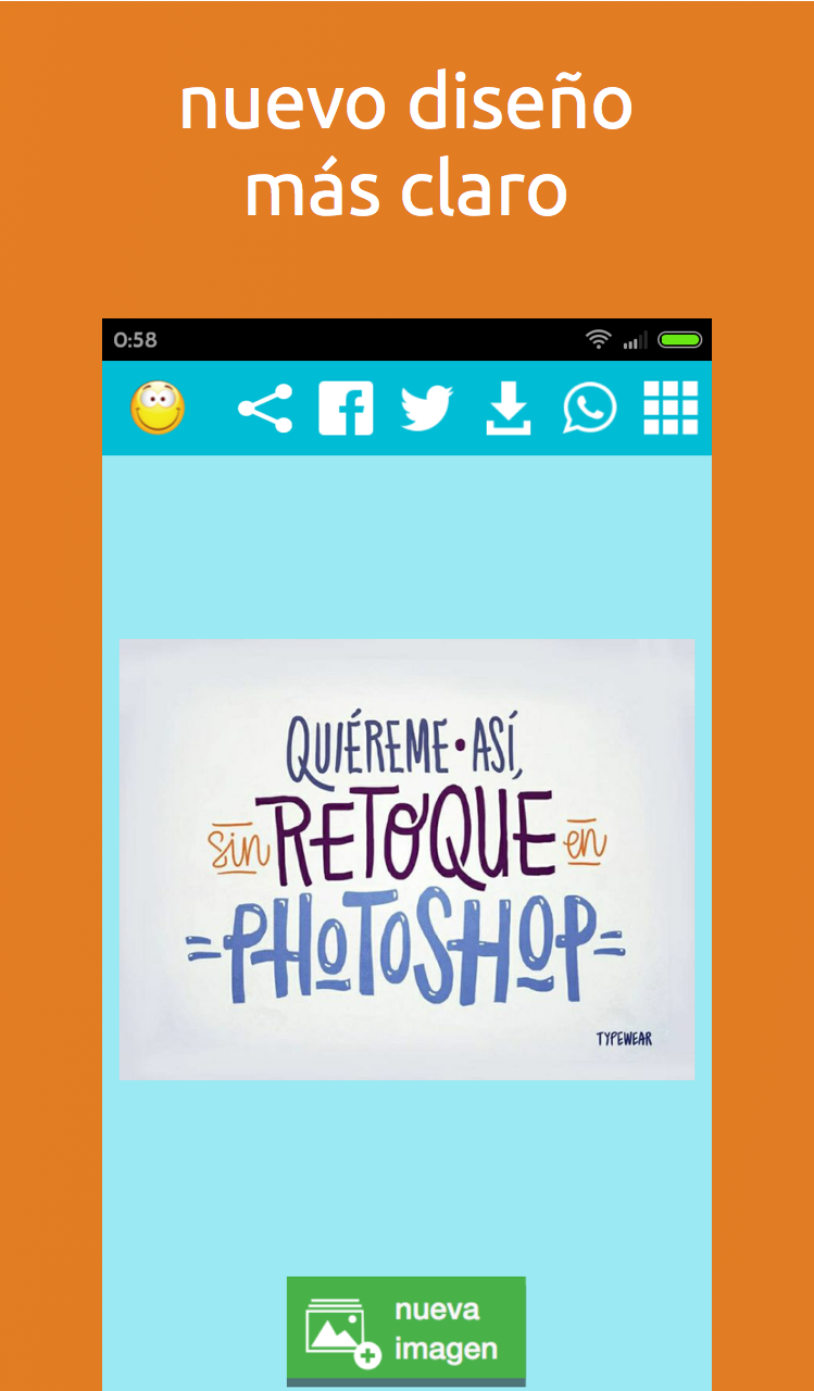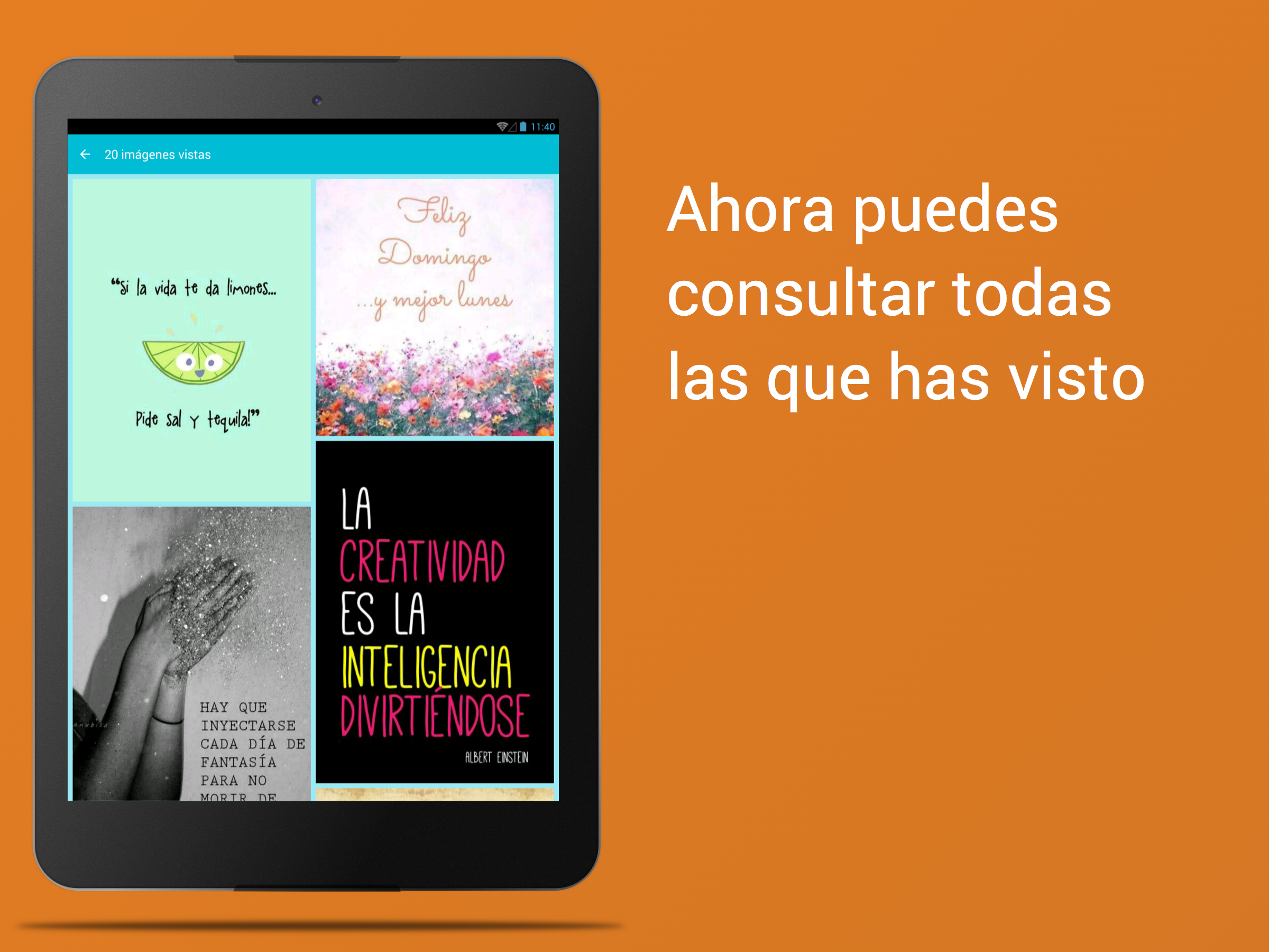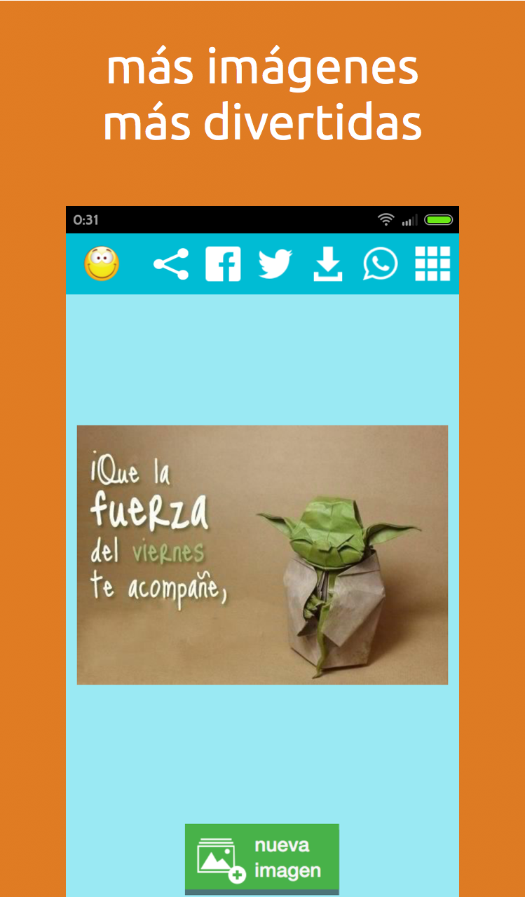 ¿Quieres descargar imágenes y frases graciosas, divertidas y chistosas? ¿Te gustan las frases motivadoras y positivas? ¿Y las citas de famosos? A todos nos gusta ... Instálate la aplicación y te ofreceremos imágenes con frases para alegrarte la mañana. Tenemos más de 2000 imágenes para ti, que podrás compartir con tus amigos en redes sociales como Facebook, Twitter, Instagram, WhatsApp o guardarlas en tu dispositivo … y todos los días imágenes diferentes! Y lo mejor de todo gratis para siempre!! En nuestra base de datos tenemos imágenes con: - Frases Divertidas, Chistosas, Graciosas, Ocurrentes, de Humor, Alegres . - Imágenes para fechas Especiales como San Valentin, Verano, Primavera, Día de la Madre, Día del Padre, Día de la Marmota, etc. - Frases Románticas, de Amor, de Desamor. - Imágenes bonus sobre ese día en especial. - Frases especiales de Lunes, Viernes, Sábado, Domingo, etc. - Frases imágenes motivadoras, optimistas, positivas. - Citas de famosos y celebridades. ¿A que es fácil? No tienes excusa. Pon una sonrisa en tu cara, que es gratis!!!!