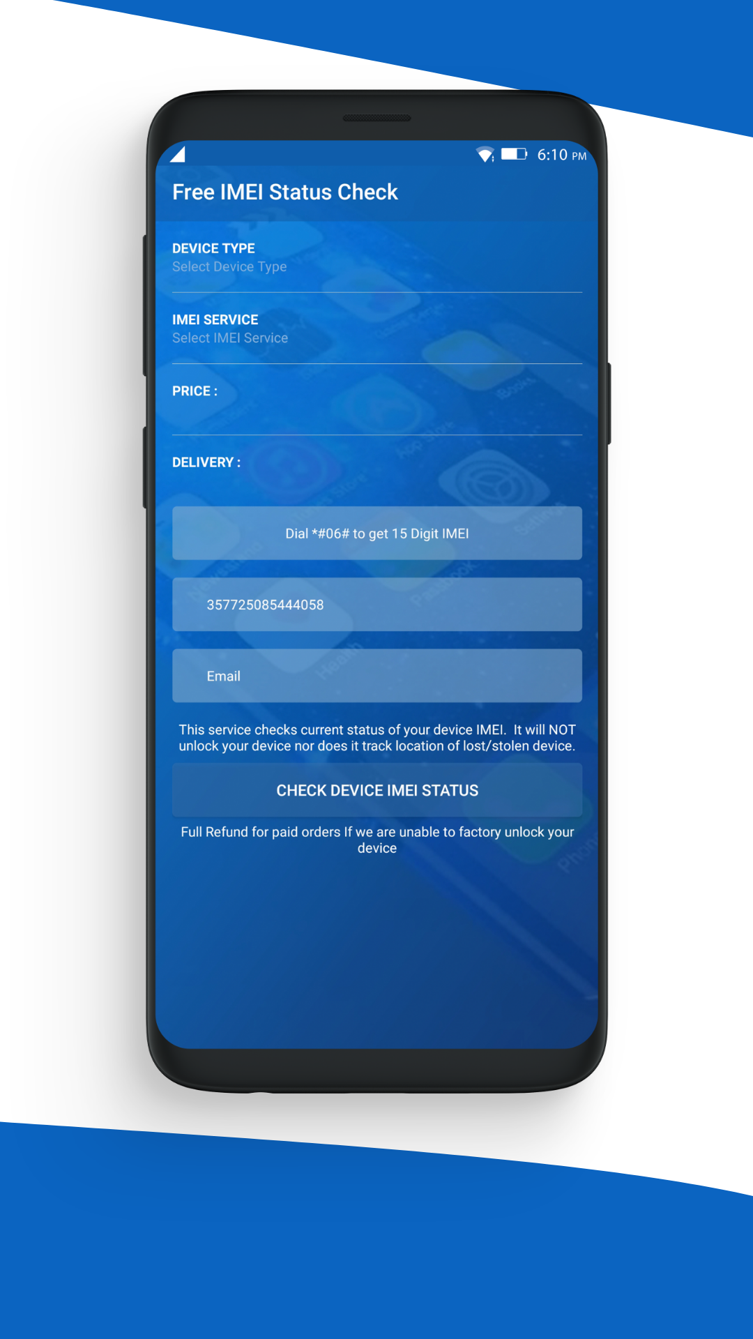 Phone IMEI (International Mobile Equipment Identity) is a 15-digit unique number which is used by a GSM network to identify valid devices and provide specific services to such mobile phones. To check IMEI and get the 15 digit number you can either take a look at the box of your phone or simply dial (*#06#) on your Android or iOS device. Once you find your device ID IMEI you can learn so many things about your device, including SIM unlock status, when it was purchased, in which country it was purchased, the network status and a lot more. You can also run an IMEI blacklist check test and find out whether your phone is blocked in certain networks or not. So, if you are about to buy a new phone (iPhone or Android phones), and wondering whether it’s locked or not, it’s blocked in a GSM network and the seller is telling the truth, simply download this IMEI checker and analyzer app for, provide the requested data and wait for the device IMEI status to produce. How does this IMEI checker and analyzer work? Mobile IMEI Status Check comes with a clean and neat design and the interface is so user-friendly that you’ll get the whole idea after browsing through different menus for the first time. IMEI Unlocker and Check IMEI are the 2 main features of this device ID checker app and you just need to specify the device type, IMEI service, your device’s IMEI and leave the rest to the app. After a few minutes you’ll receive a thorough GSX report and IMEI analyze in your email or within the app. So, no matter you want to know about the origin of your phone (Android or iOS), the GSM network your device is locked in, Blacklist or blocked status of your phone, or IMEI unlocker status we’ve got you covered. Simply download this IMEI checker app, add the input data and get the report. Are the IMEI analyze and GSX report reliable? This IMEI analyzer is connected to more than 250 official databases and GSM networks all around the world, to make sure all the GSX reports (for iPhone devices) and device ID reports are accurate and reliable. To test the IMEI checker service, you can easily add the details of your own phone and check the report. What are supported manufacturers? We are always updating the list of supported manufacturers to make sure all Android and iPhone devices are covered by our IMEI unlocker and device ID IMEI services. Here is the list of the main manufacturers that we supports: • Samsung • LG • HTC • ZTE • Nokia • Motorola • Sony • iPhone - GSX Report (Others charge $5 to $10 for this) • iPhone - FMI Status (Find my iPhone report) • Huawei • Blackberry • Pantech • Other manufacturers You can always use the free IMEI checker feature to find out whether your device is supported or not. Mobile IMEI Status Check Main Features at a Glance: • Clean and neat design fresh and intuitive interface • 100% reliable IMEI checker report • IMEI blacklist check • Device and IMEI unlocker (both Android and iPhone devices on AT&T) • User 250+ official databases worldwide • sample reports for each IMEI check • Useful for buying and selling second hand phones So, IMEI Status Check delivers everything you should expect from such IMEI checker and analyzer apps and it even sets the bar to a higher level by offering free GSX reports for iPhone devices,unlocking services for devices under AT&T network as well as Blackberry and Pantech devices, IMEI blacklist check, and a lot more. Other than getting free IMEI check on your device within the app, you can also check the website (www.freesimunlocker.com) and get all the services from there. The live chat and 24/7 support make sure you can always reach out to experts and get answer for your questions and concerns regarding unlocking and related stuff. For more information, check out our website at: www.freesimunlocker.com