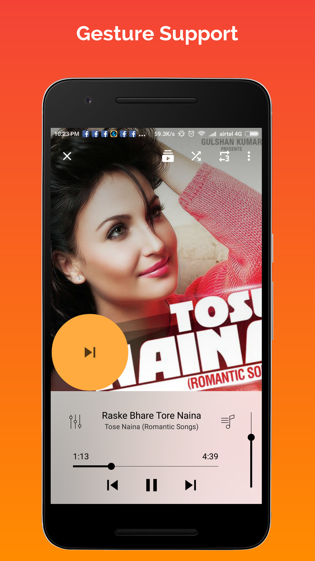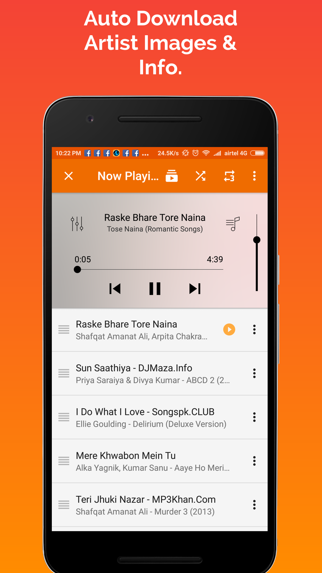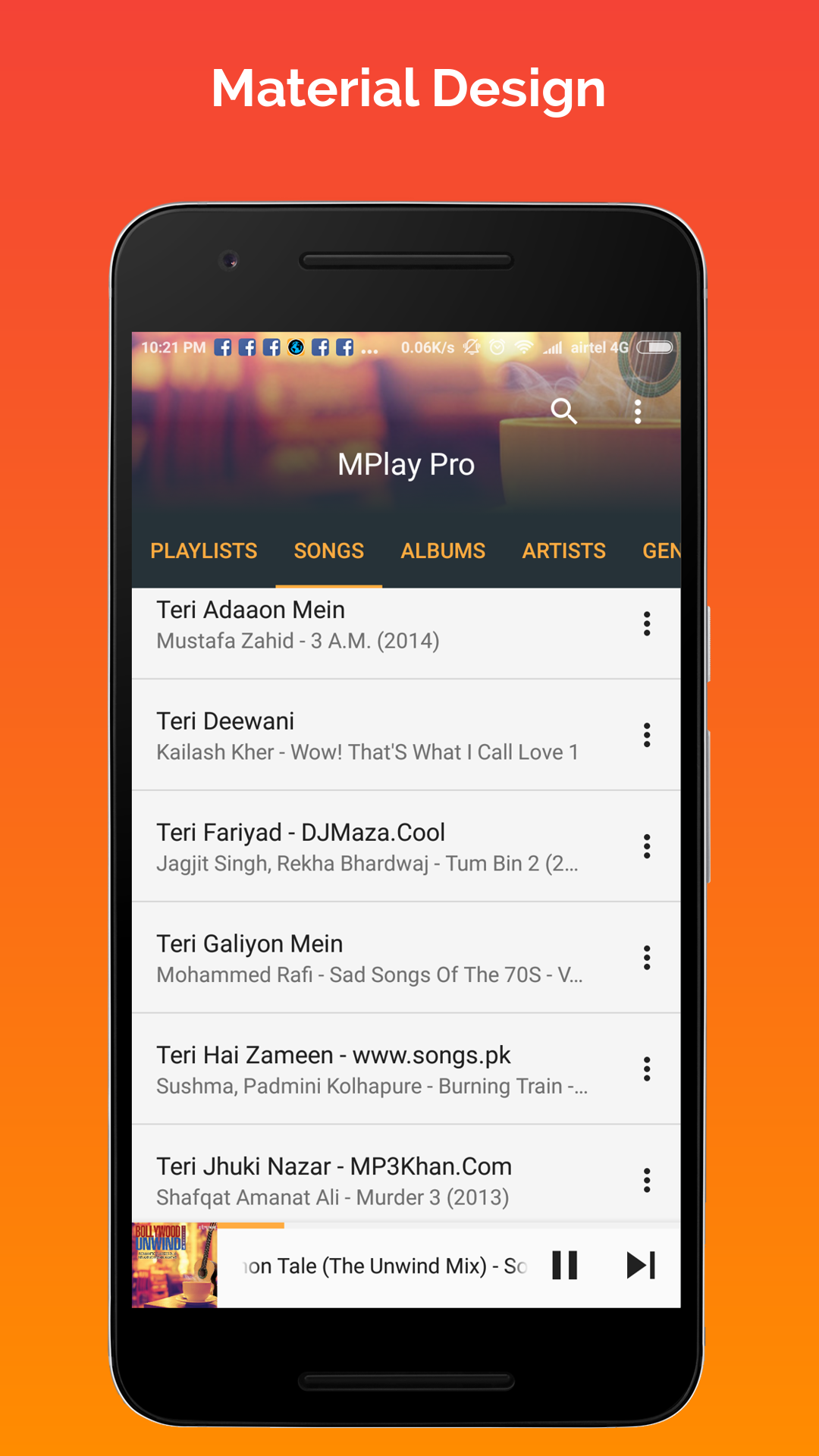 Listen to your favorite songs with the Most Beautiful & User-friendly music player. Music Player - MPlay is super stylish music and audio player app with most powerful features designed in very beautiful way. Its light weight, super fast & beautifully crafted with material design in mind for your perfect media player experience. Music Player with powerful equalizer, Quick search all music files, custom background skin, free to get this perfect audio player and media player. Its the best music and audio player and totally ad-free. KEY FEATURE: - Beautiful Customizable Now Playing Theme. - Customizable interface with multiple themes to choose from. - Supercool Sleep Timer. - Widget Control. - Watch video of now playing song on youtube directly . - Support all the most popular music file formats. - Browse and play your music by albums, artists, songs, playlists, folders. - Powerful equalizer.With pre-set music tone styles for your choice(Normal, Classic, Dance, Folk, Heavy, Hip hop, Jazz, Pop, Rock...) - Last.fm integration for retrieving artist images and descriptions - Smart Playlists with fully customizable rules - Custom Equalizers - Only music player with support panel. - Supports almost all audio file format. - Listening to .. status feature. - Only app with Multi Repeat Support. - Smart Play Queue - Easily accessible play queue . - Easily add tracks & drag up/down to sort playing queue. - Powerful search - Search quickly by track, artist and album. - Playlists - Fully playlist support & Build your own playlist on the go. - Party shuffle - Shuffle your tracks. - mPlay Album - Classic design view for album art in your player. - Notification control - Control track from notifications. - Easy navigation - Just one touch to navigate. - Quick access to currently playing songs allows for total control in a handy way. - Beautiful Transitions. - Regular Updates. - Headset support. - Easy SEARCH. Find all your local music files never been so easy. - Customize your Playlist. Upcoming Features : - Lyrics Support. - Folder Support. - Delete Option. This free mp3 player app allows you to play all music at the same screen. Unlike other music apps where you need to move back and forth to select a different song to play. Stay tuned, lot of great & most exciting features are in development. Will be updated in sooner. We listen to our users We are striving hard to make this audio player perfect for you. In any case,if you notice any bugs or crashes, kindly REPORT it by choosing Help & Feedback option within the app. We will definitely try to fix all the issues as soon as possible. If you want to comment give feedback or suggestions about this best music app, feel free to use our Help & Feedback option. We respond to every ticket generated by you. Thank you :) Lets join our hands to make it the best Music Player in the market ★★★★★ We Need Your Support, Do Rate Us 5 Stars ★★★★★ Its an humble request don't leave negative reviews for missing of few features/bugs.Updates will come frequently to make it more better.