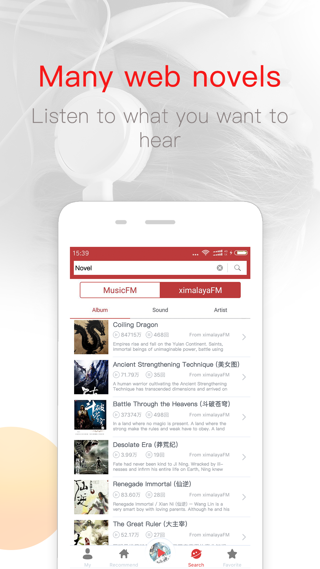 [characteristic] * Music,Chinese webnovel listen smoothly, * massive music, search your favorite, * Share albums and share your interests, * many classification, audio novels, comic storytelling, children's literature, foreign language learning, news, finance, health, funny scripts, radio drama, occupation skill and so on several types of massive high-definition audio reading resources. * the interface is simple and orderly structure of all the interface and operation is to listen to the design, no extra function, old people and children can quickly get started. * completely free, * album, artist, music, one key collection, [main function] * Song upload, * music search, * album search, * artist search, * single loop, sequential play, random play, a variety of play mode [announcement] The application can be supported by the network. The cost of the Internet should be paid by the customer. WIFI is recommended. For more details, please contact us.