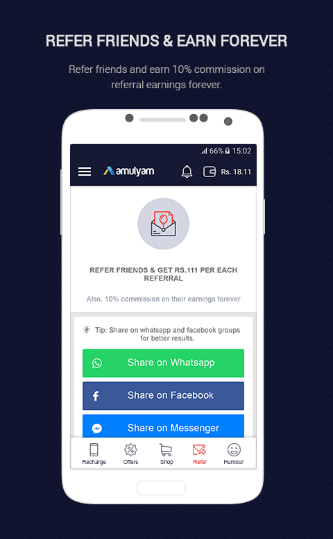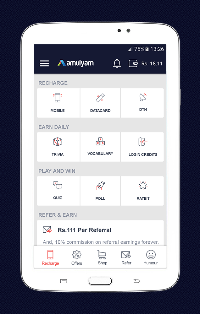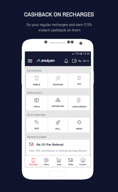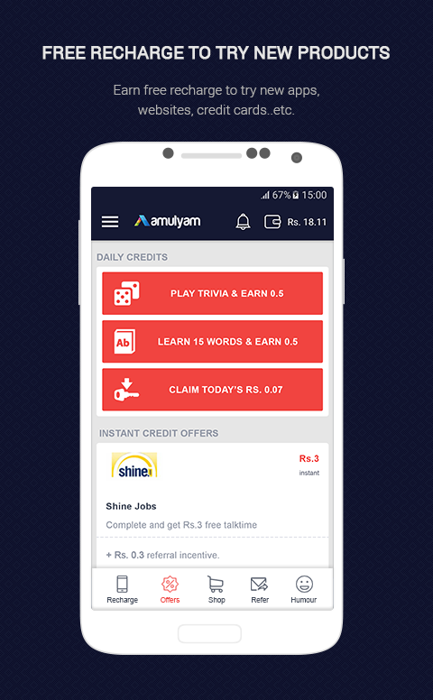*Already delivered free recharges worth of more than Rs.3 crore *Minimum recharge amount is Rs.10 for all operators in most circles Amulyam.in is India's first and exclusive website for free mobile recharge. In addition to the regular features on our website www.amulyam.in, with this app, our android users enjoy the extra benefits of getting free recharge quickly for installing apps. Complete offers or invite friends and when your account balance reaches a minimum of Rs.10, recharge any prepaid mobile for free. For any recharge related queries or missing credits, please send an email to [email protected]. Alternately, you can use feedback form in the app.