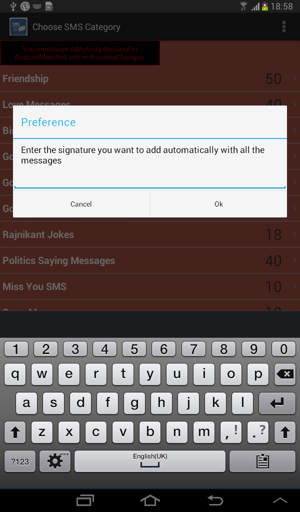 FREE FREE FREE First time ever in any app customize the message experience. And selects tons of free messages from the below categories:- Friendship, Love Messages, Birthday Messages, Good Evening Messages, Good Morning Messages, Good Night Messages, Rajnikant Jokes, Politics Saying Messages, Miss You SMS, Sorry Messages, Shayari SMS, Funny SMS, Saying - Qutoes SMS, Diwali SMS, Holi SMS, Sir Ravindra Jadeja Jokes.... and so on. It's endless Just customize your signature and we will append that for all the messages you selects and sends from this app. All this is never a fun before. Now all this is effortless and more important it's free of cost.